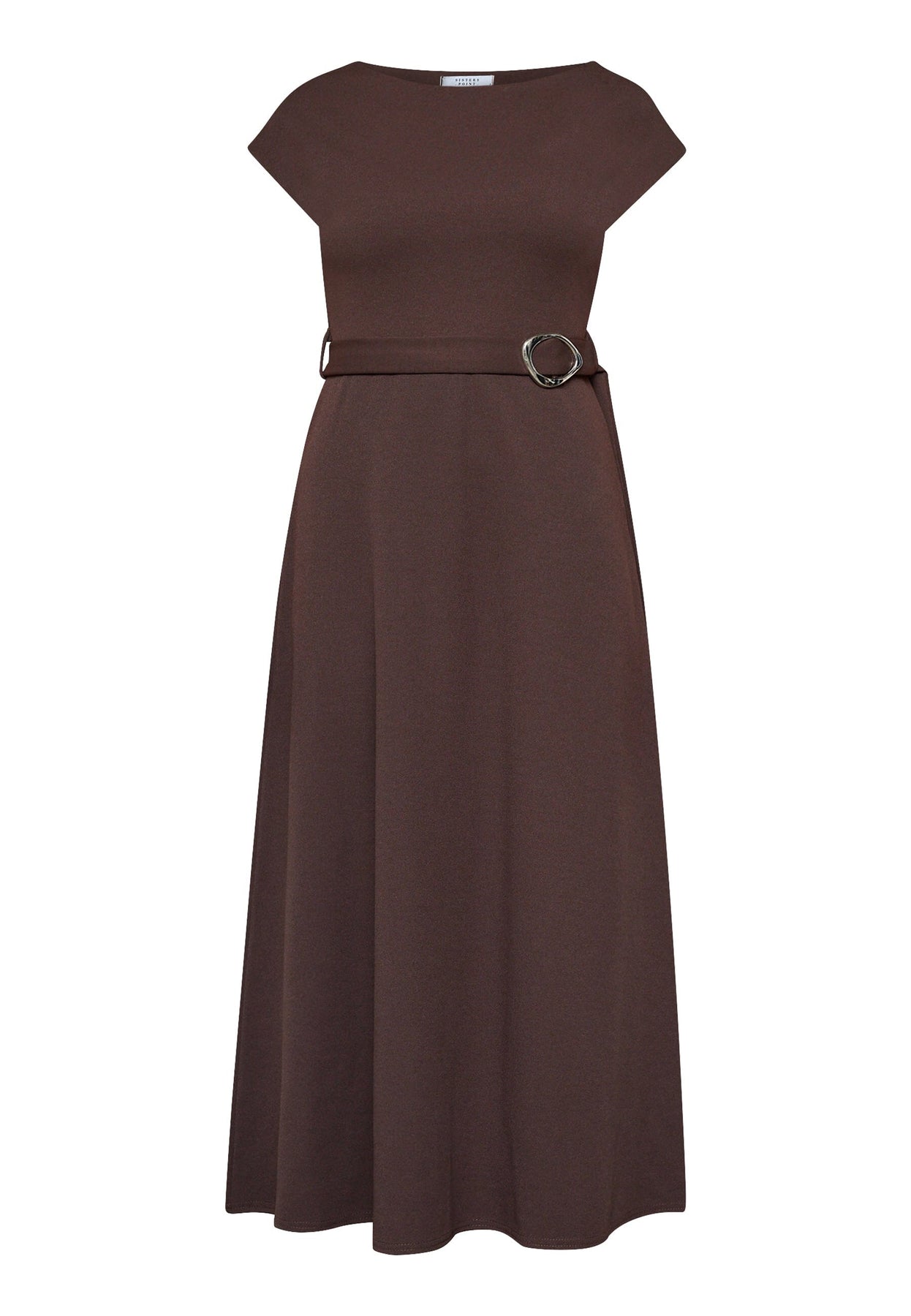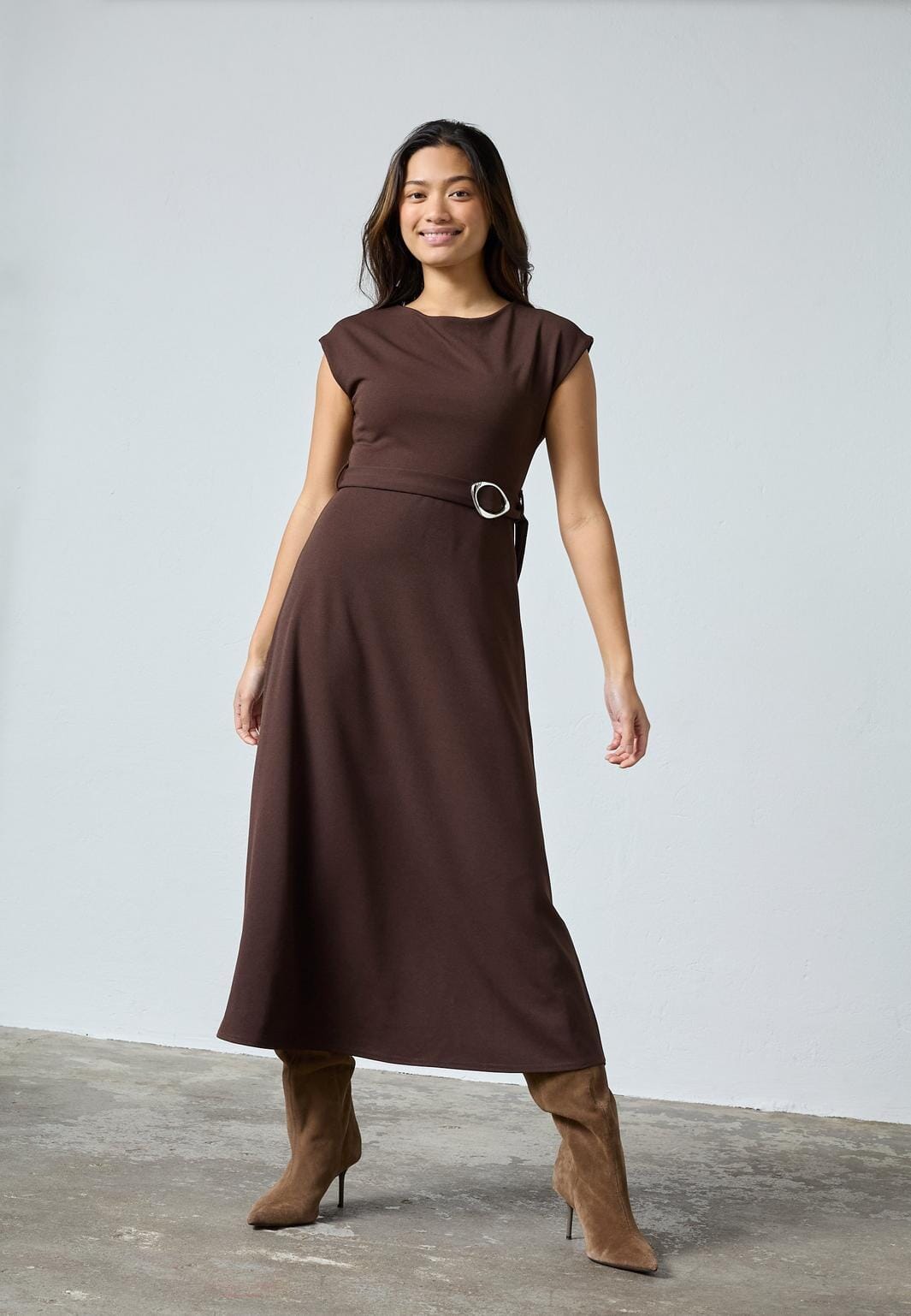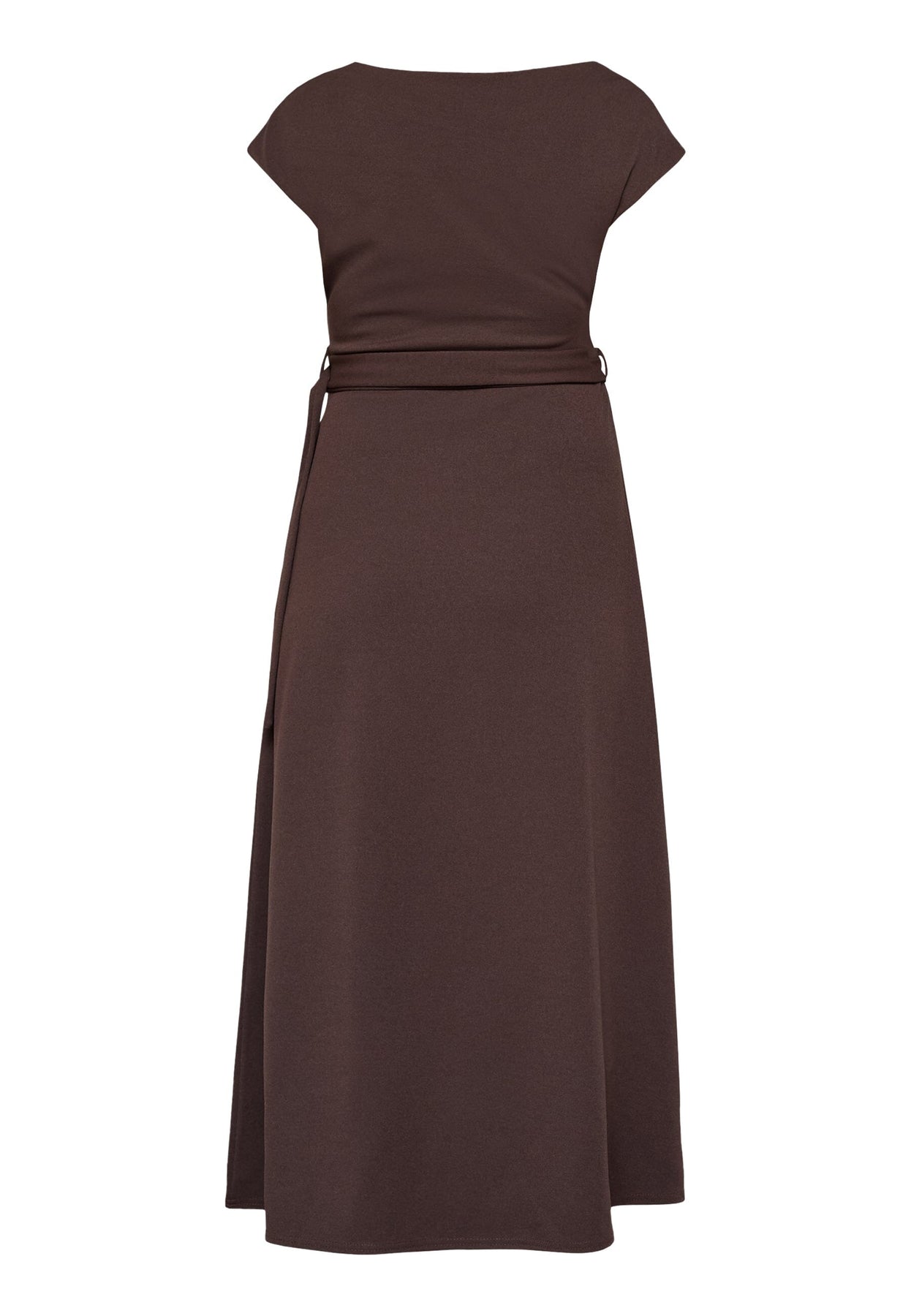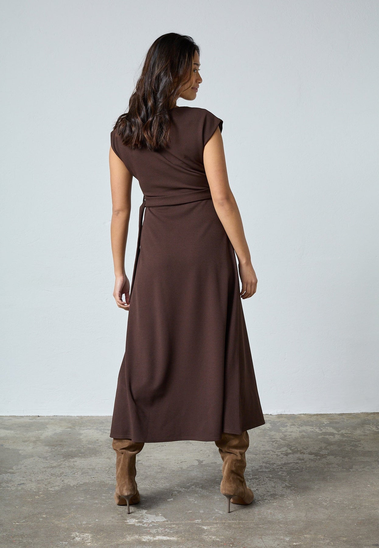 Mellomlang kjole fra Sisters Point i en dyp sjokoladebrun farge. Kjolen er laget av glatt polyester som faller tungt og gir en strukturert silhuett.