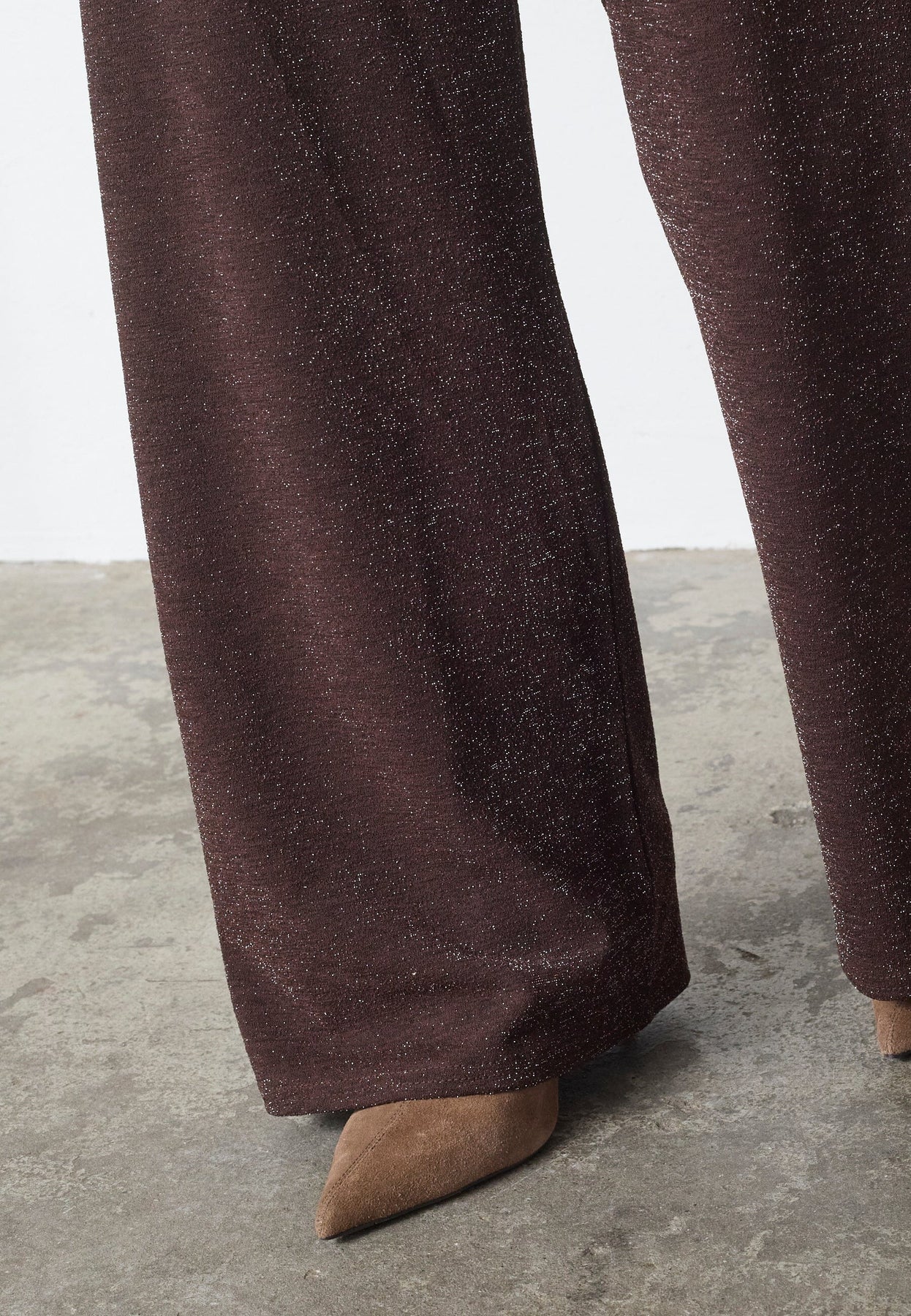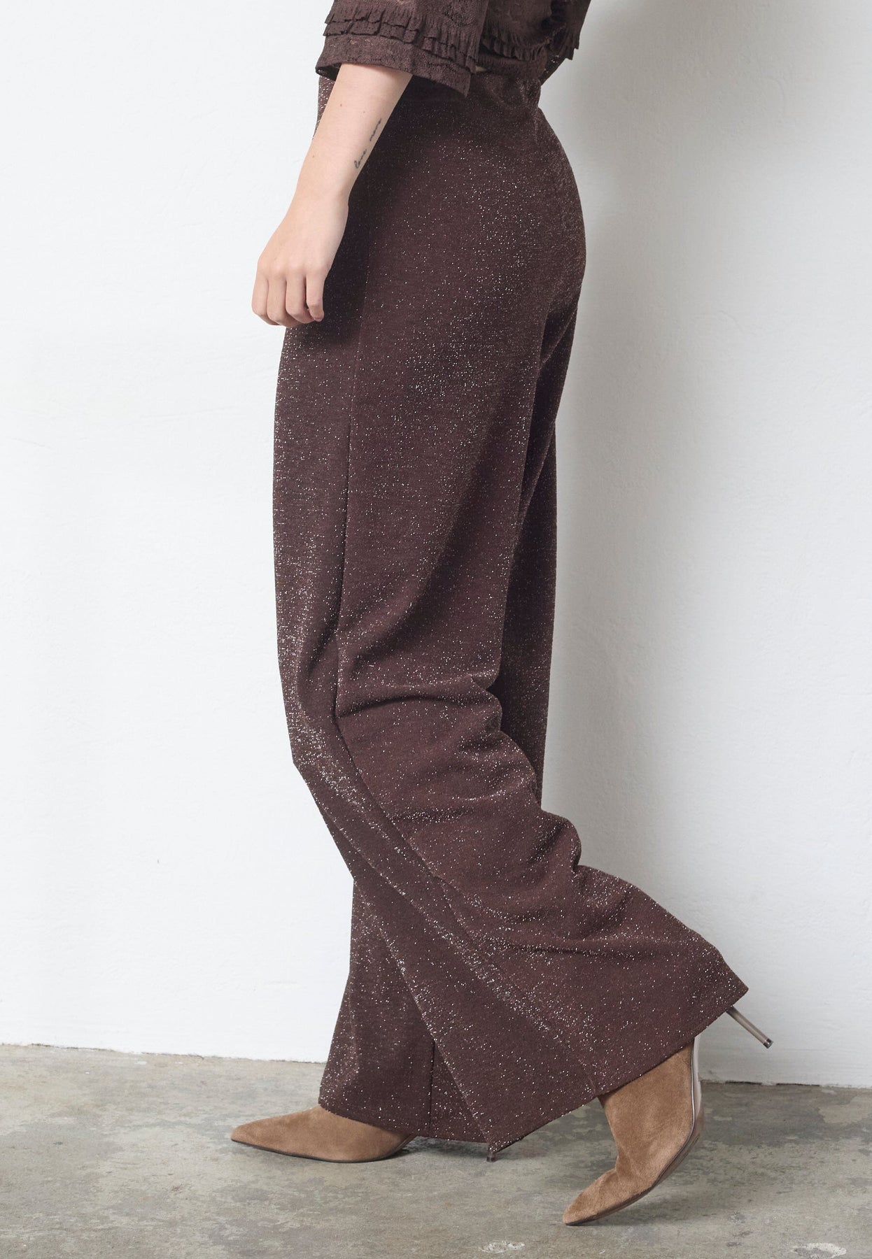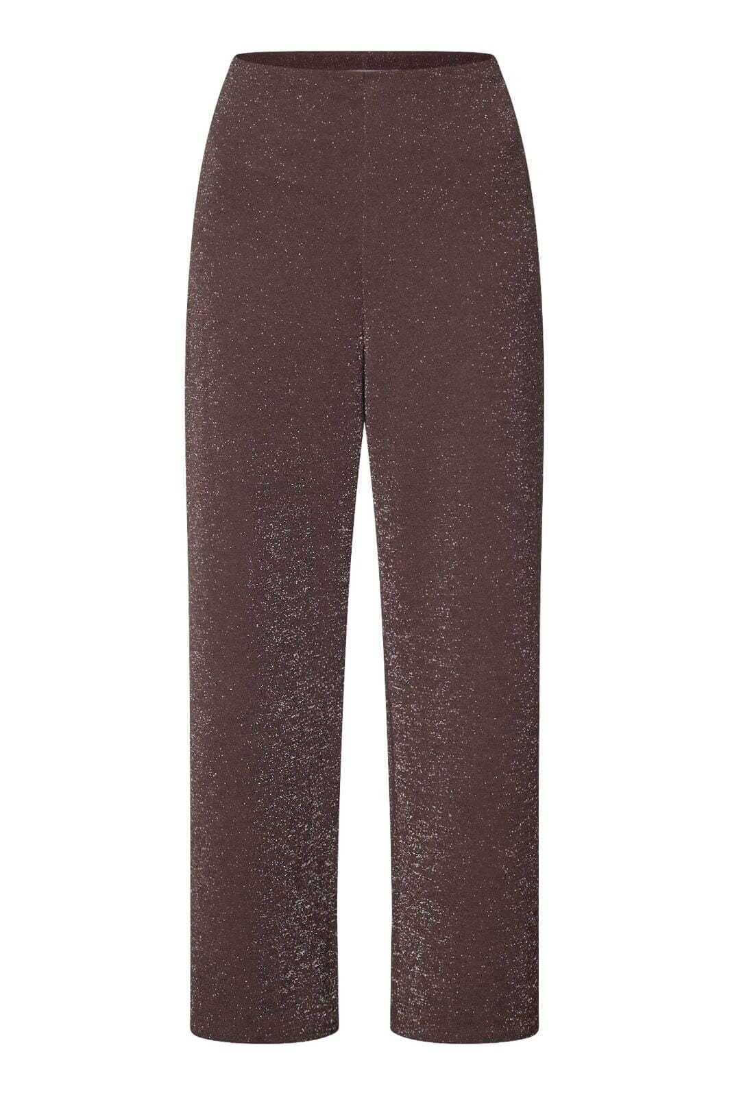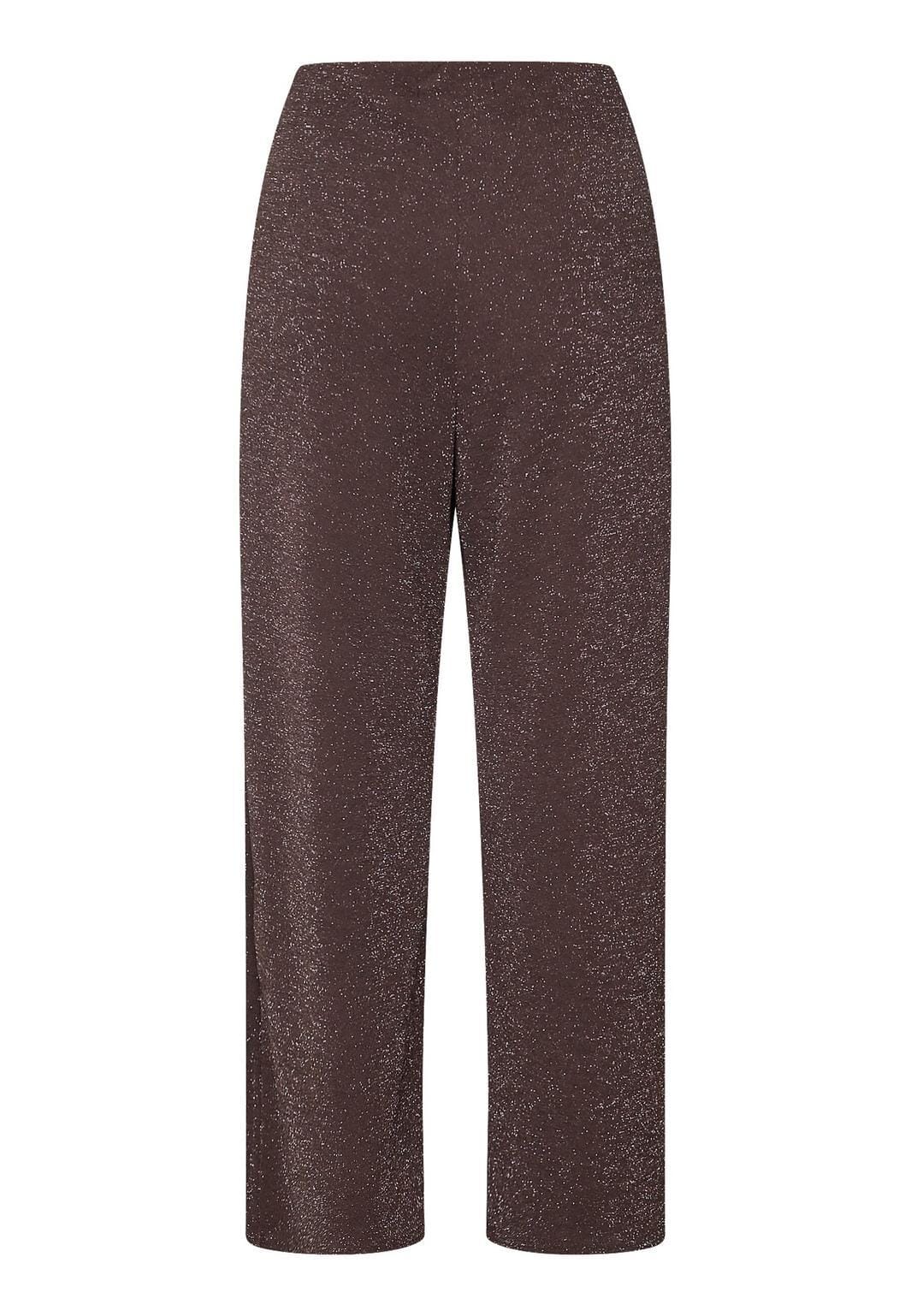 Bukser fra Sisters Point i sjokoladebrun med sølvglitter. Buksene har vide ben og en løs passform som passer til festlige og formelle anledninger.