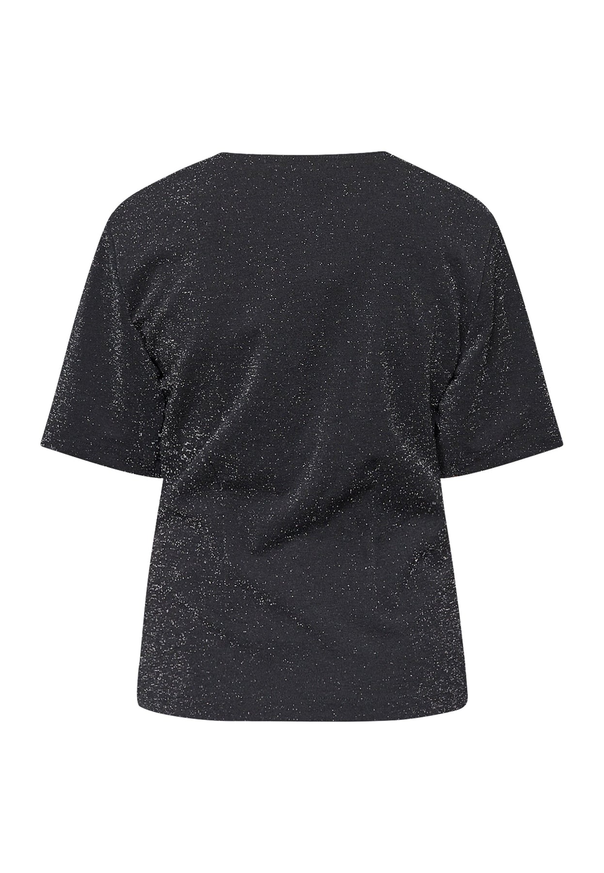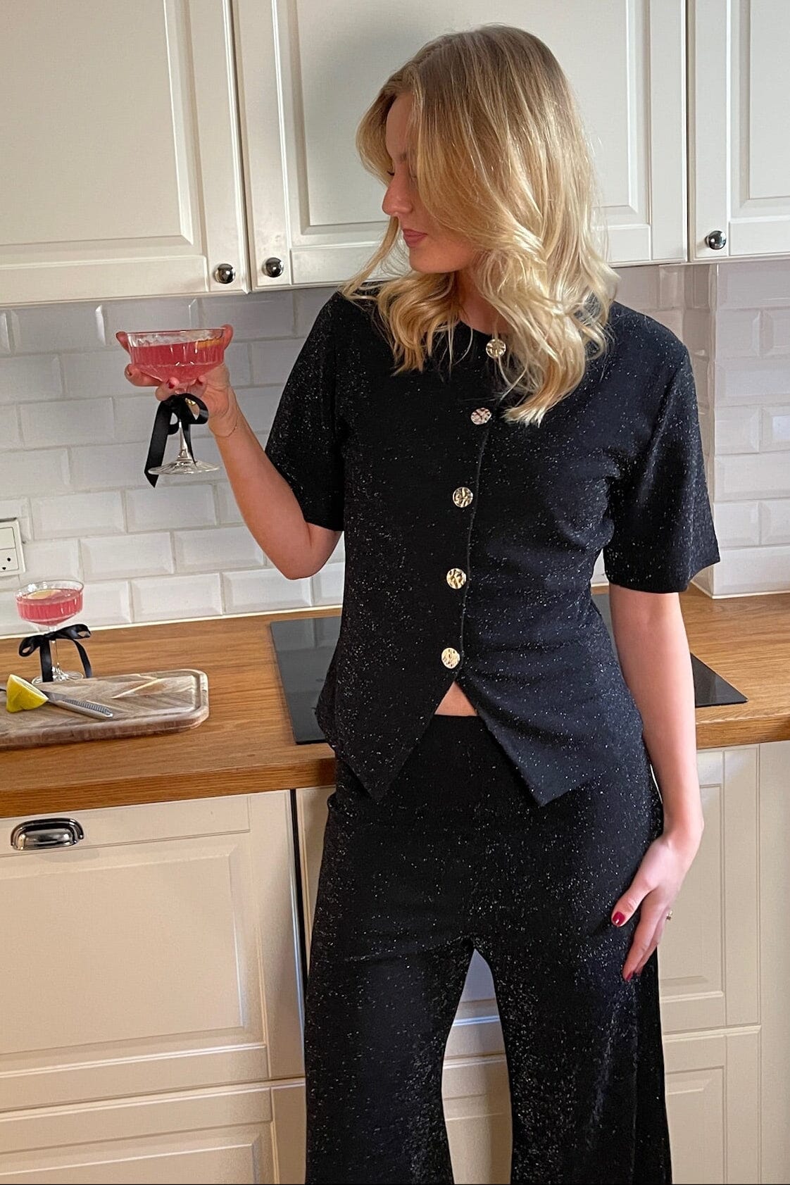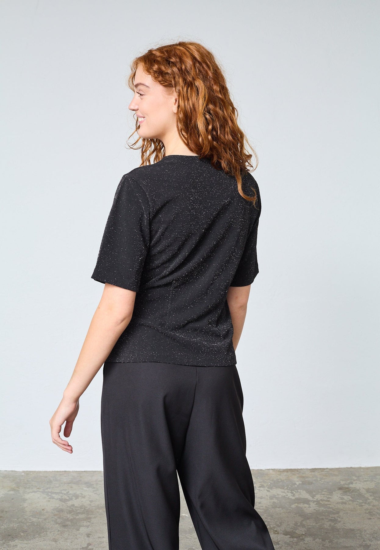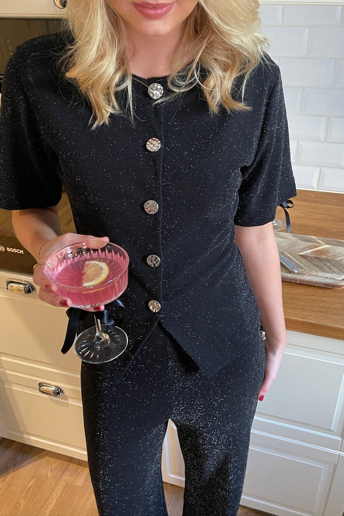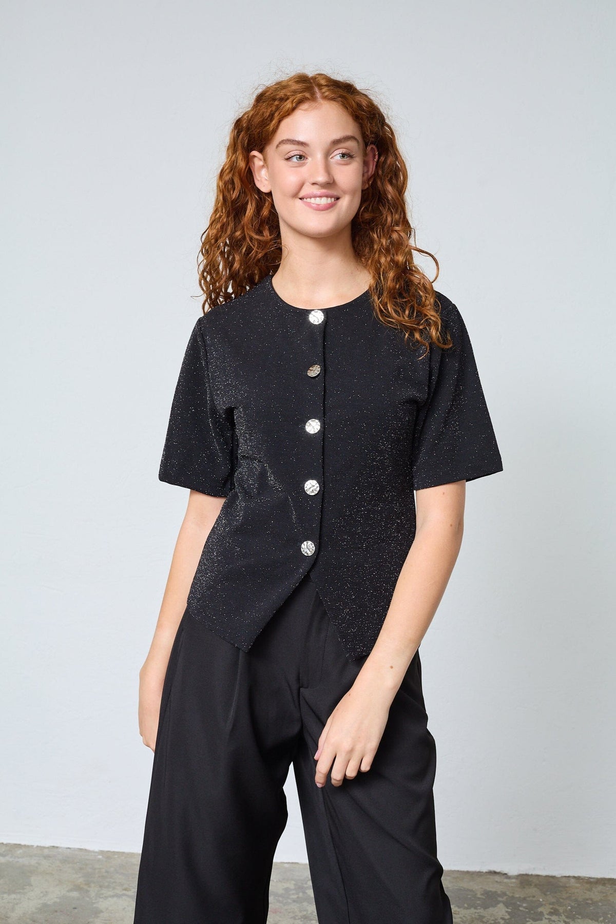 Svart topp med glitrende sølveffekt fra Sisters Point. Toppen har en rund halsutskjæring og korte ermer med dekorative sølvknapper på forsiden.