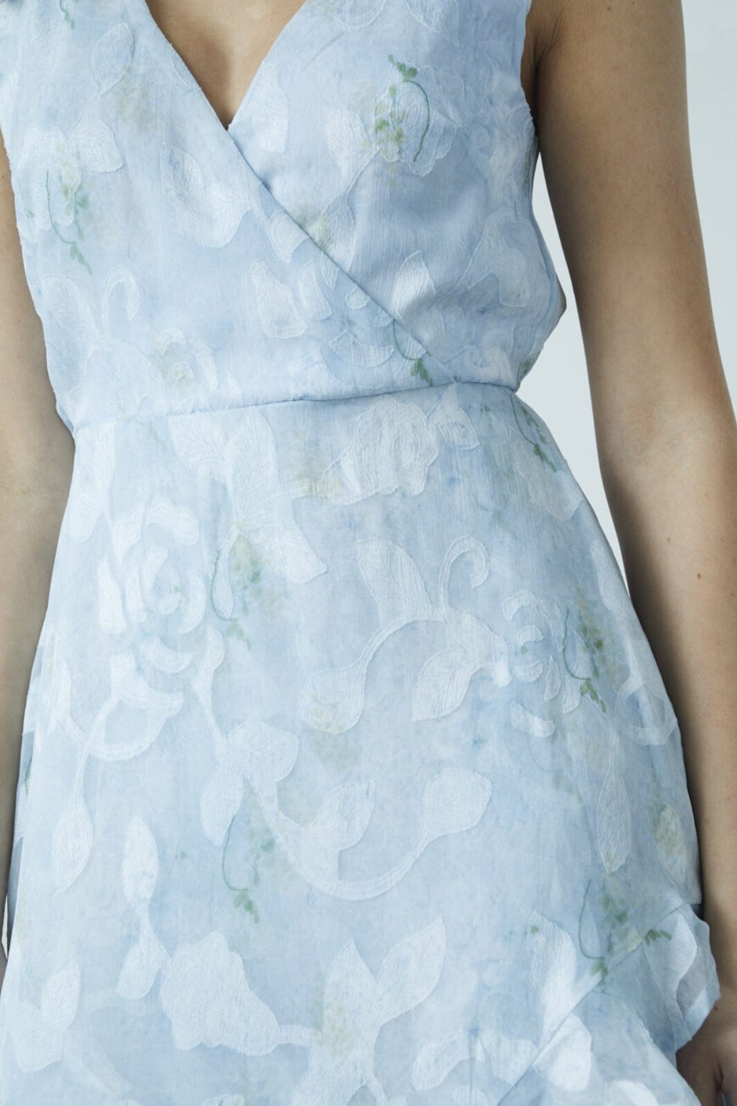 Lys blå kjole fra Sisters Point med blomstermønster. Kjolen har en omslagsdesign foran og en asymmetrisk skjørt med volangdetaljer. V-utskjæringen og det ermeløse designet gir et lett uttrykk.