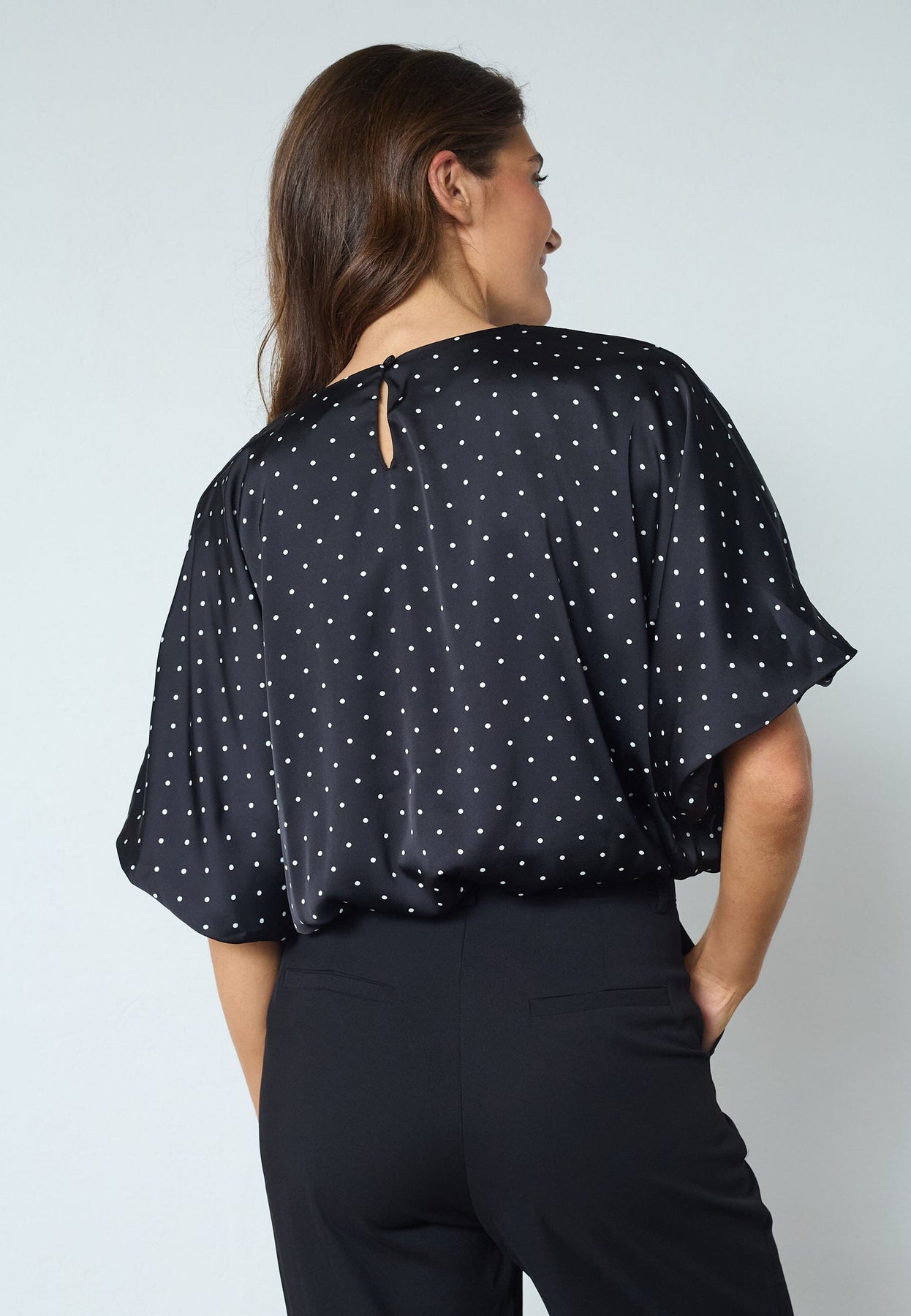 Sort topp fra Sisters Point med hvite prikker. Toppen har en løs passform og korte ermer.