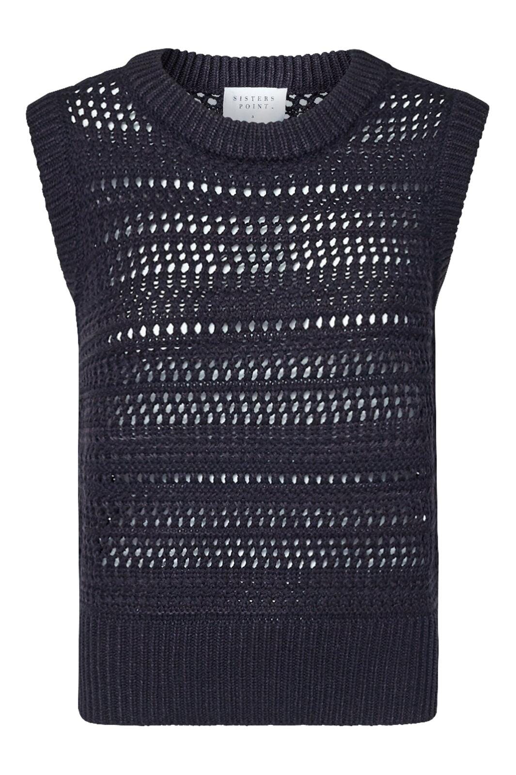 Svart ermeløs vest fra Sisters Point med et hullmønster i strikket akryl og bomull. Vesten har en rund halsutringning og passer til hverdagsbruk.