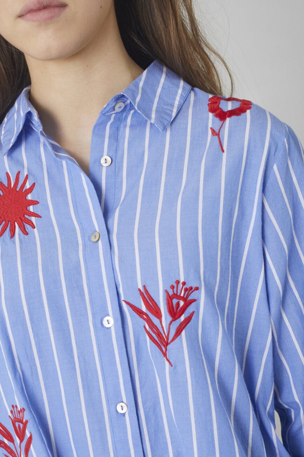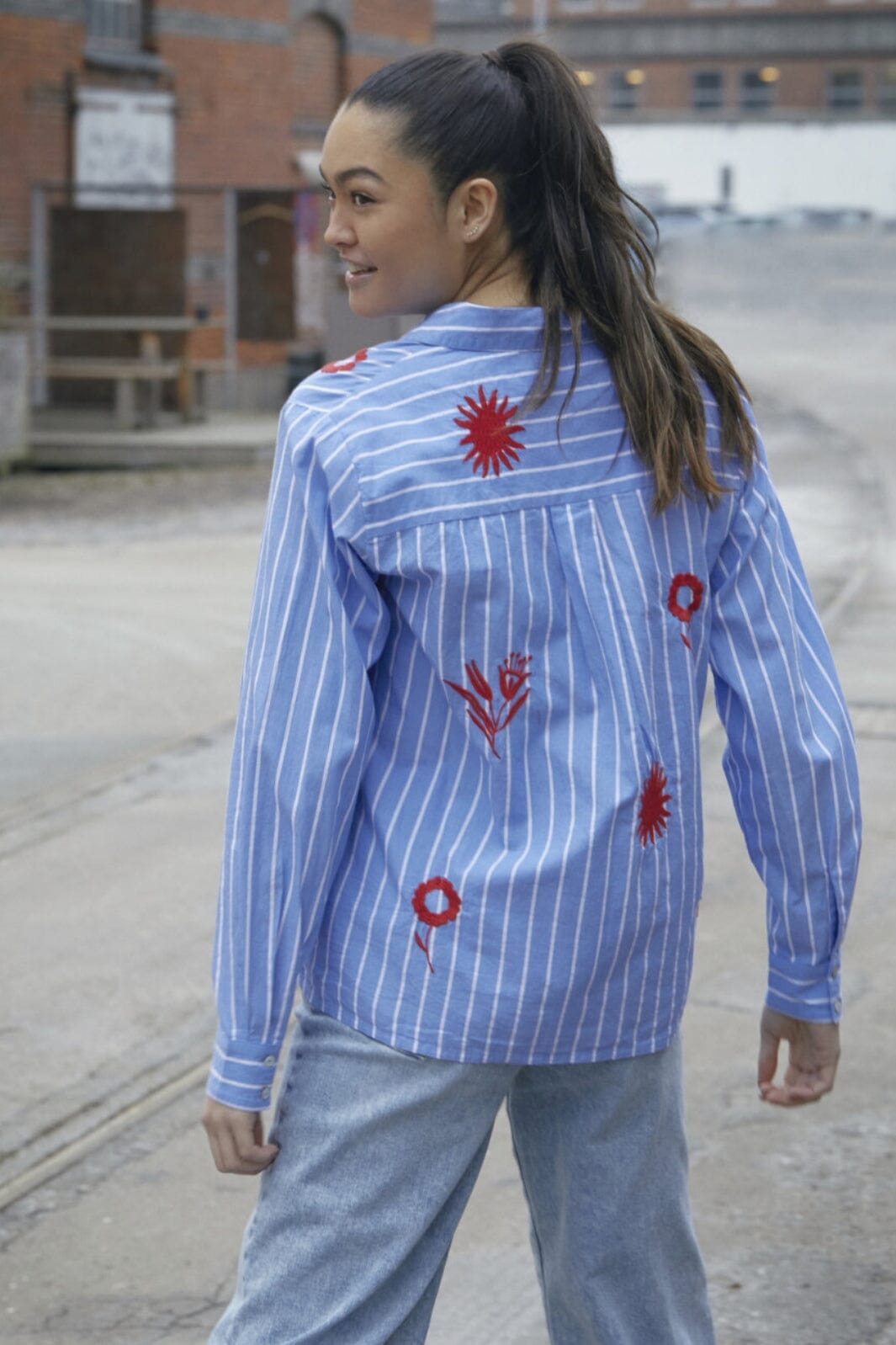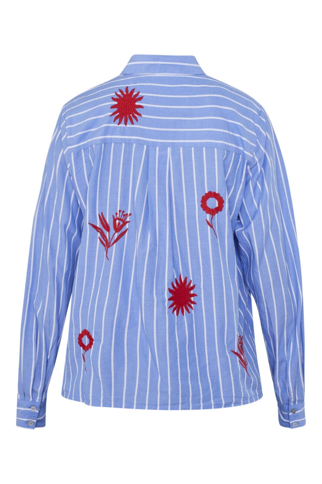 Stripet skjorte fra Sisters Point med røde blomsterbroderier på for- og baksiden. Den lyseblå og hvite stripete skjorten har klassisk krage og lange ermer med knapplukking.