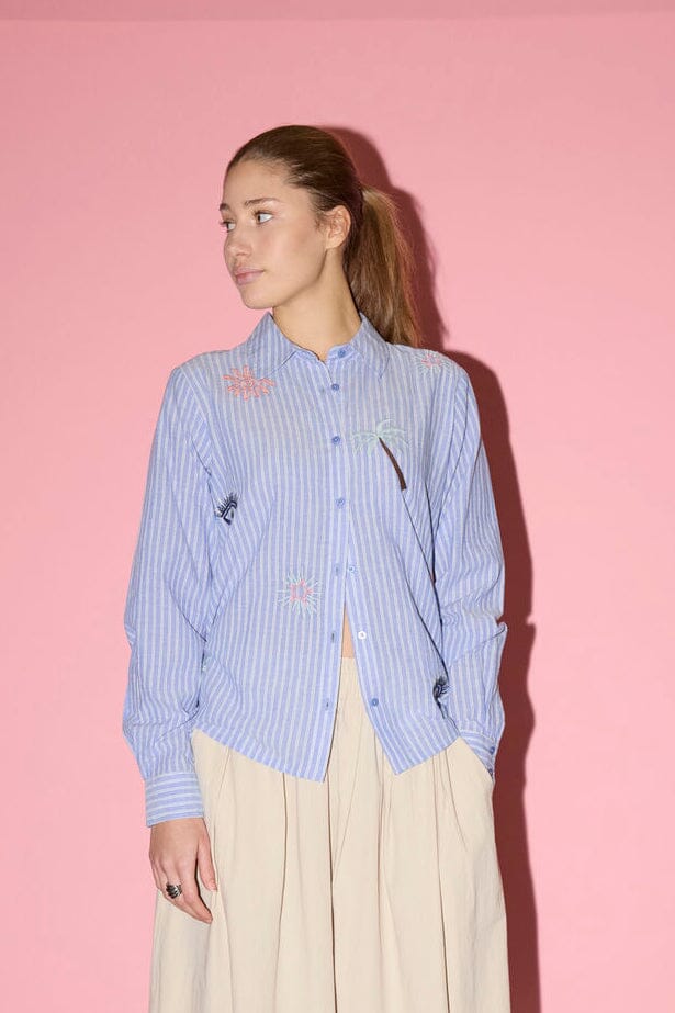 Skjorte fra Sisters Point med blå og hvite striper. Skjorten har broderi og en løs passform.
