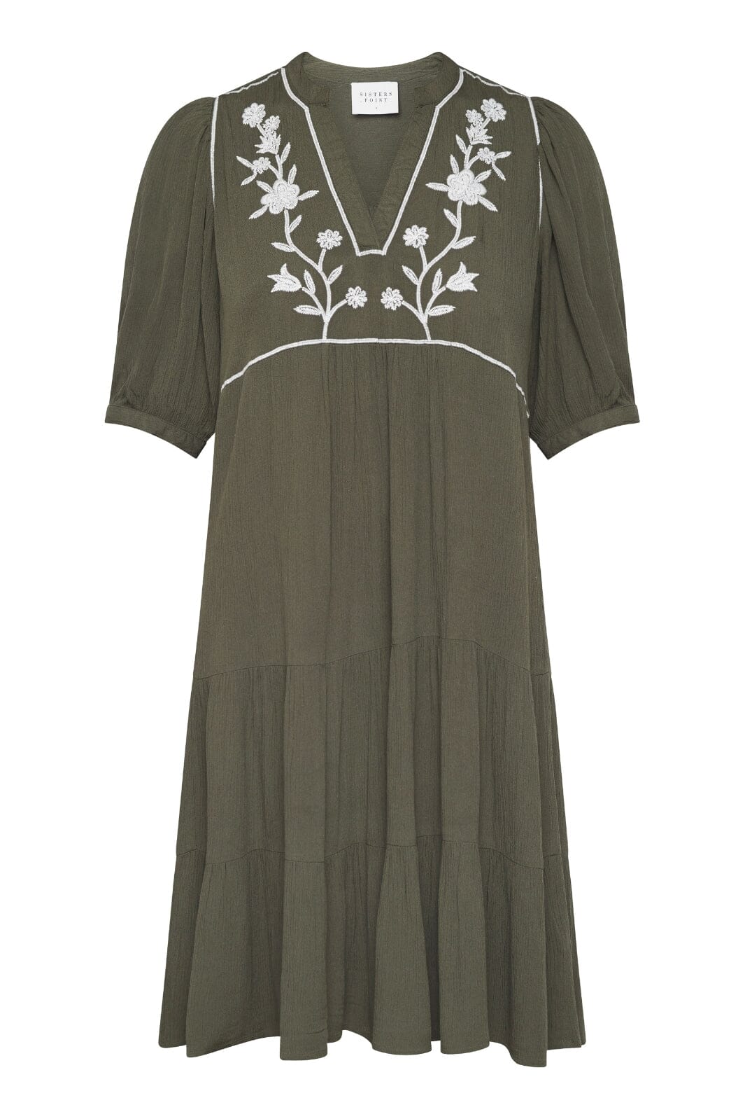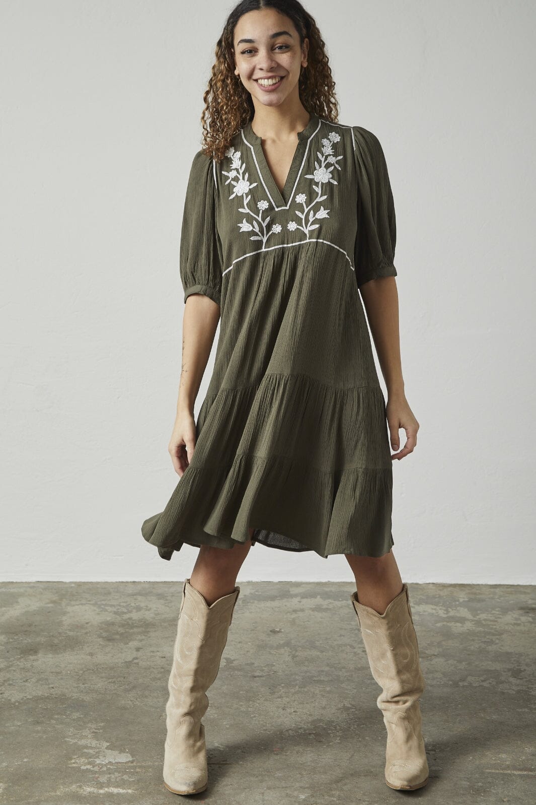 Khaki kjole i bohemestil med hvitt blomsterbroderi ved V-utskjæringen. Den har korte pufferm og en løs passform med flere lag stoff og rynkeeffekt.