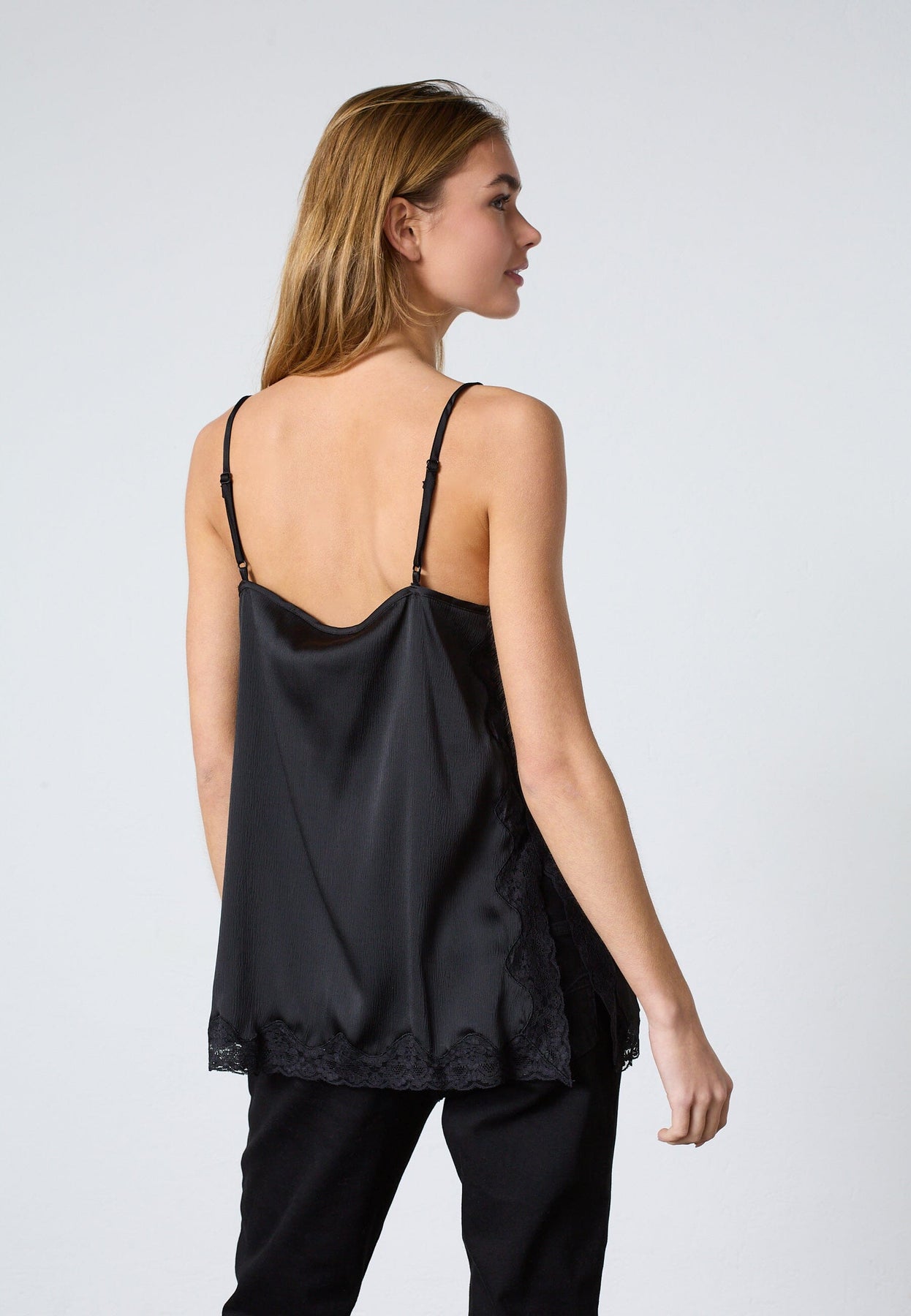 Sort topp fra Sisters Point, laget av sateng med blondekanter. Toppen har tynne spagettistropper og en V-utringning med blonder.