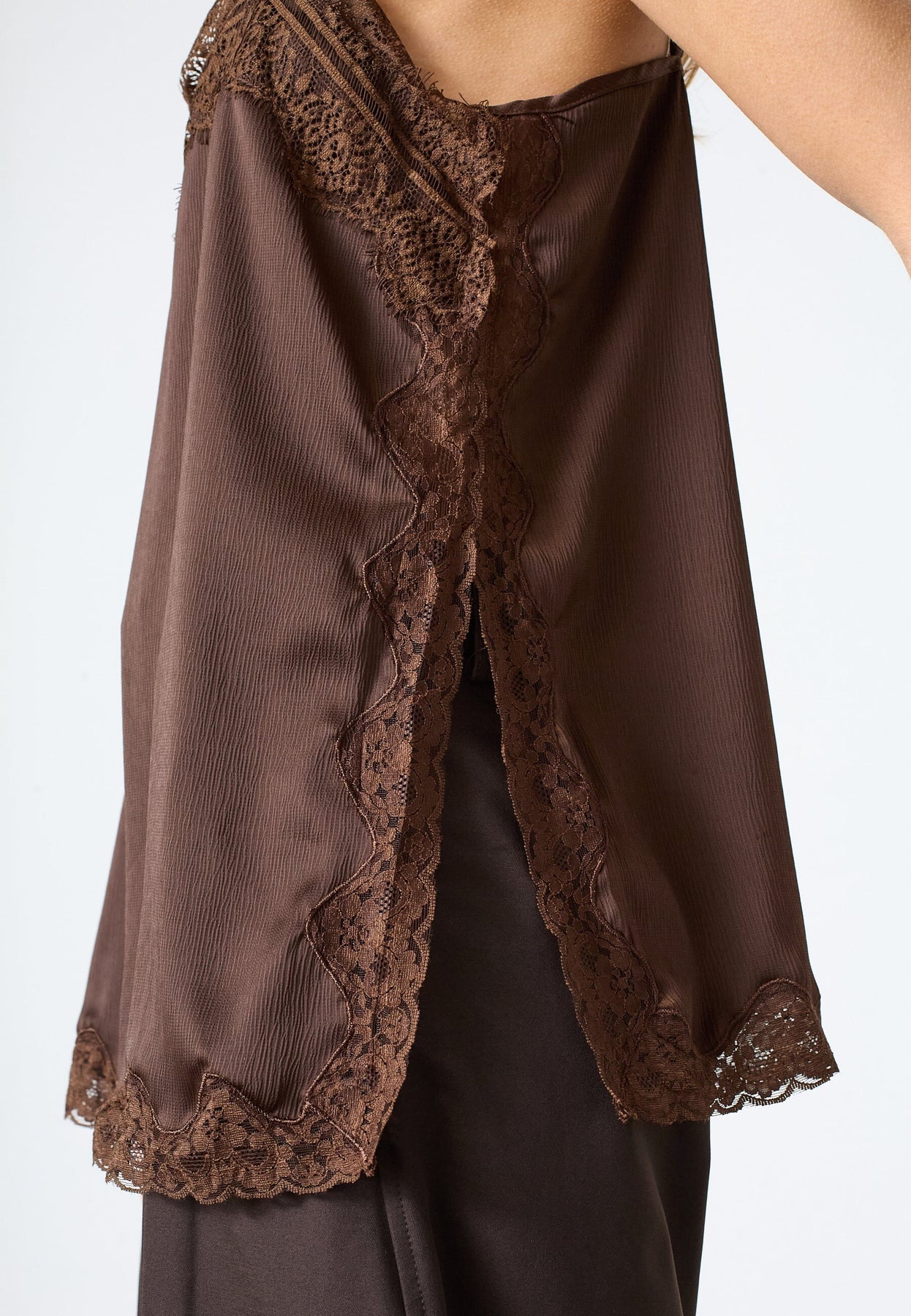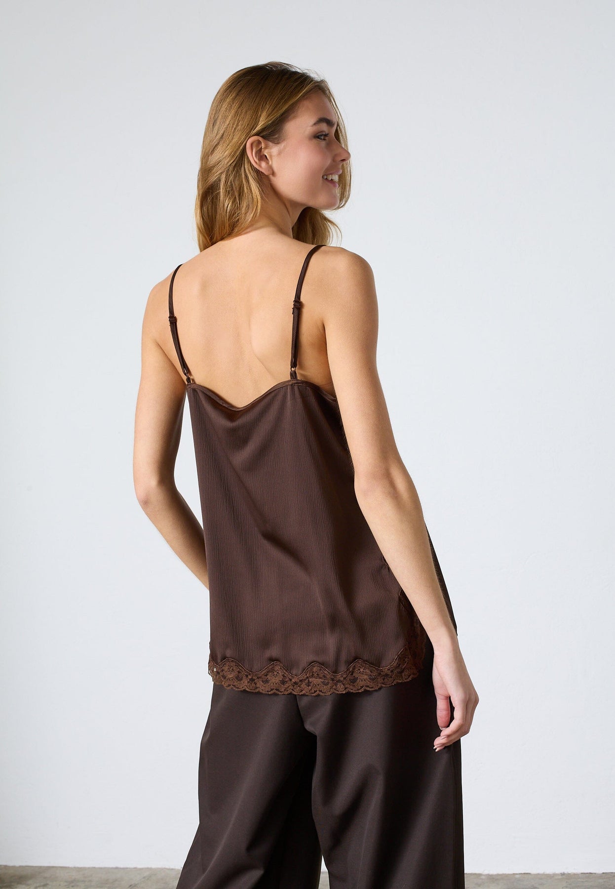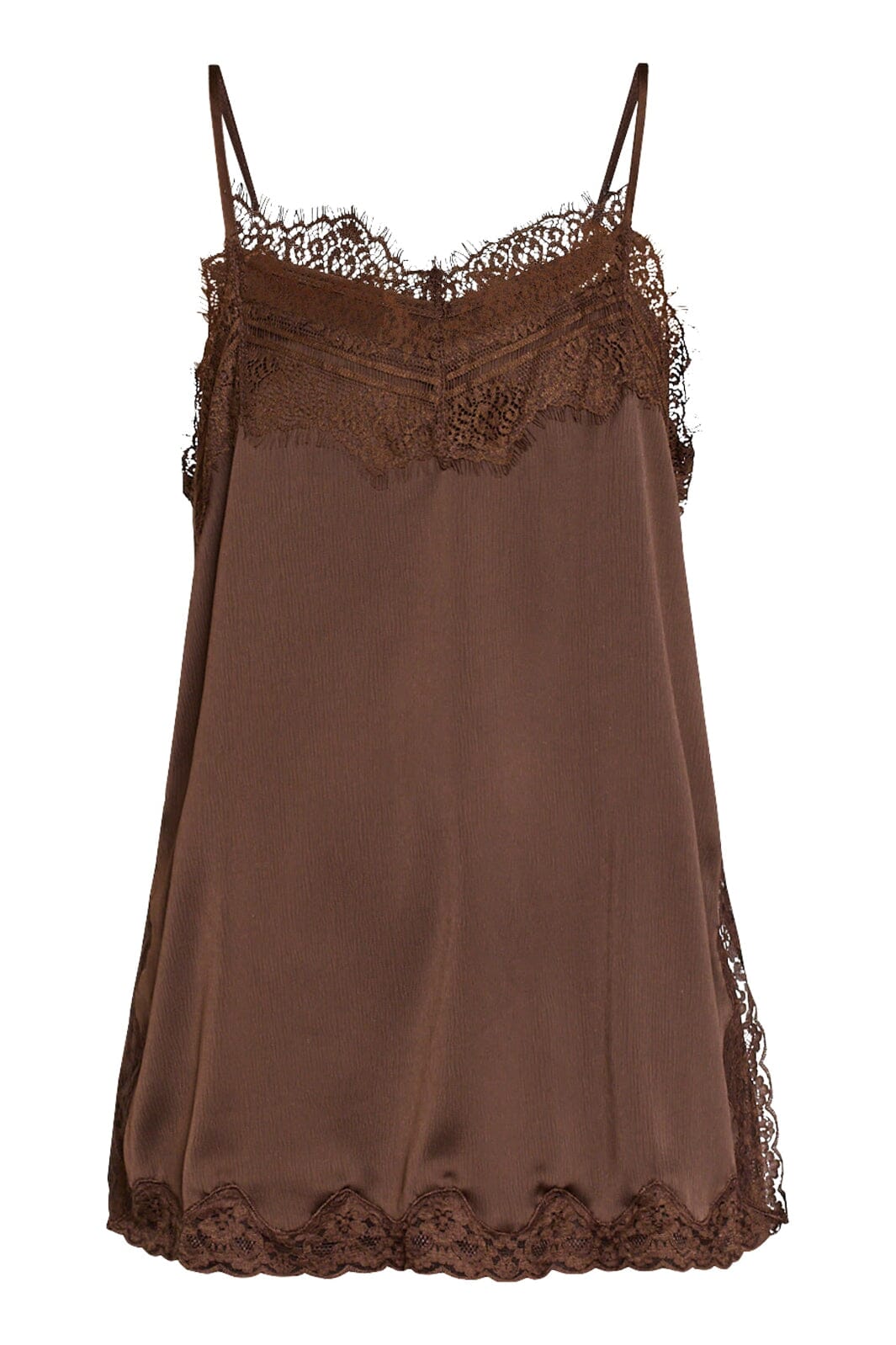 Brun topp fra Sisters Point med tynne stropper og blondedetaljer. Toppen har V-hals og en løs passform i 100 % polyester.