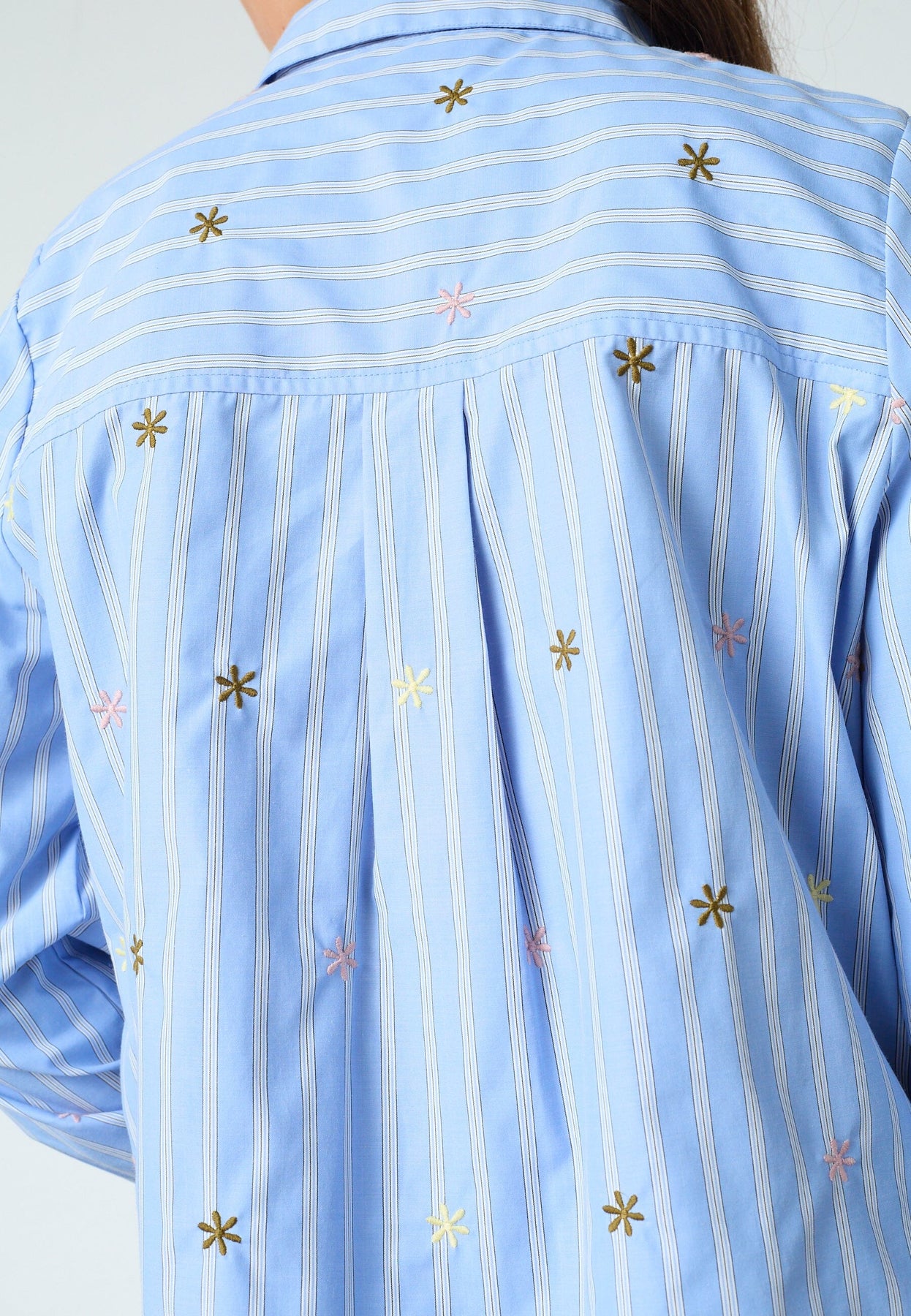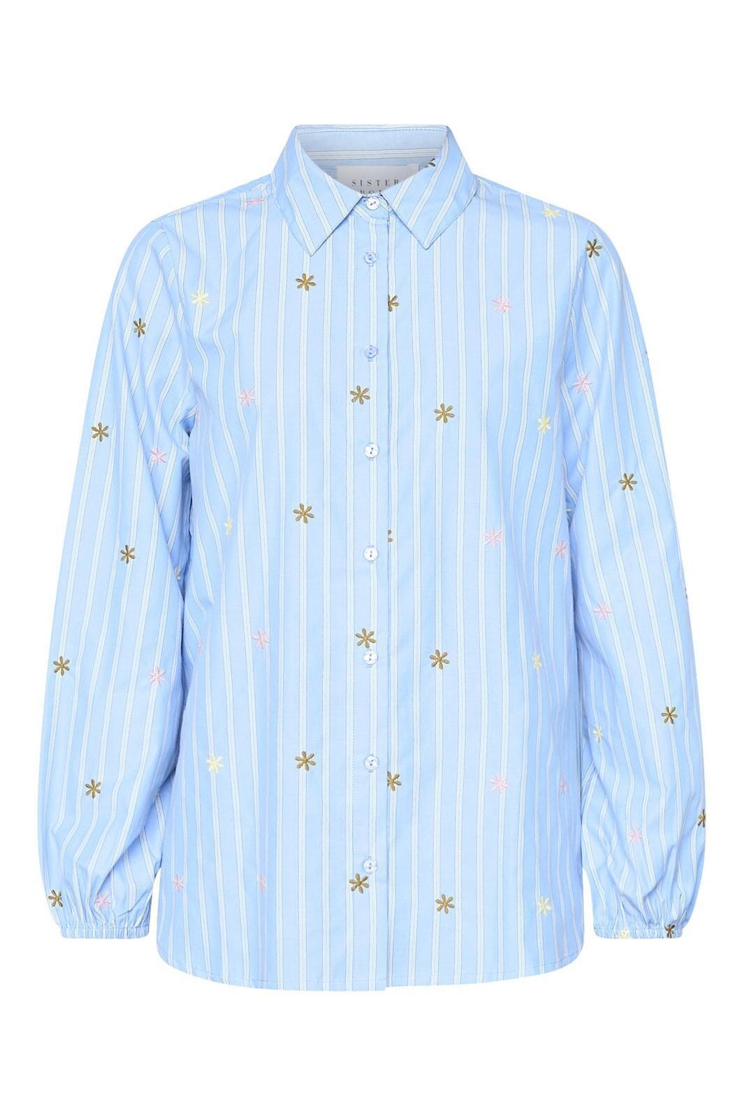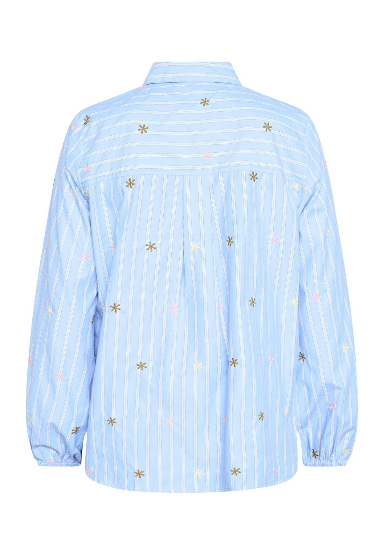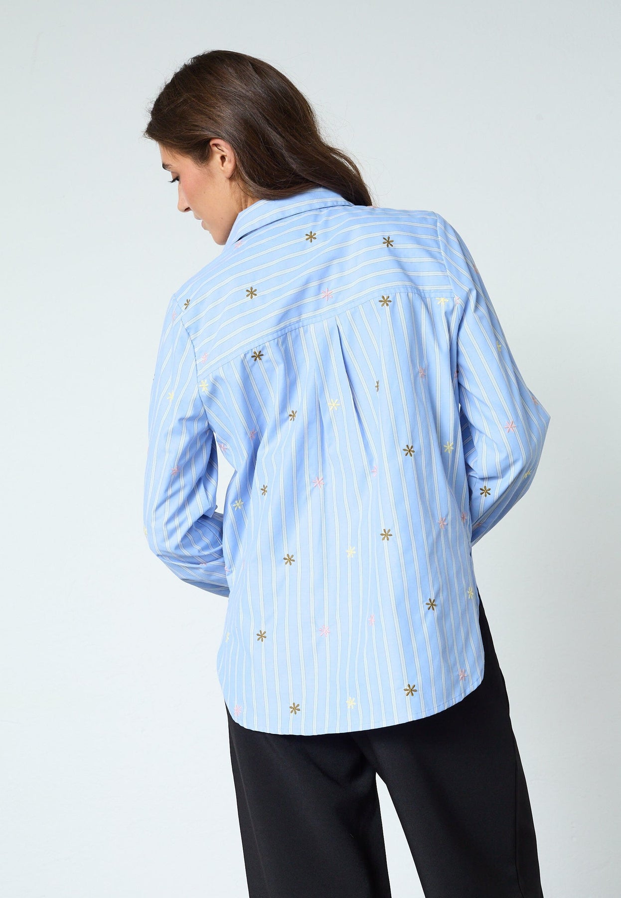 Blåstripet skjorte fra Sisters Point i 100 % bomull. Skjorten har små broderte stjernemotiver i ulike farger spredt over det stripete mønsteret.