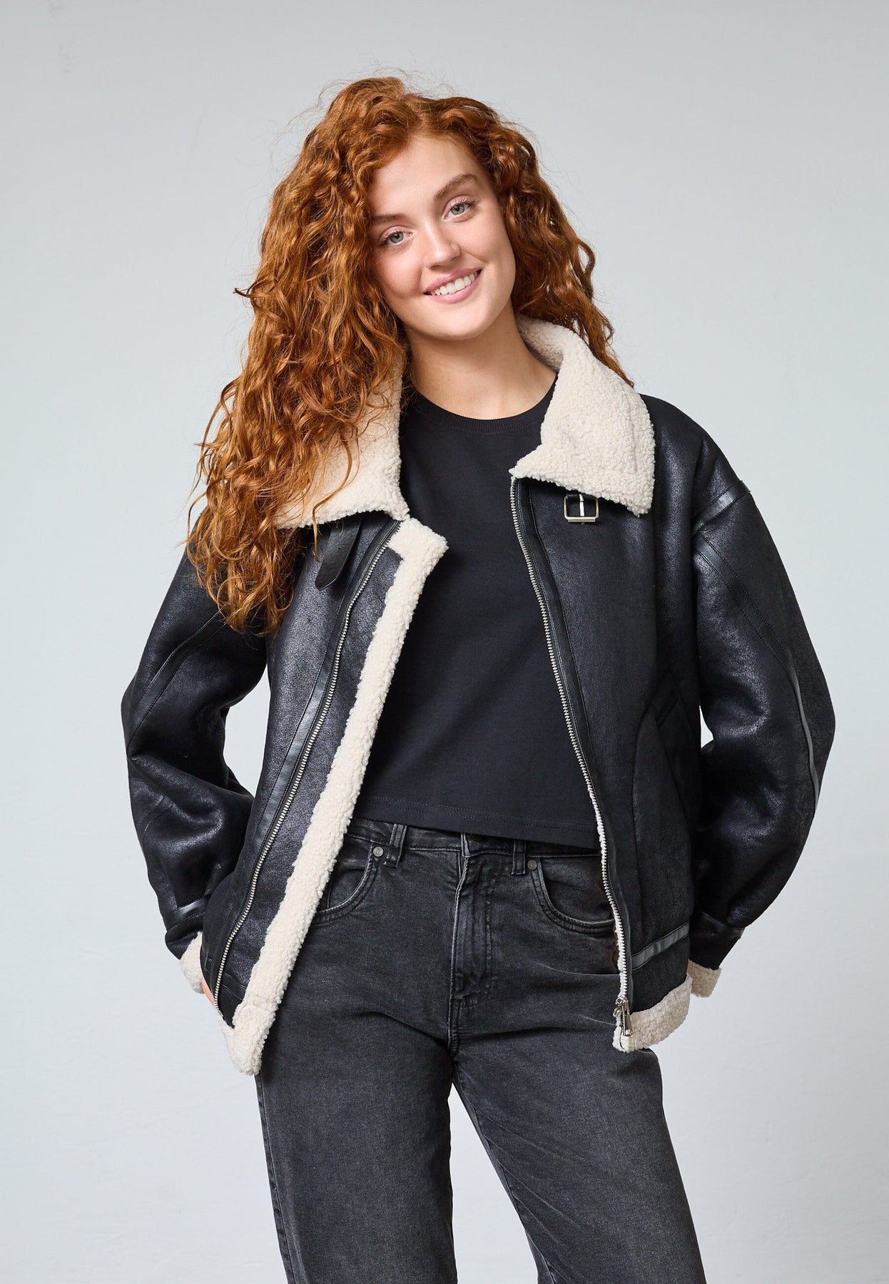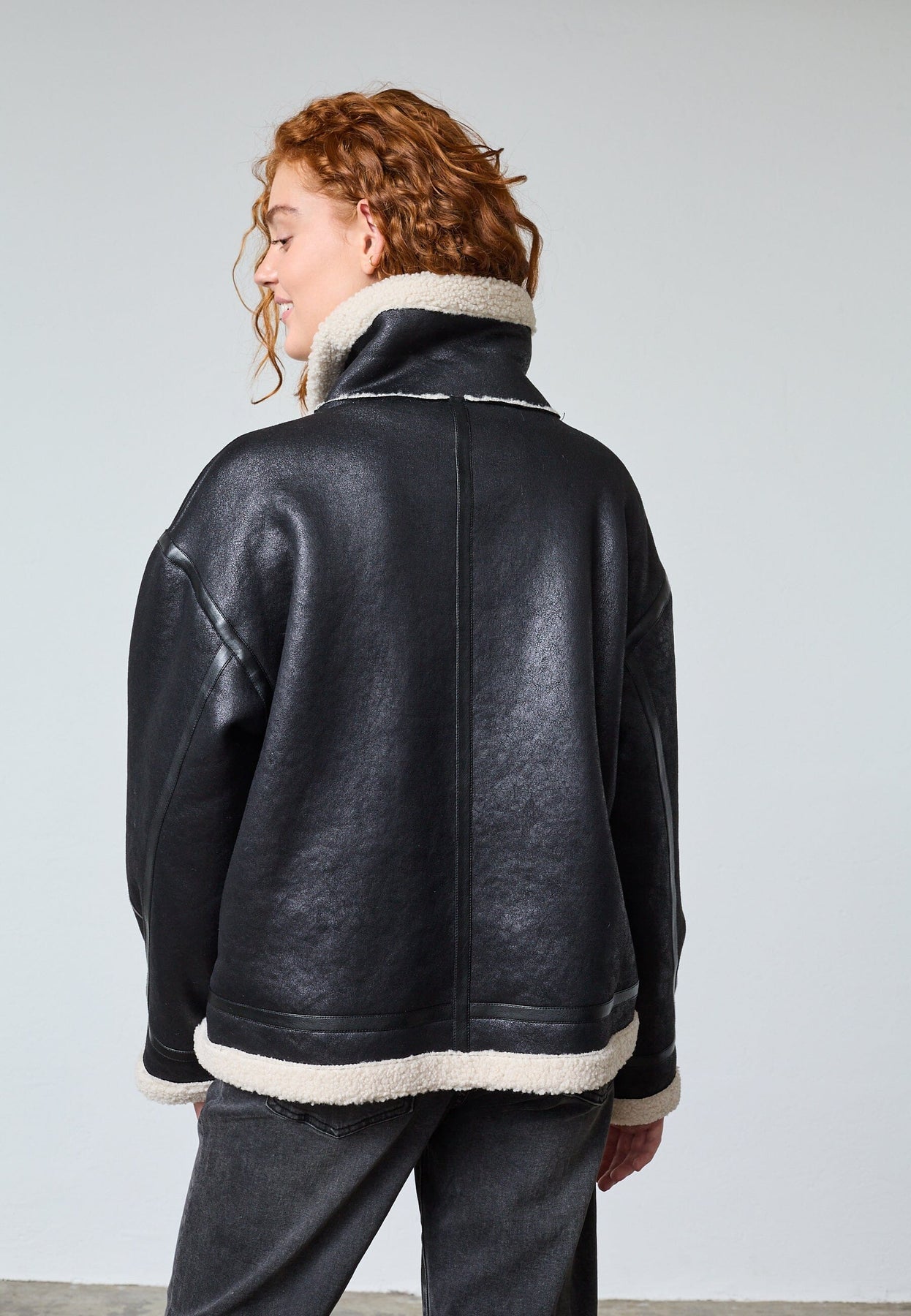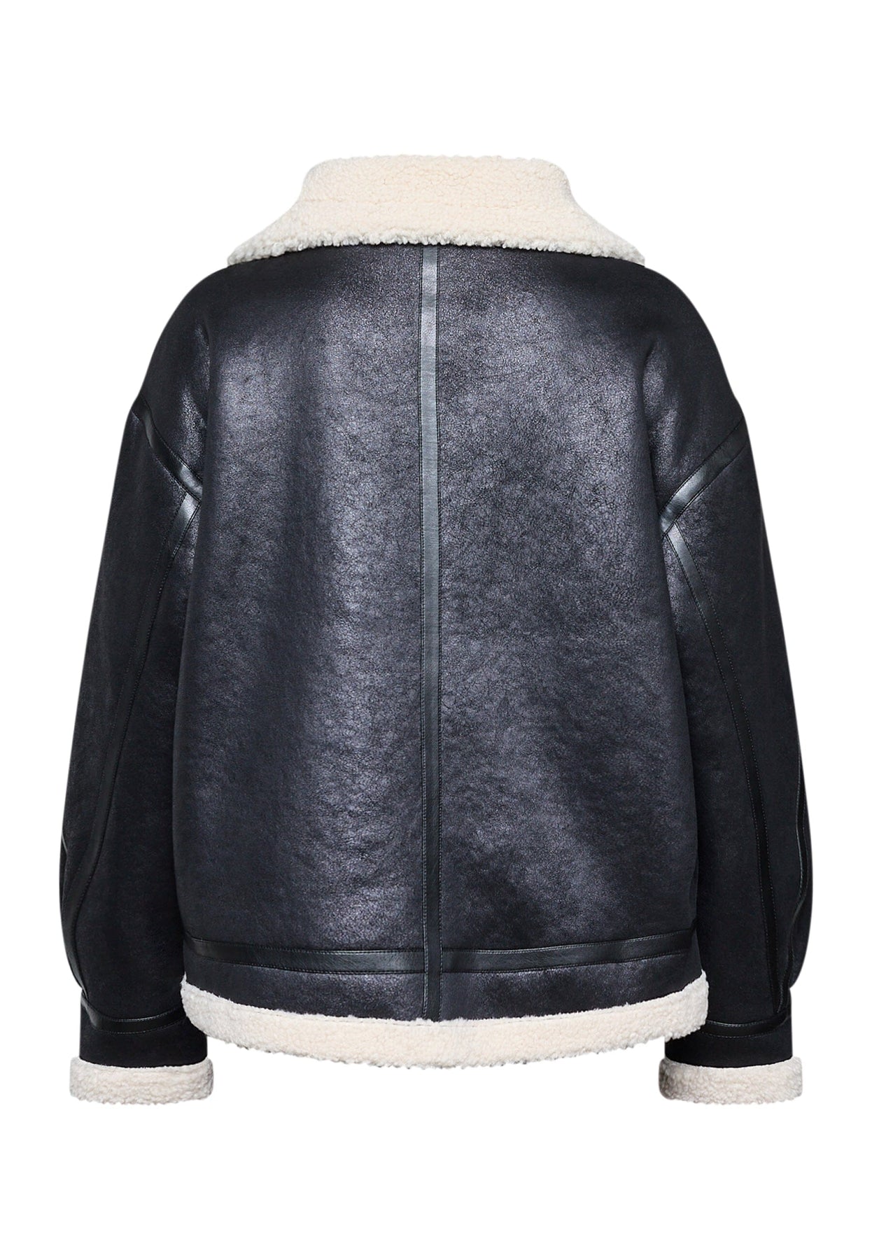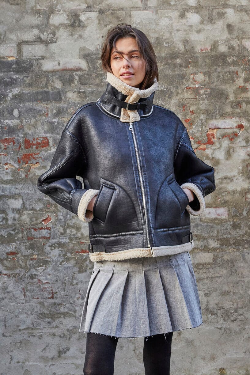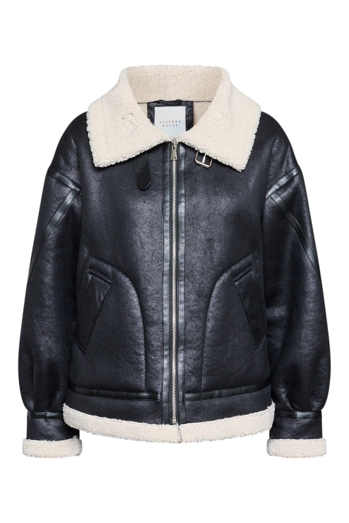 Svart jakke fra Sisters Point med hvit pelskrage og pelsfôr langs kantene. Jakken har glidelås foran og store lommer på hver side.