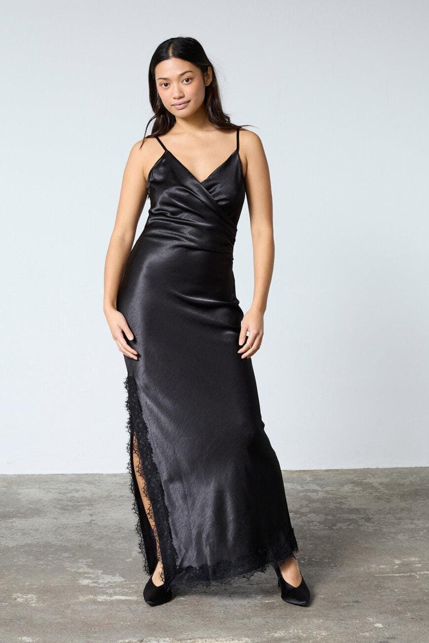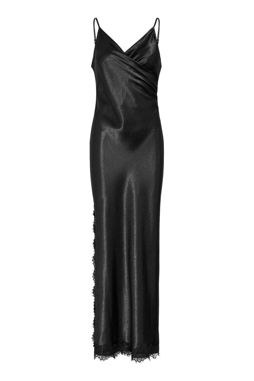 Svart kjole fra Sisters Point til festlige og formelle anledninger. Kjolen har et satengutseende med blonder og en smal passform.