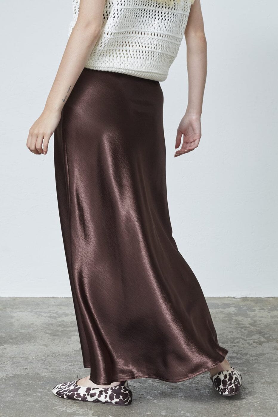 Brun skjørt fra Sisters Point i skinnende satengmateriale. A-line fasongen og det glatte stoffet gir skjørtet et mykt fall. Lengden går til leggen.