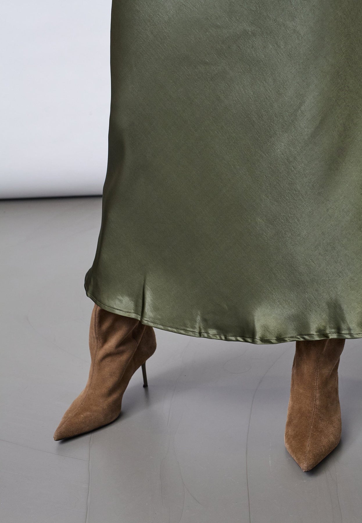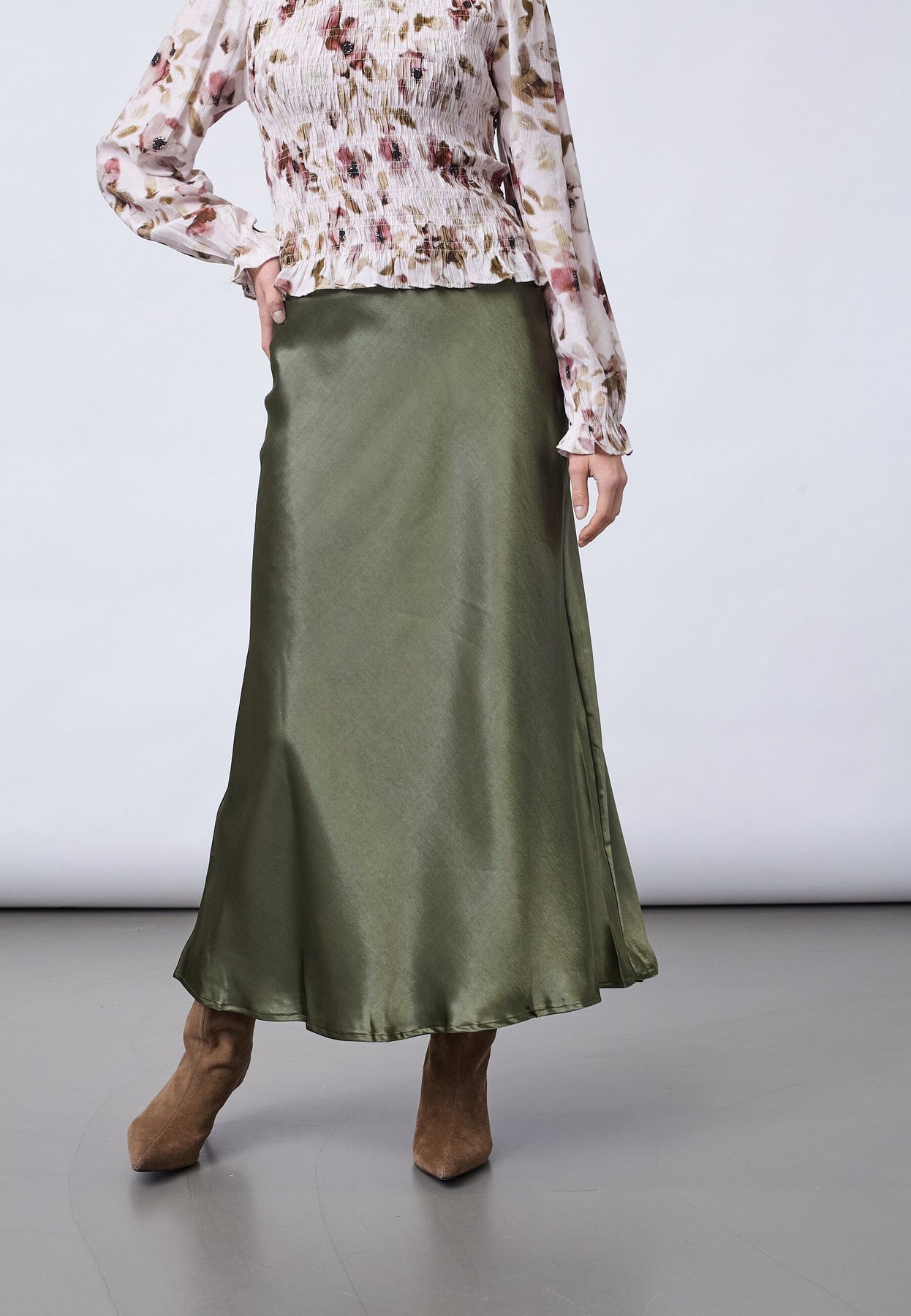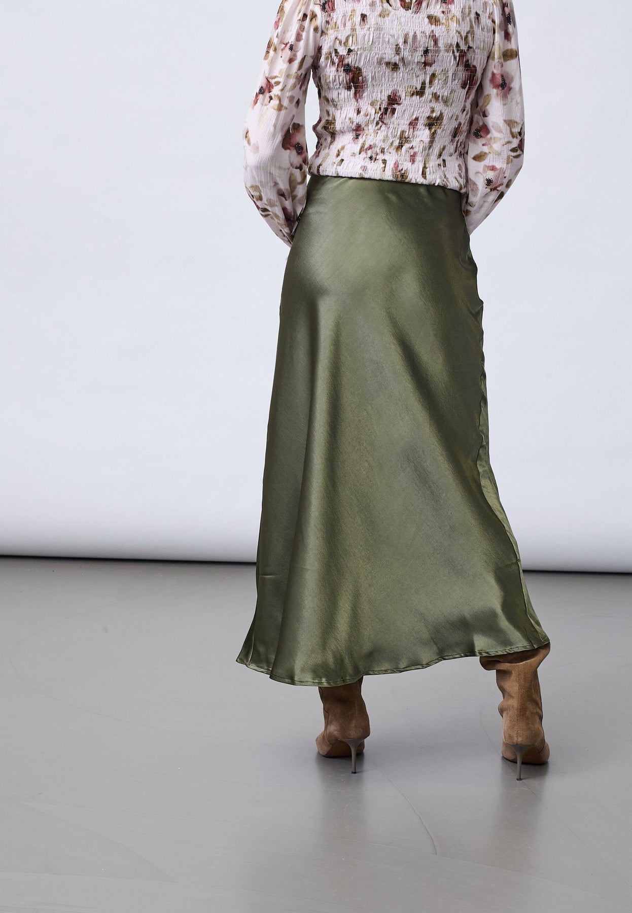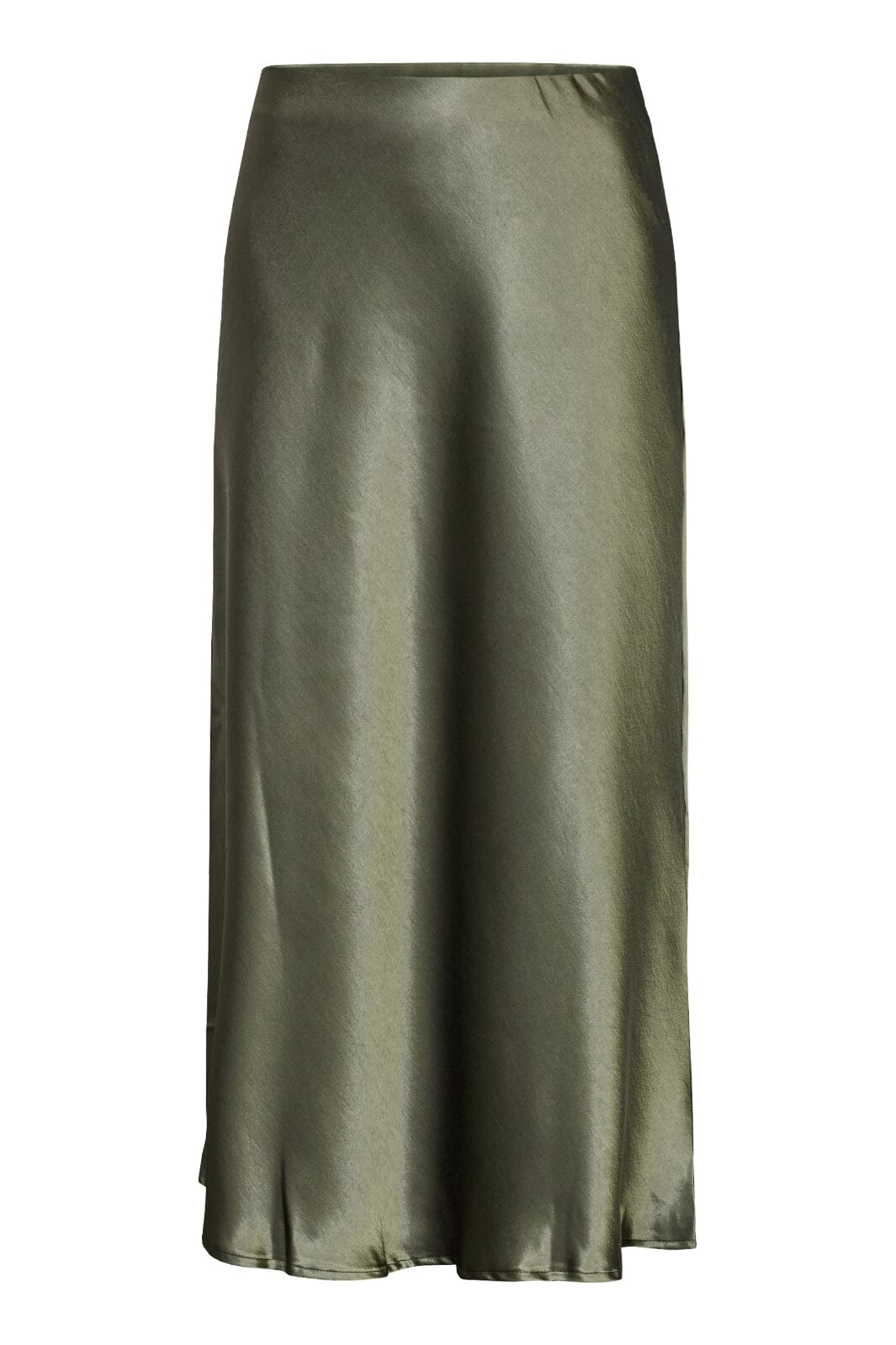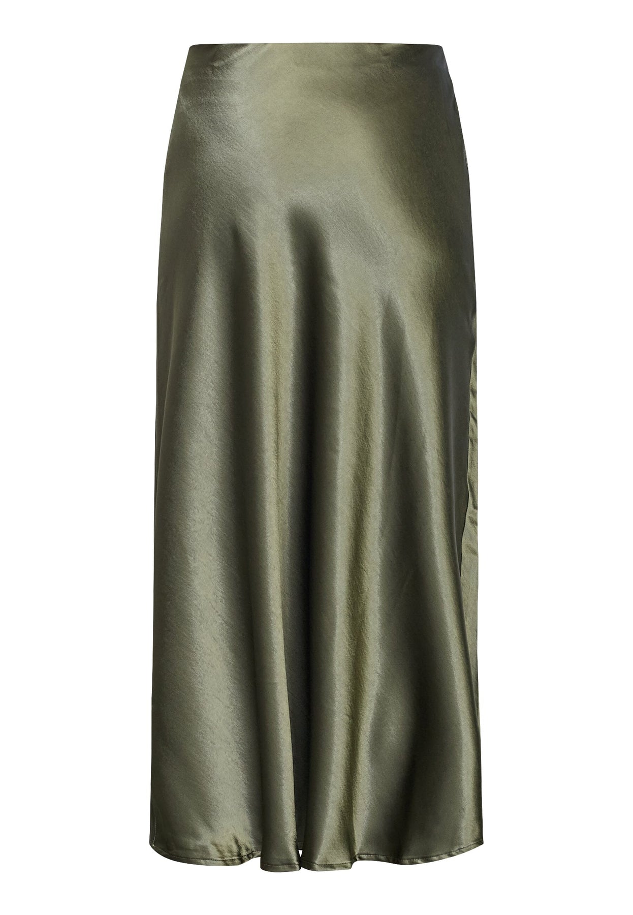 Skjørt fra Sisters Point, laget av sateng i en olivengrønn nyanse. Skjørtet har en A-linjeform og en lengde til midt på leggen.