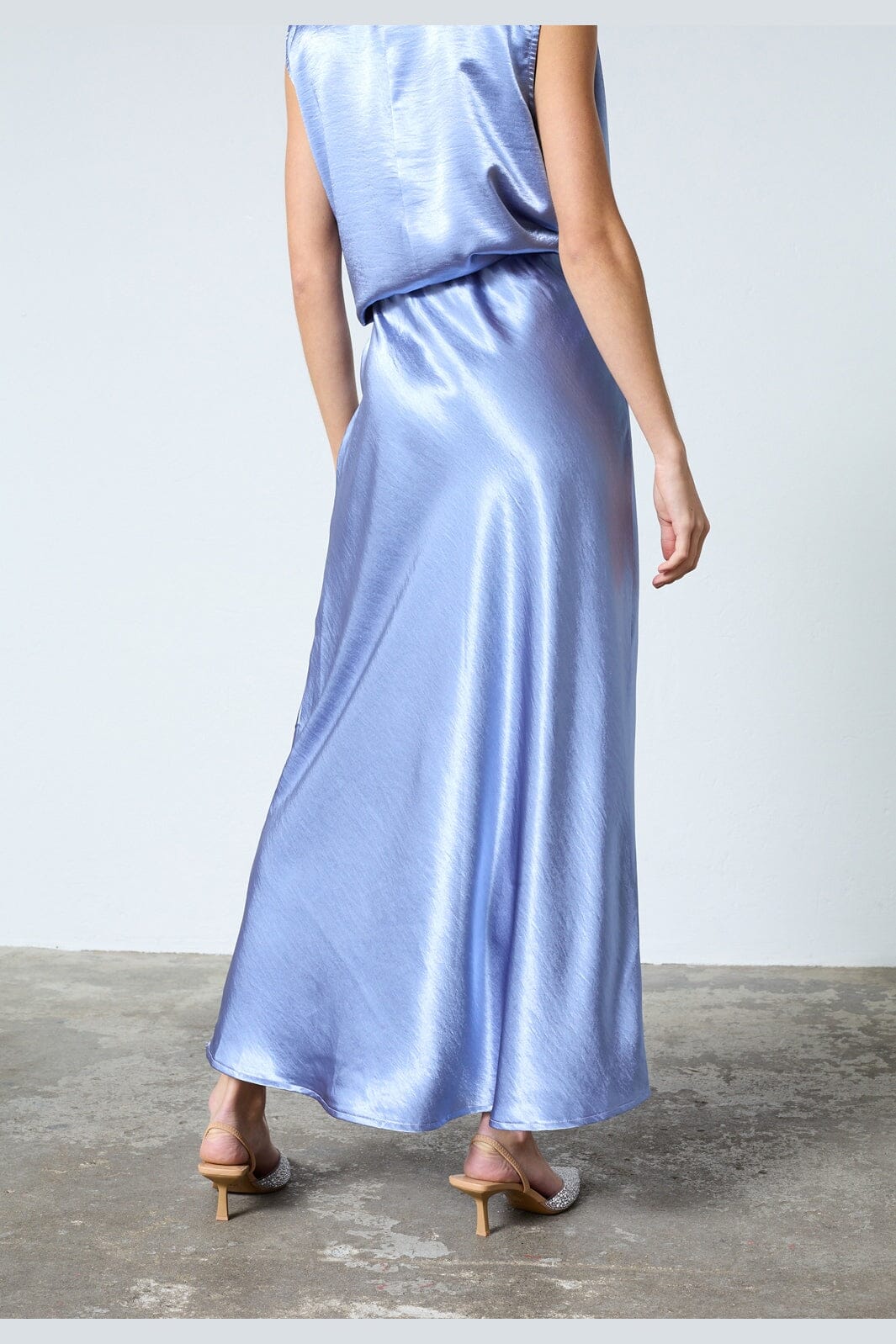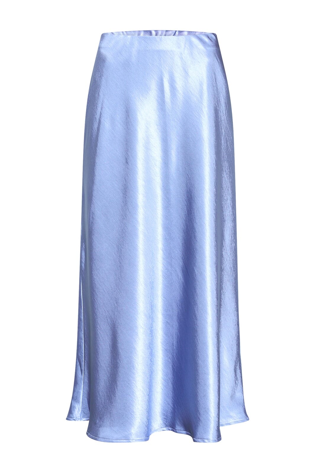 Mellomblått skjørt fra Sisters Point, laget i sateng med A-linjeformet snitt. Skjørtet har en skinnende overflate og rekker til leggen.