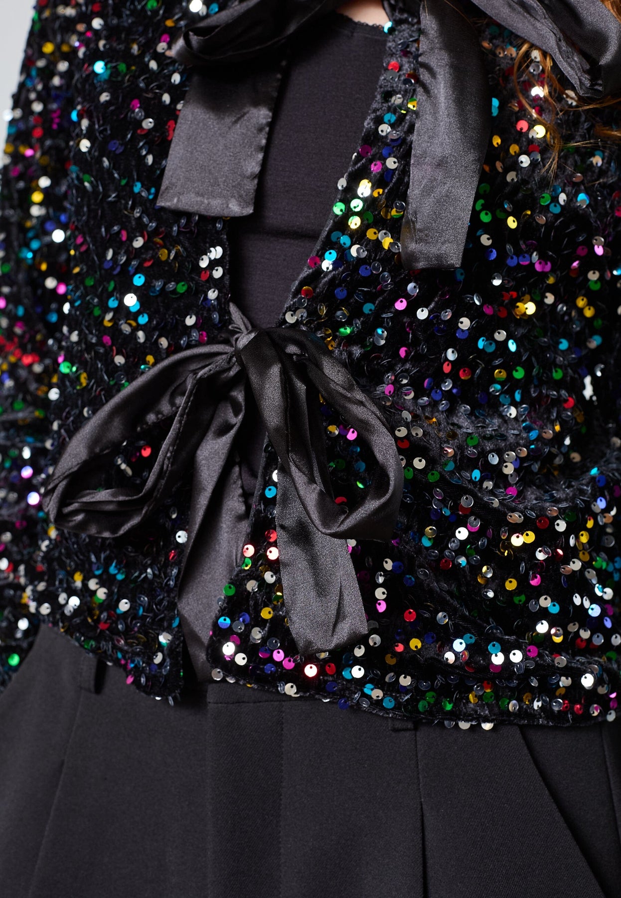 Svart topp fra Sisters Point med fargede paljetter overalt. To store sløyfer i glatt stoff pryder fronten, og toppen har lange ermer med samme paljettbesetning.