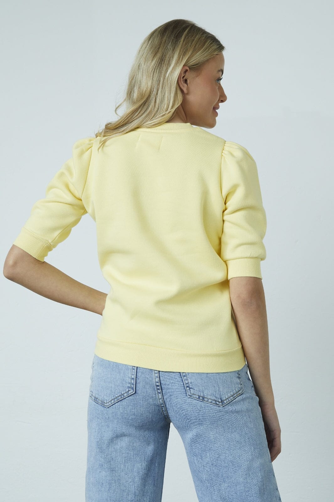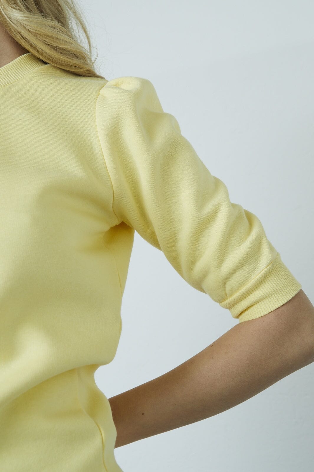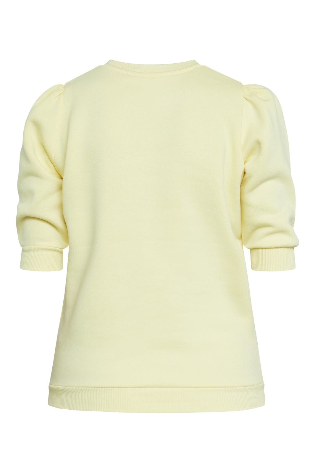 Lys gul sweatshirt fra Sisters Point med trekvart puffærmer og rund halsutskjæring. Den myke innsiden gir en behagelig følelse mot huden.