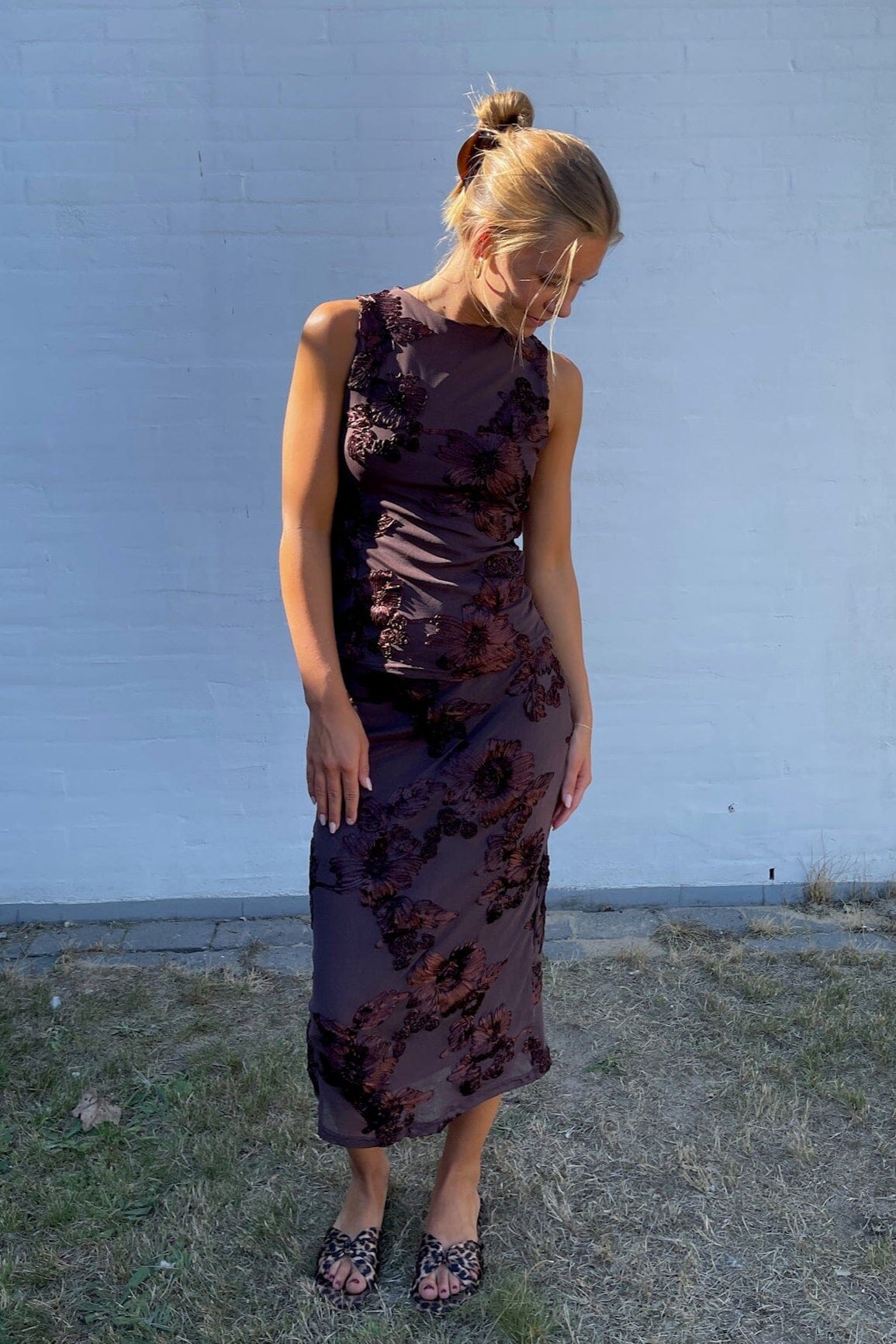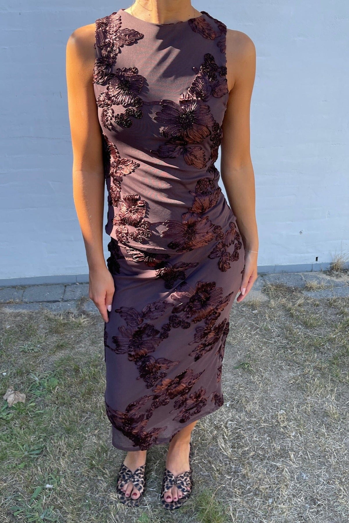 En brun kjole fra Sisters Point med broderte blomstermotiver og paljetter. Kjolen har en figurnær passform og er ermeløs med rund halsutringning.
