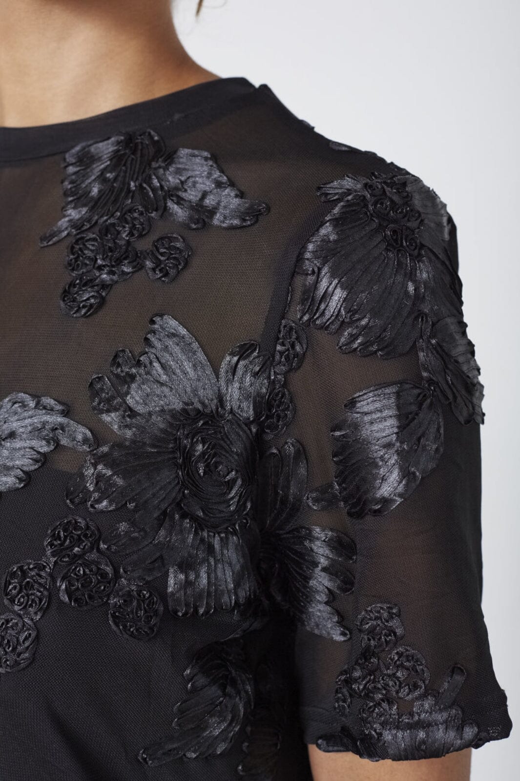 Sort T-skjorte fra Sisters Point med broderte blomstermotiver. Materialet er delvis gjennomsiktig øverst og gir T-skjorten et dekorativt uttrykk.