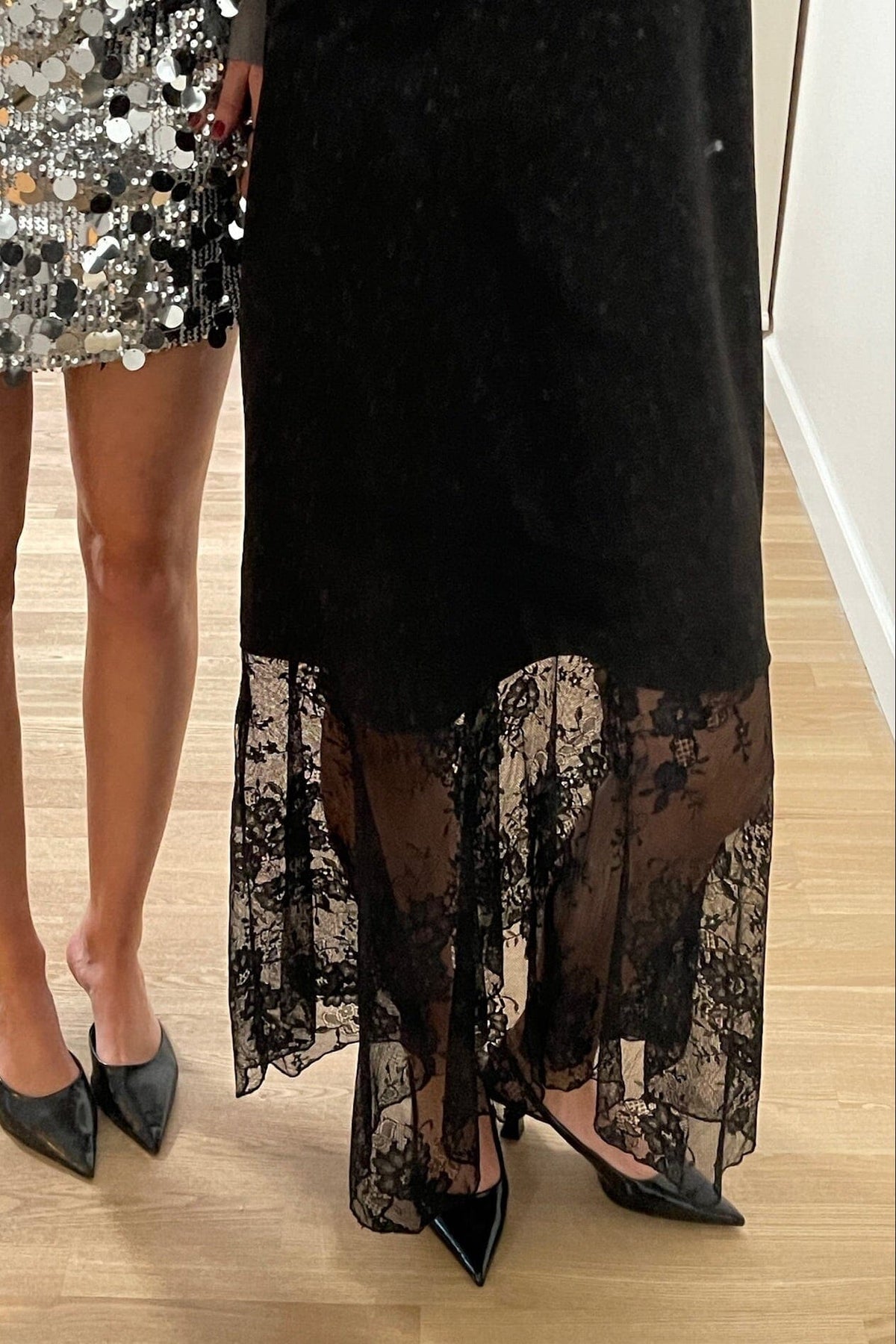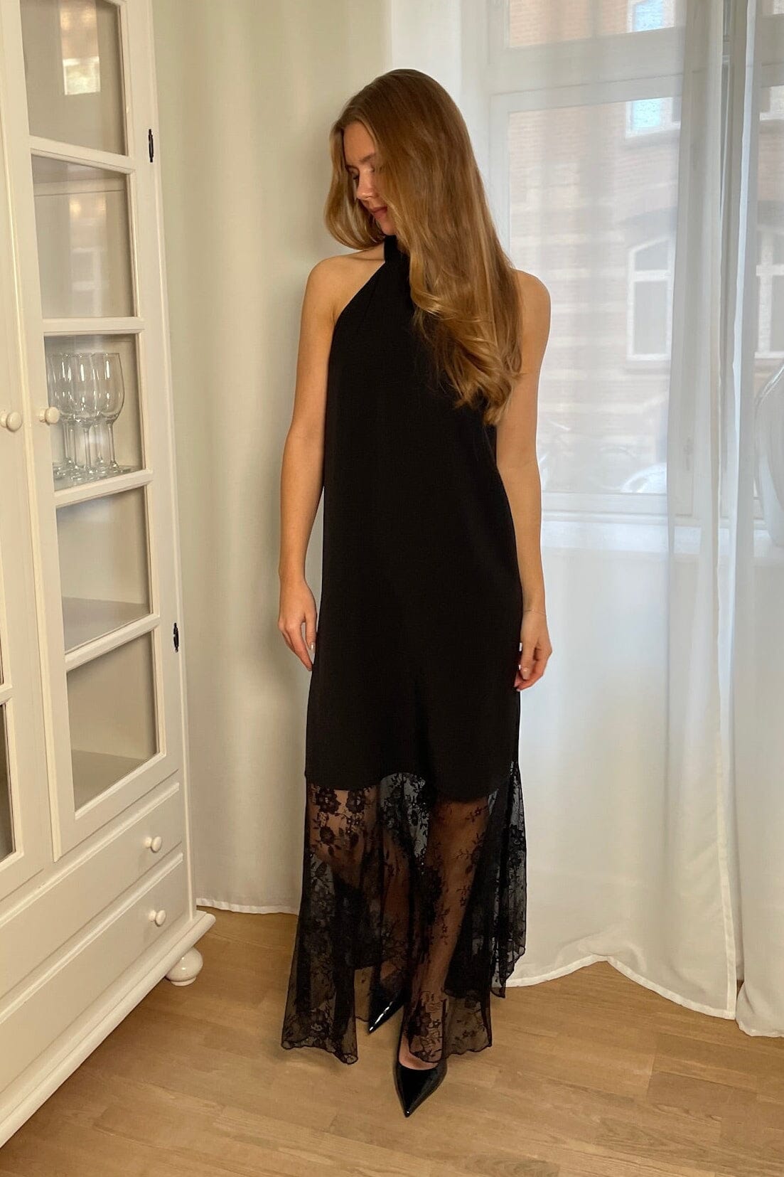 Svart ankellang kjole fra Sisters Point med høy halsutskjæring. Den ermeløse kjolen har blonder i den nederste delen og en løs passform, som gjør den egnet for festlige anledninger.