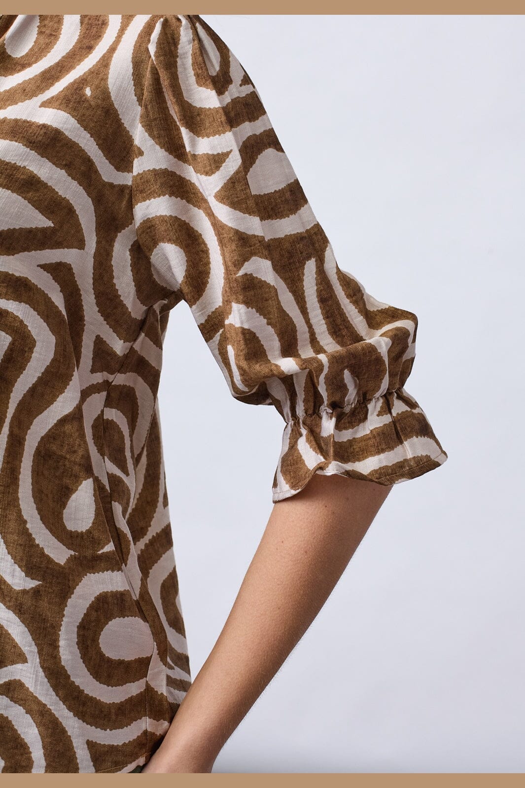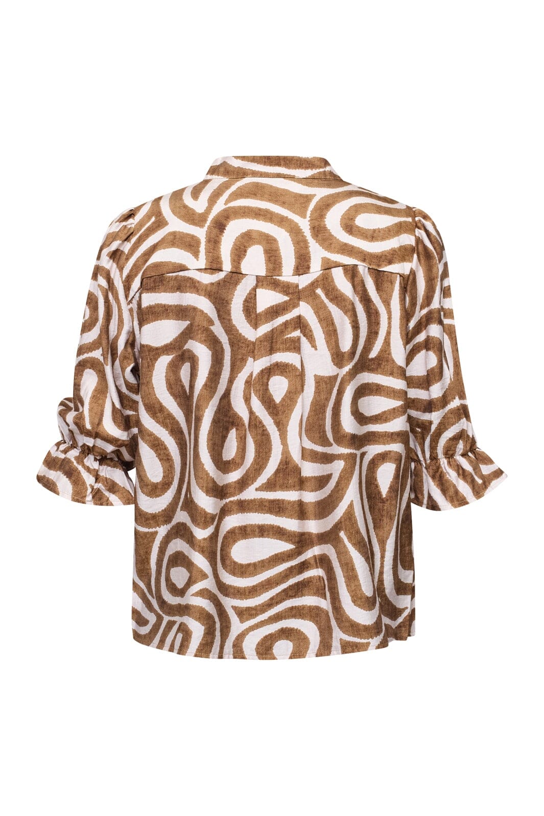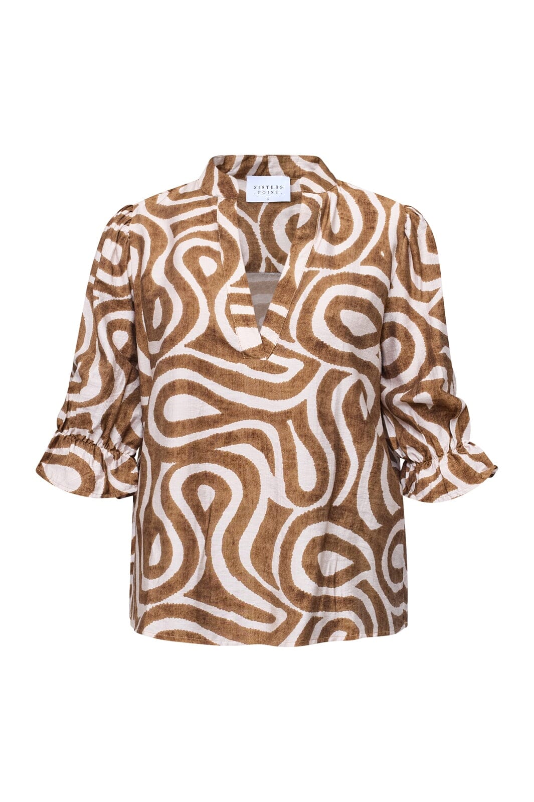 Bluse fra Sisters Point med brunt og beige etnisk virvelmønster. Blusen har V-utringning med kinakrage og trekvartsermer med volanger.