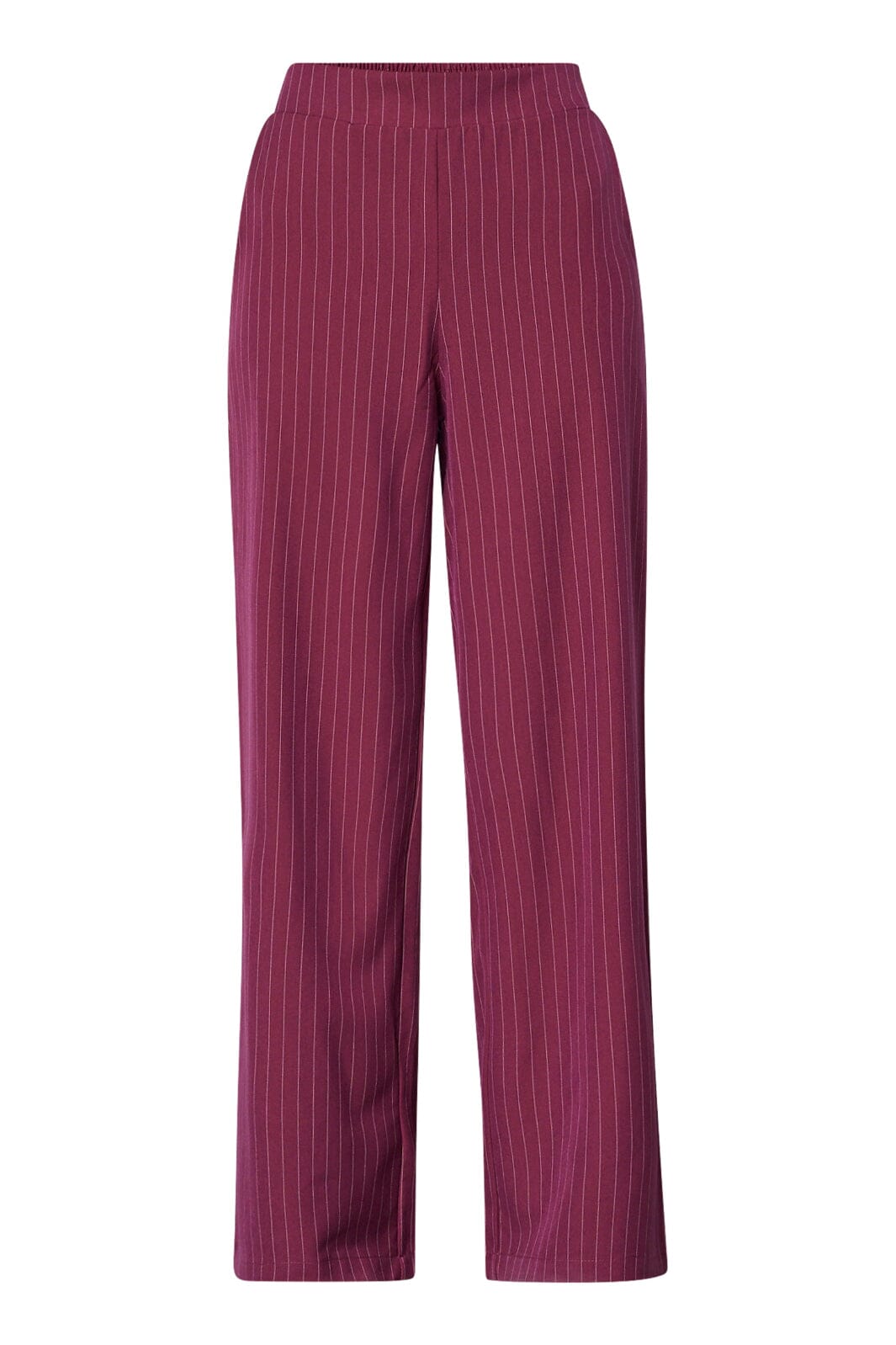 Bukse fra Sisters Point i burgunder og krem med vertikale nålestriper. Buksene har en løs passform, gulvlengde og en elastisk midje.