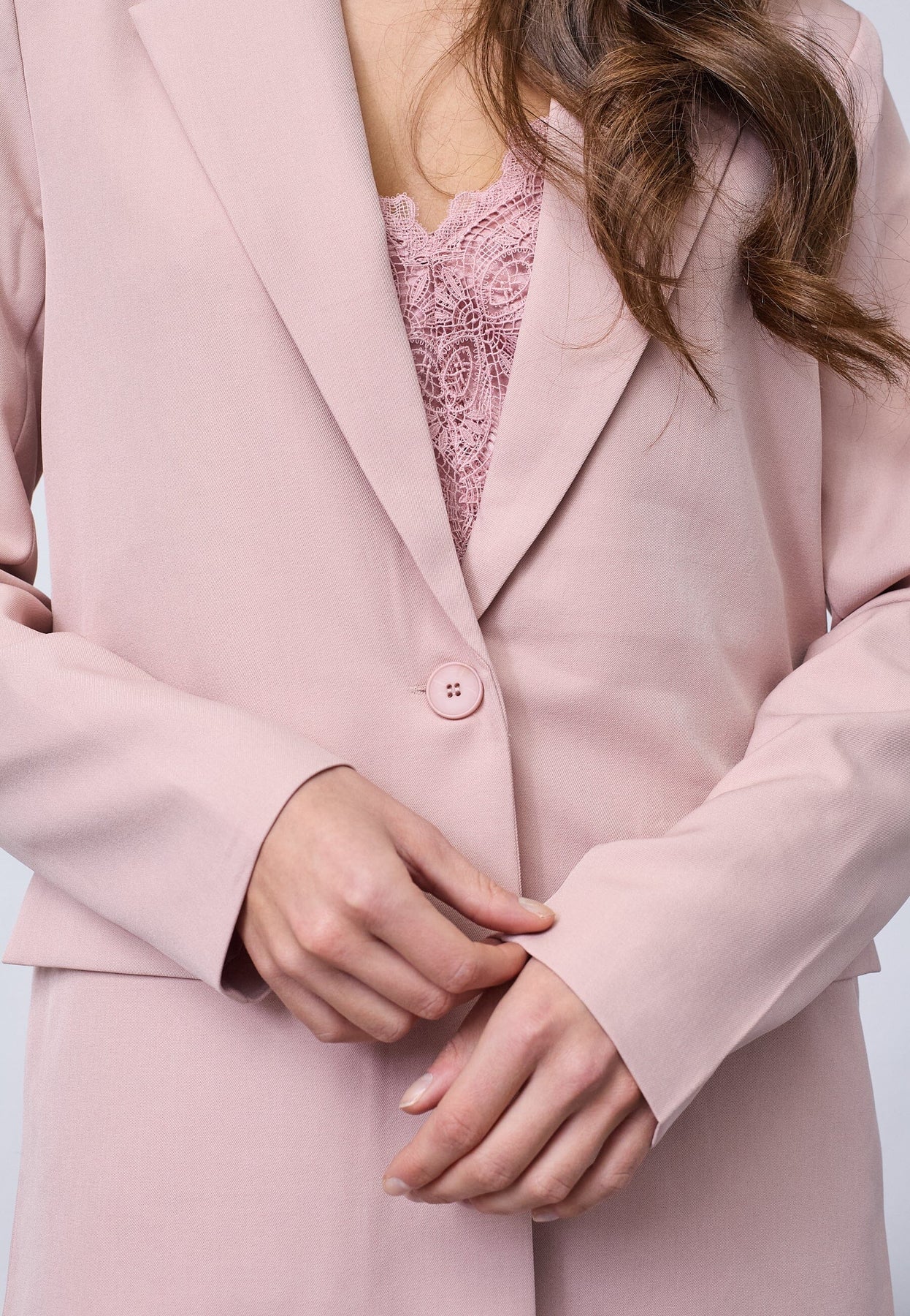 Blazer fra Sisters Point i en rosa-lilla nyanse. Blazeren har jakkeslag og knappelukking foran med tre pynteknapper på ermene.