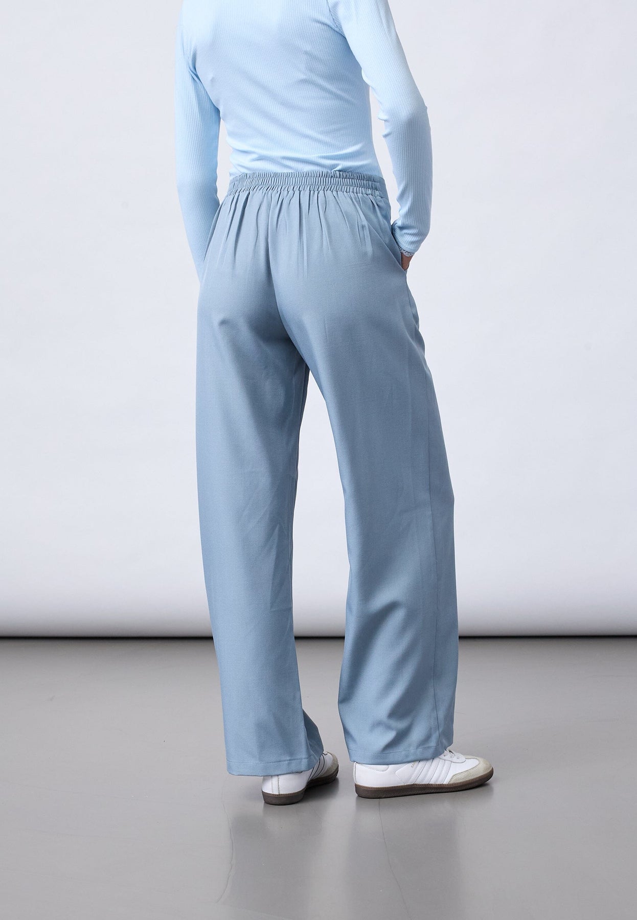 Lyseblå bukse fra Sisters Point med høyt liv og løs passform. Buksen har vide ben og ankellengde.