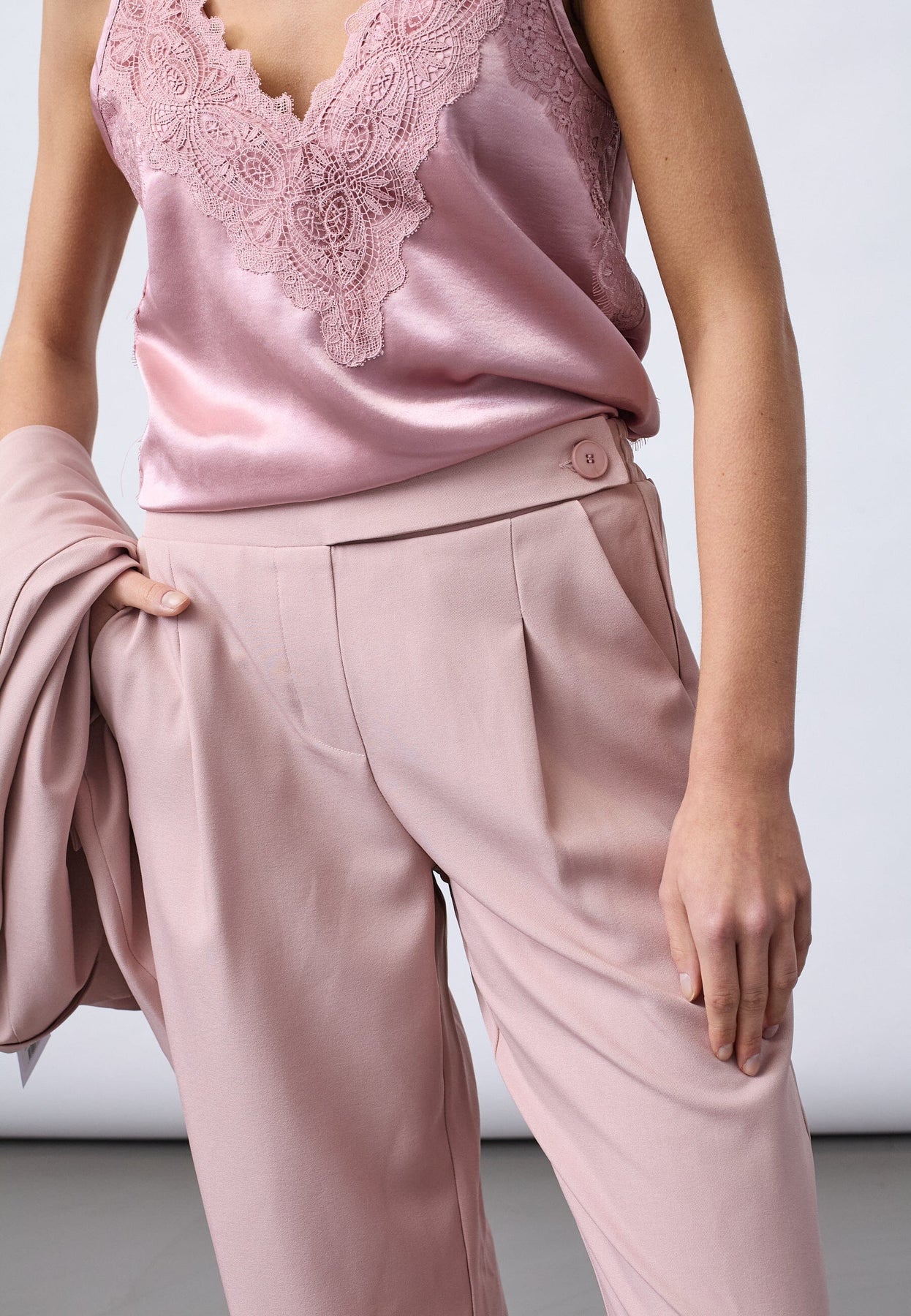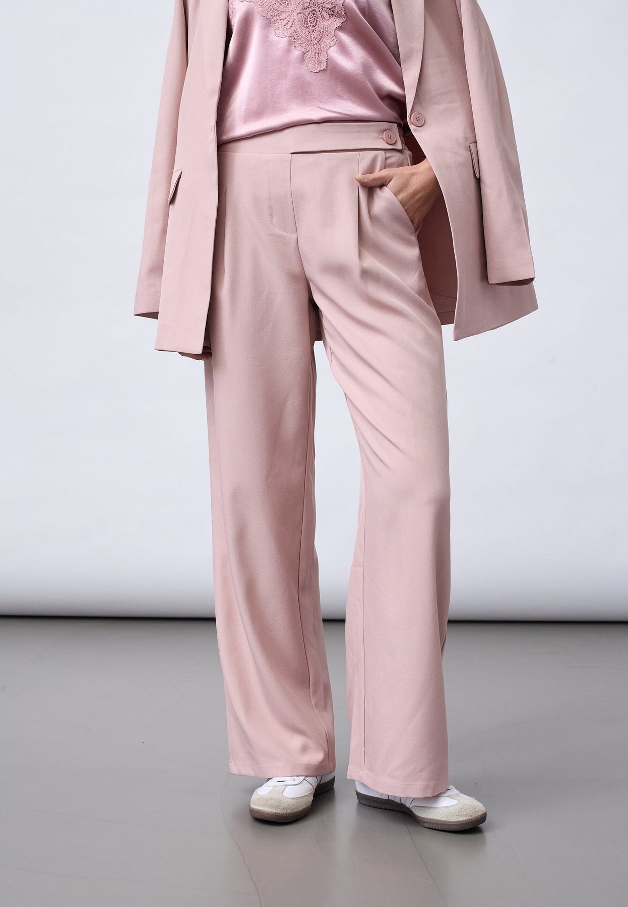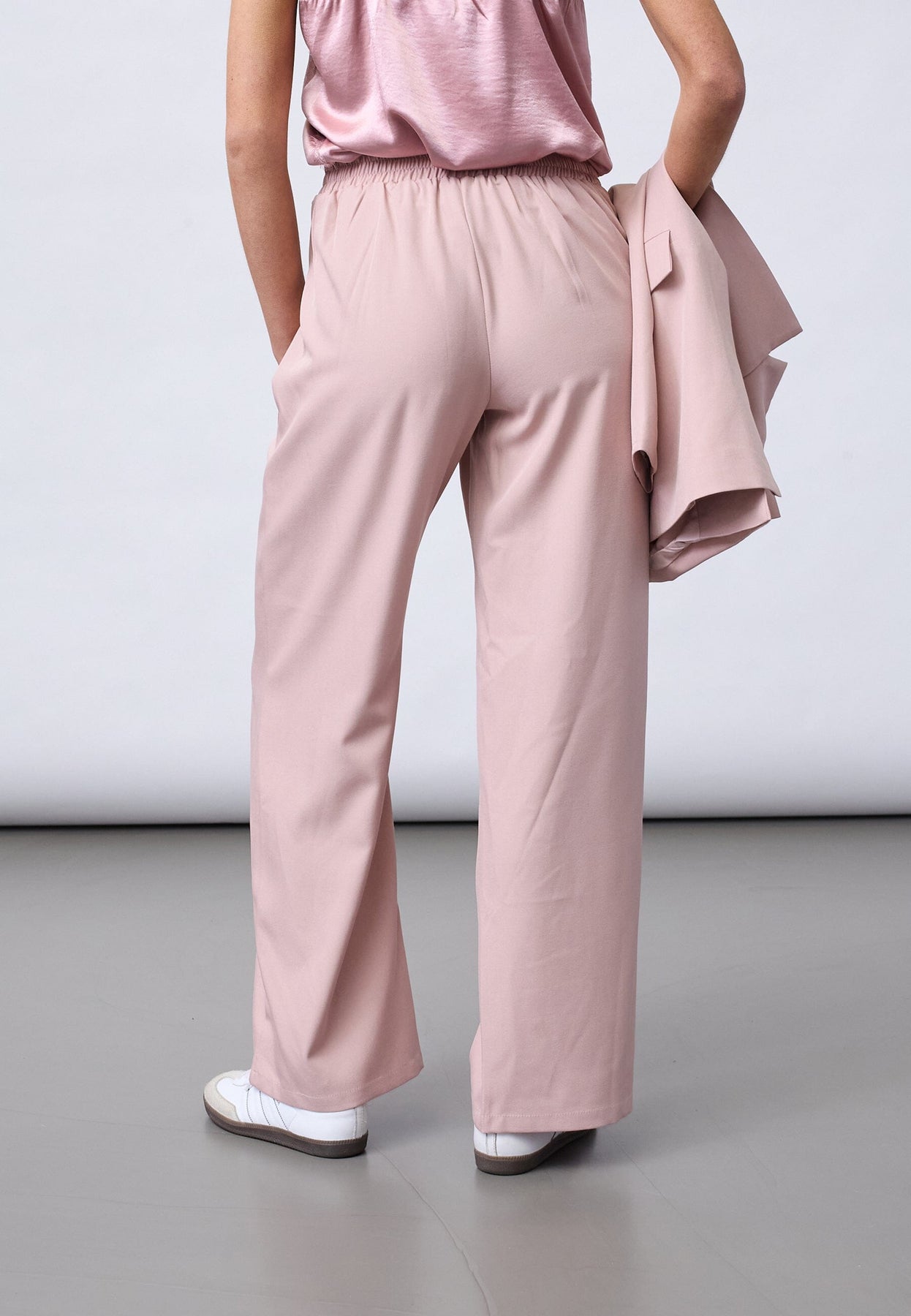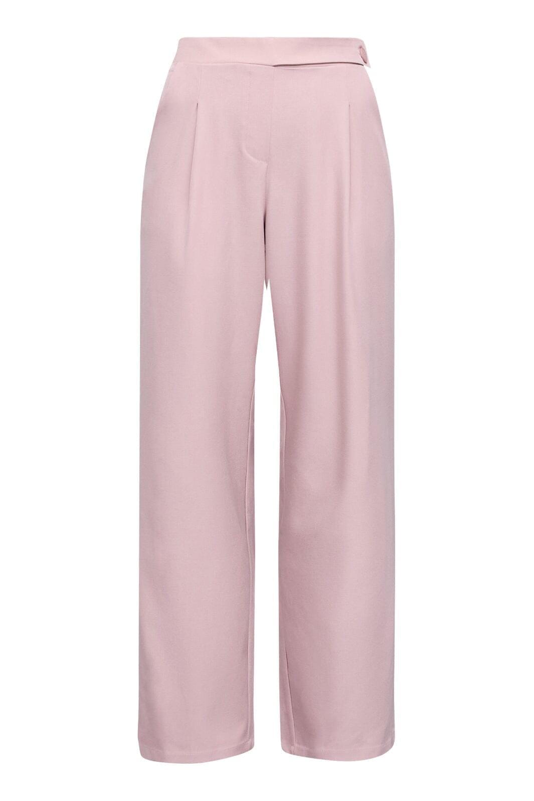 Lilla bukser fra Sisters Point med vid passform og rette ben. Buksene har høyt liv, strikk bak og knappdetalj i siden.