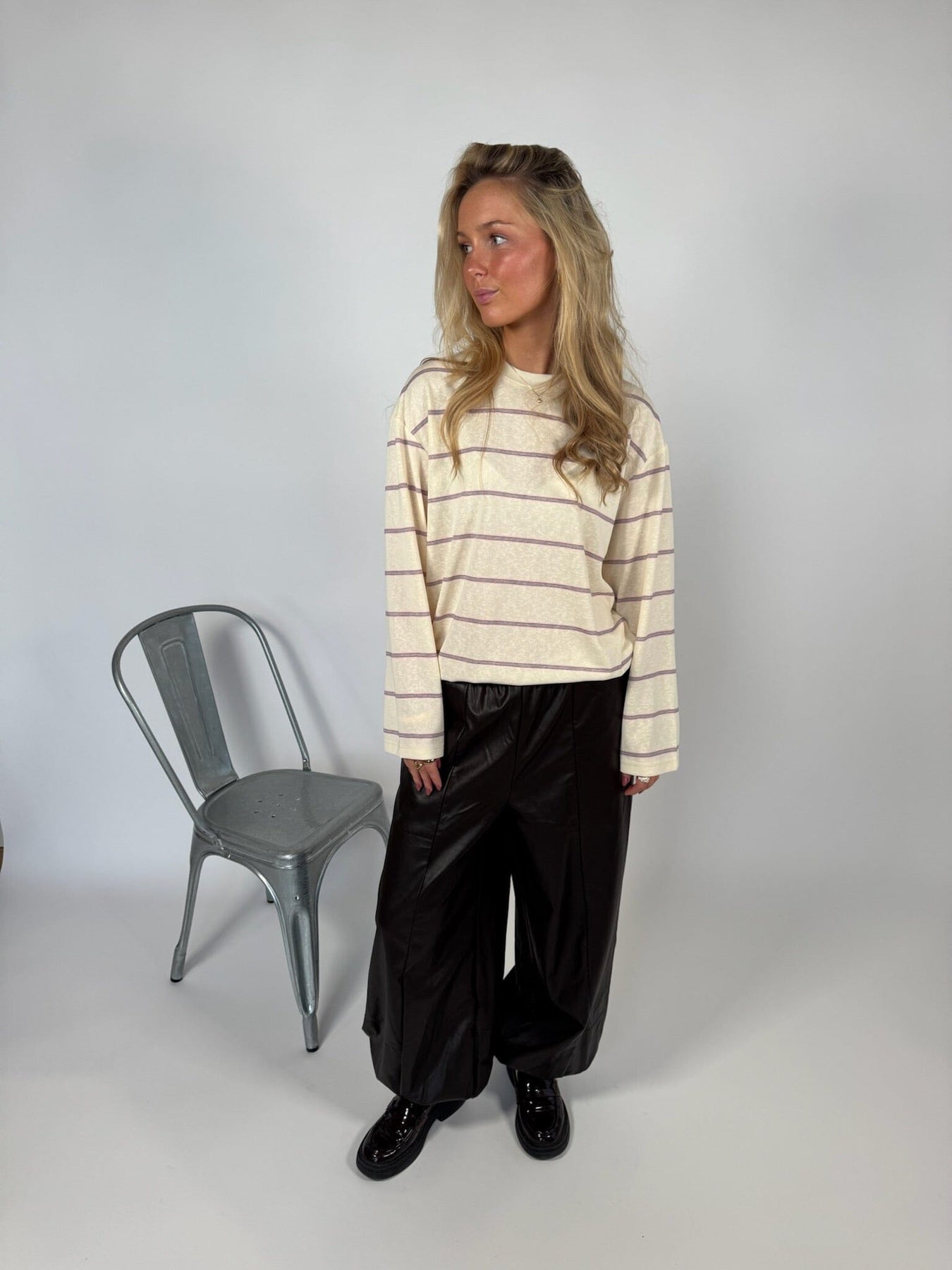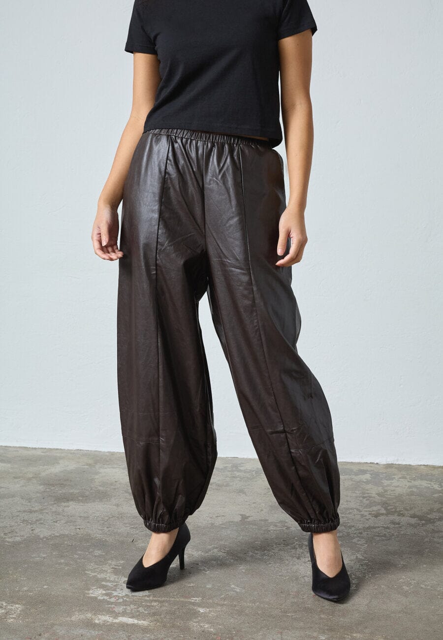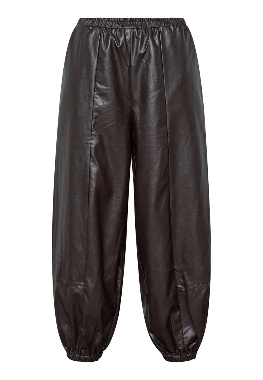 Bukser fra Sisters Point i mørk brun med et skinnlignende polyestermateriale. Buksene har en løs, ballongformet silhuett med høy midje og ankellengde.