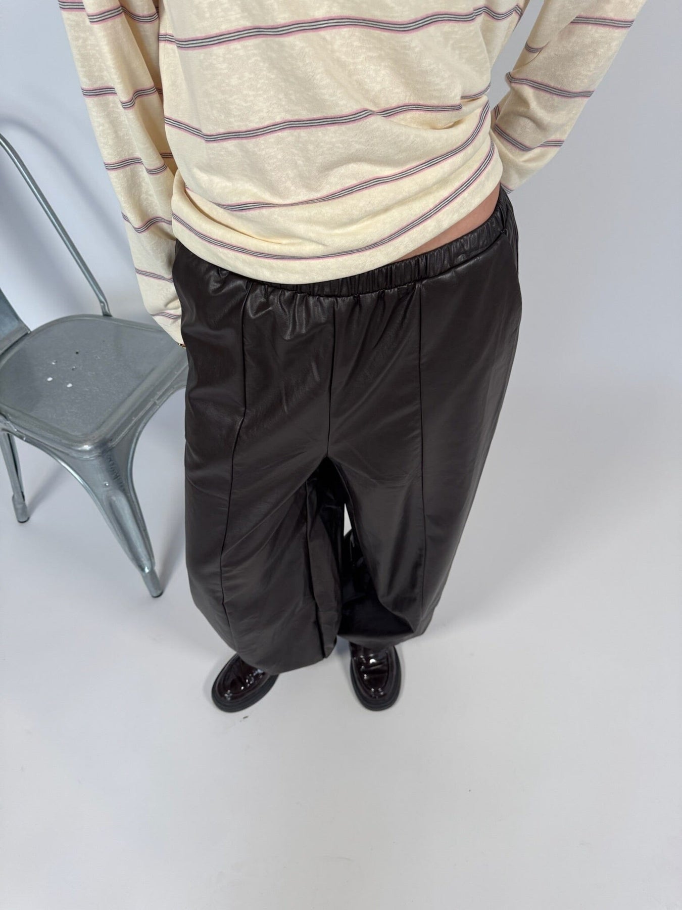 Bukser fra Sisters Point i mørk brun med et skinnlignende polyestermateriale. Buksene har en løs, ballongformet silhuett med høy midje og ankellengde.