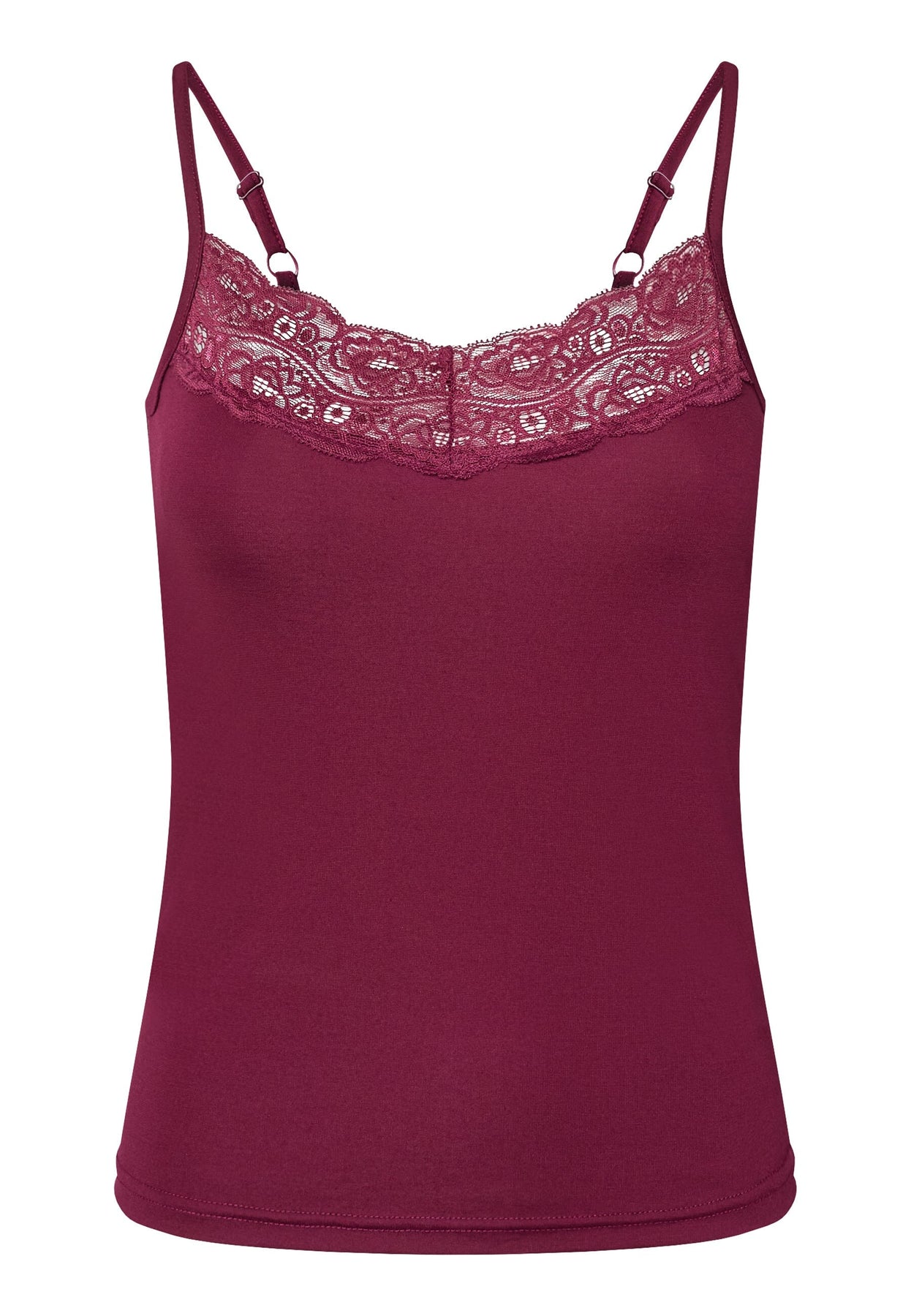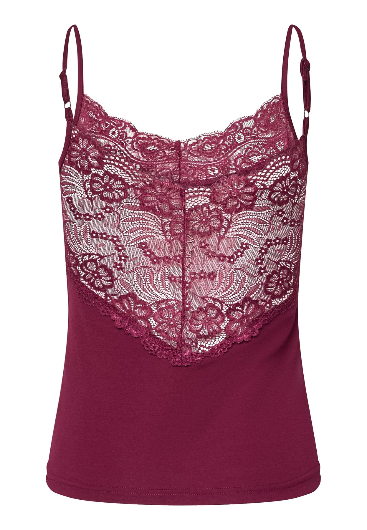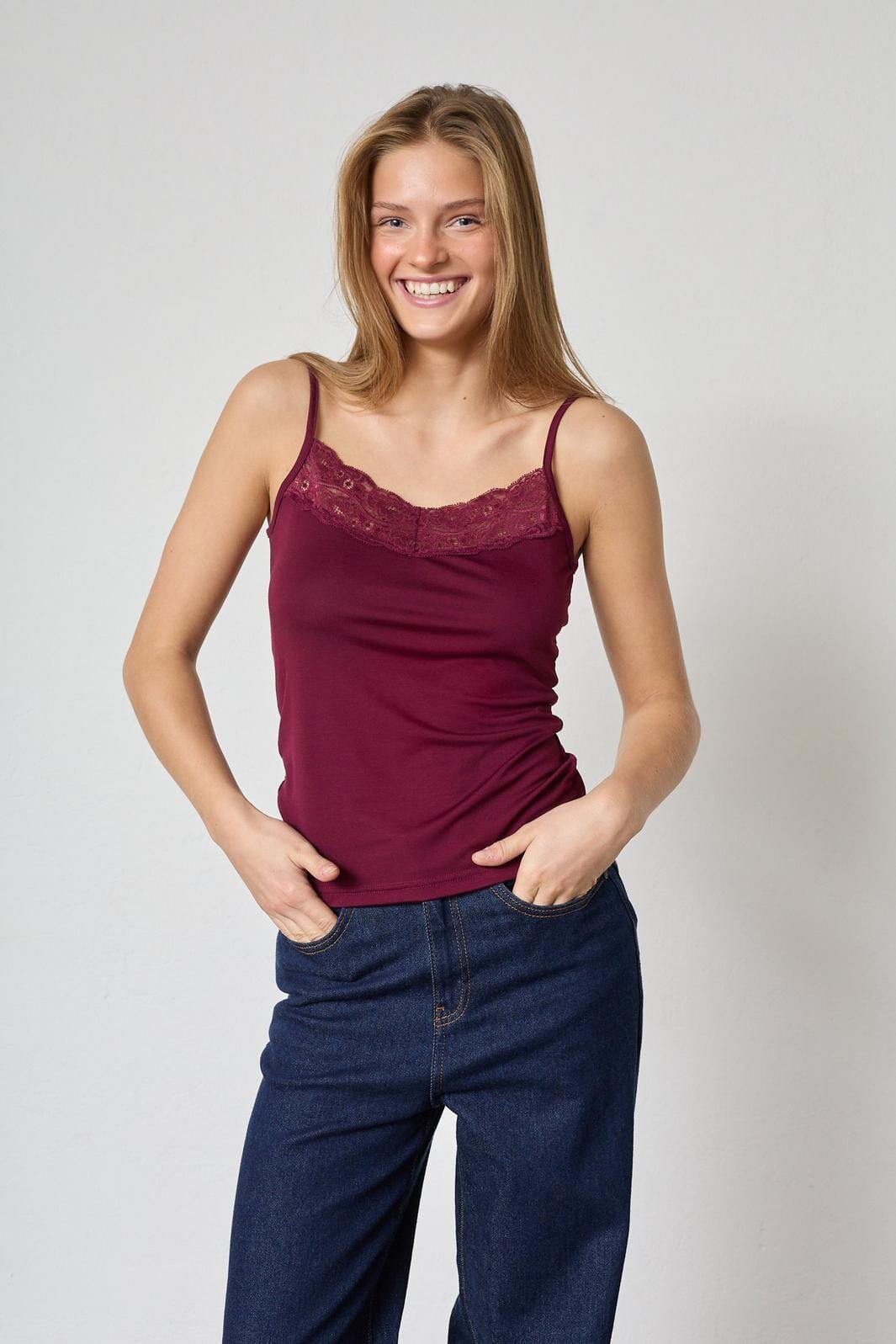 Topp fra Sisters Point i dyp bordeauxfarge med blondedetaljer ved halsutskjæringen. Toppen har justerbare spagettistropper og en tettsittende passform.