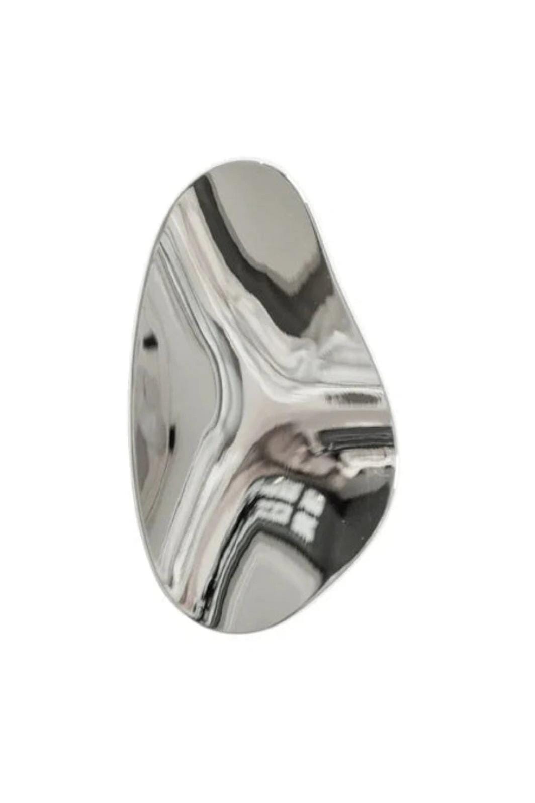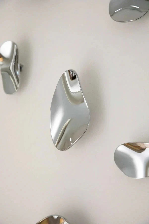 En avlang knagg fra Specktrum, laget av hard sinkmetall med en skinnende kromfinish i sølv. Designet har en organisk, asymmetrisk form.