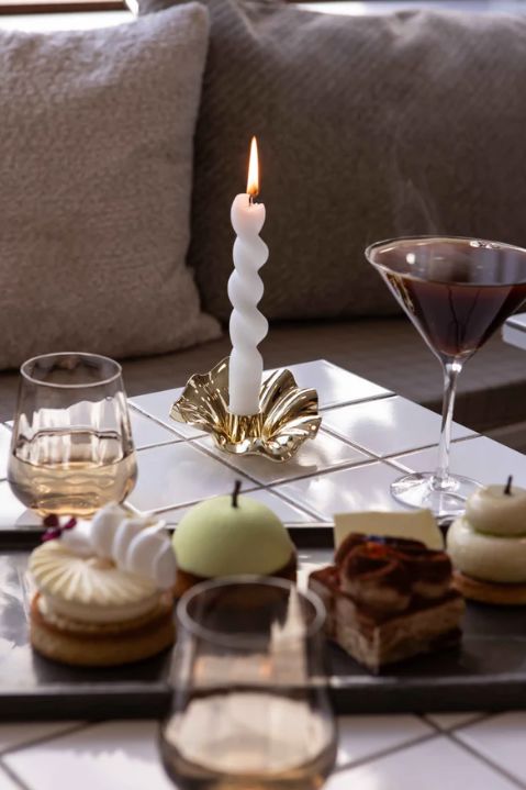 En gylden lysestake fra Specktrum med en bølgende form. Lysestaken er laget av metall og har en skinnende gullfarget overflate.