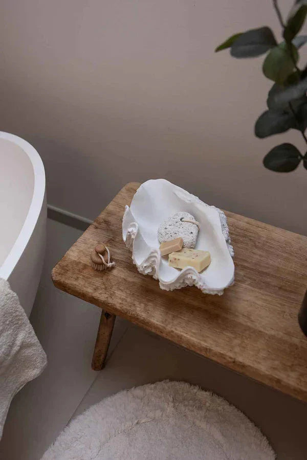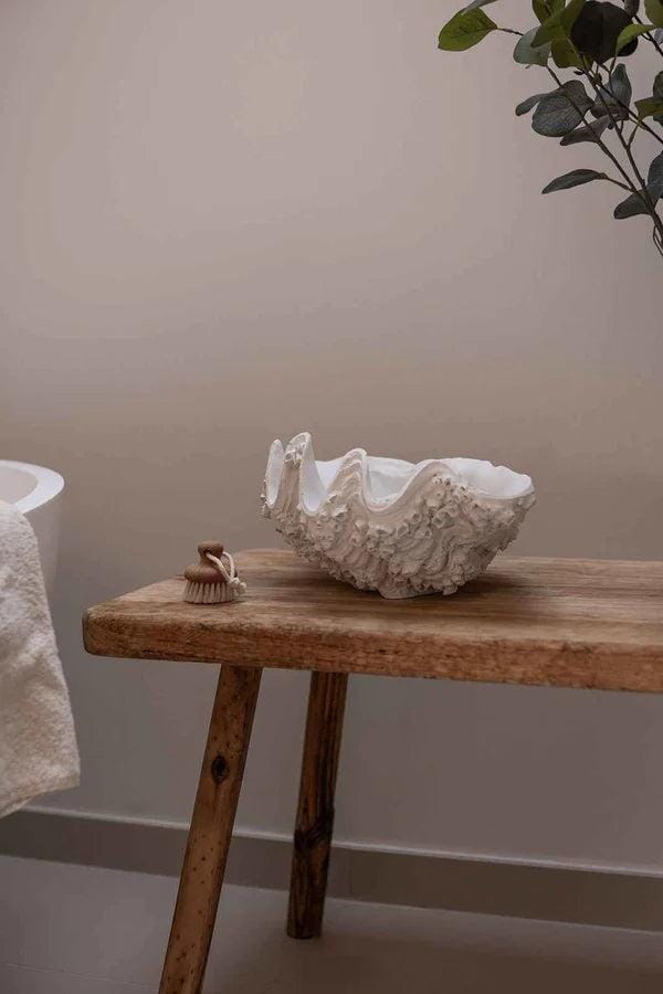 Hvit skål fra Specktrum med muslingeskallform. Den har en overflate med naturlige mønstre og en glatt, blank innside. Skålen kombinerer dekorativ stil med praktisk funksjon.