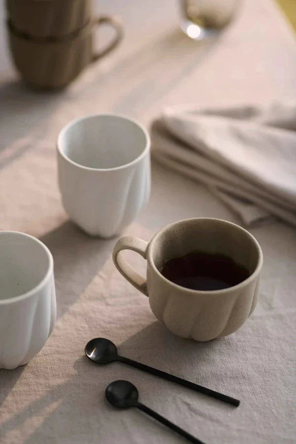 Keramisk kopp fra Specktrum med bølgende linjer i overflaten. Den off-white koppen har en lett innsnevret form mot bunnen og er designet uten hank for et rent uttrykk.