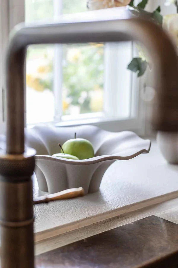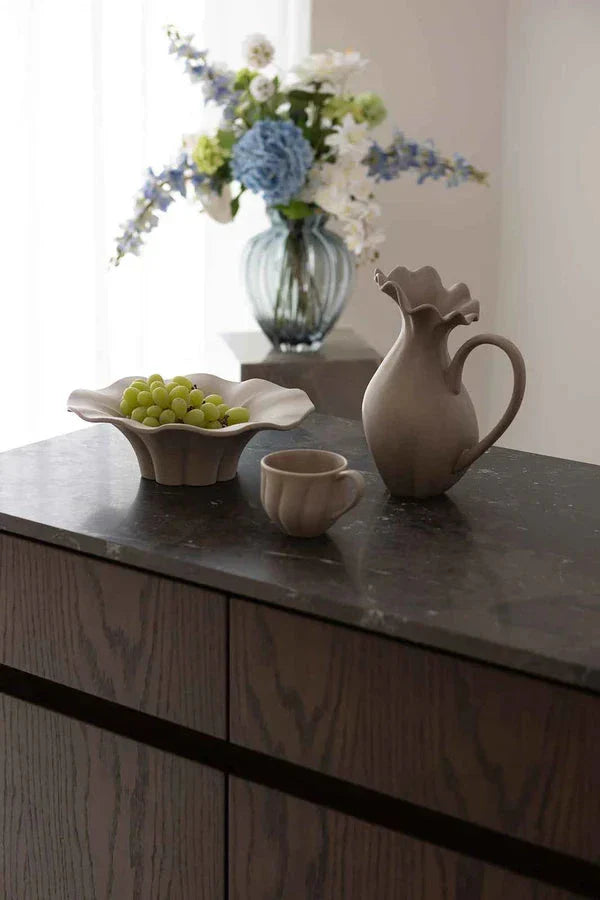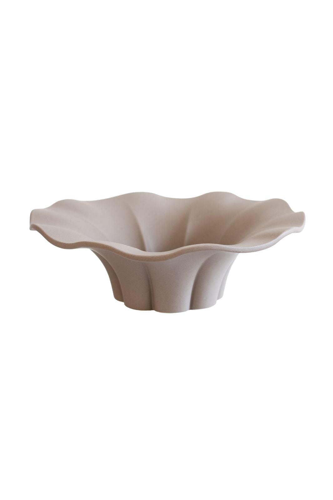 Sandfarget keramisk bolle fra Specktrum med bølget kant og matt overflate. Bollen er fremstilt gjennom tradisjonelt håndverk, noe som gir hvert stykke sitt eget særpreg.