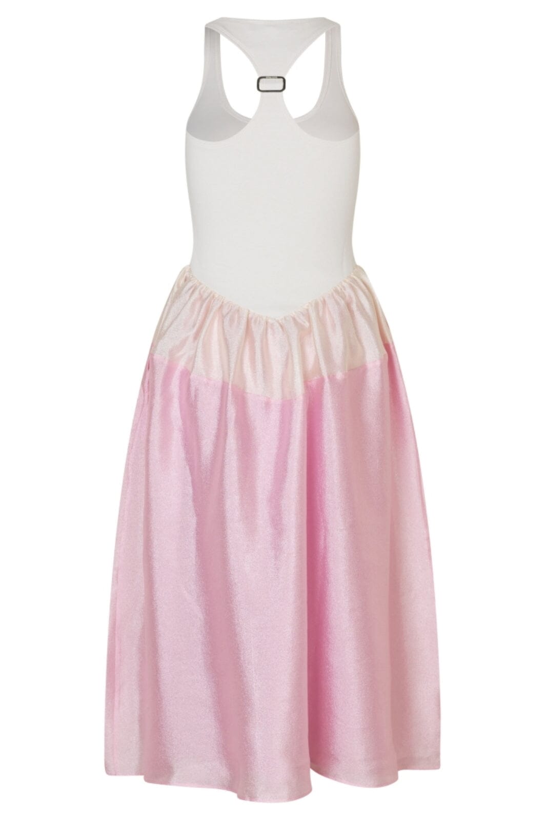 Lang kjole fra Stine Goya med hvit tanktop-overdel og en skinnende skjørt i pastellrosa. Kjolen kombinerer sporty og elegant design gjennom sin todelte konstruksjon.