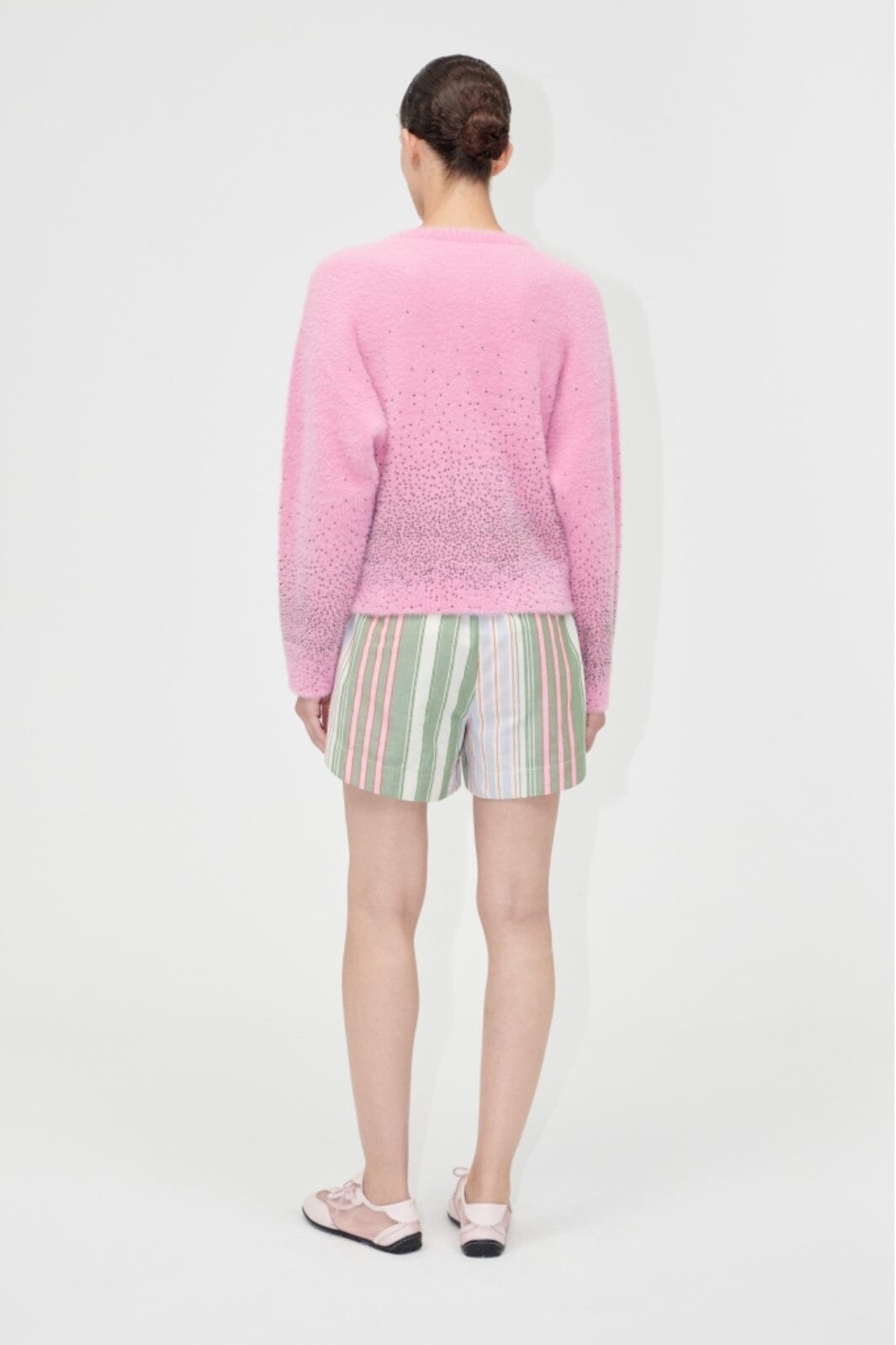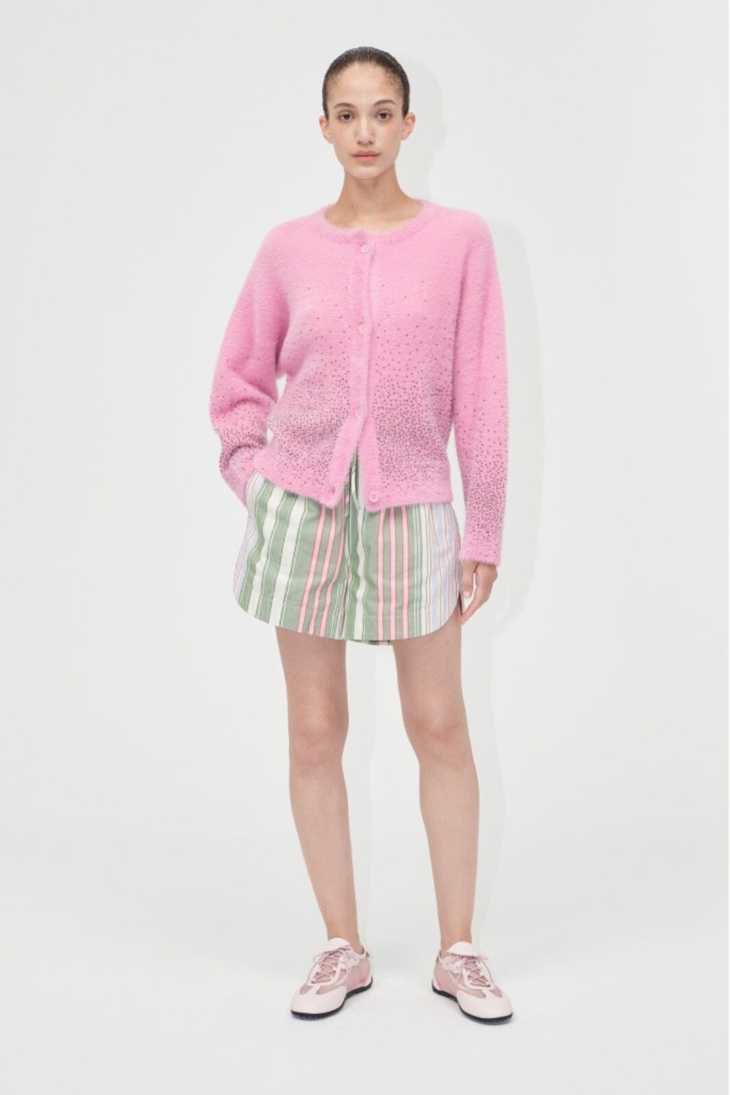 Rosa cardigan fra Stine Goya med en myk, fluffy strikk. Cardiganen har paljetter og perler fordelt i et ombre-mønster med prikker som går fra tett til spredt besetning.