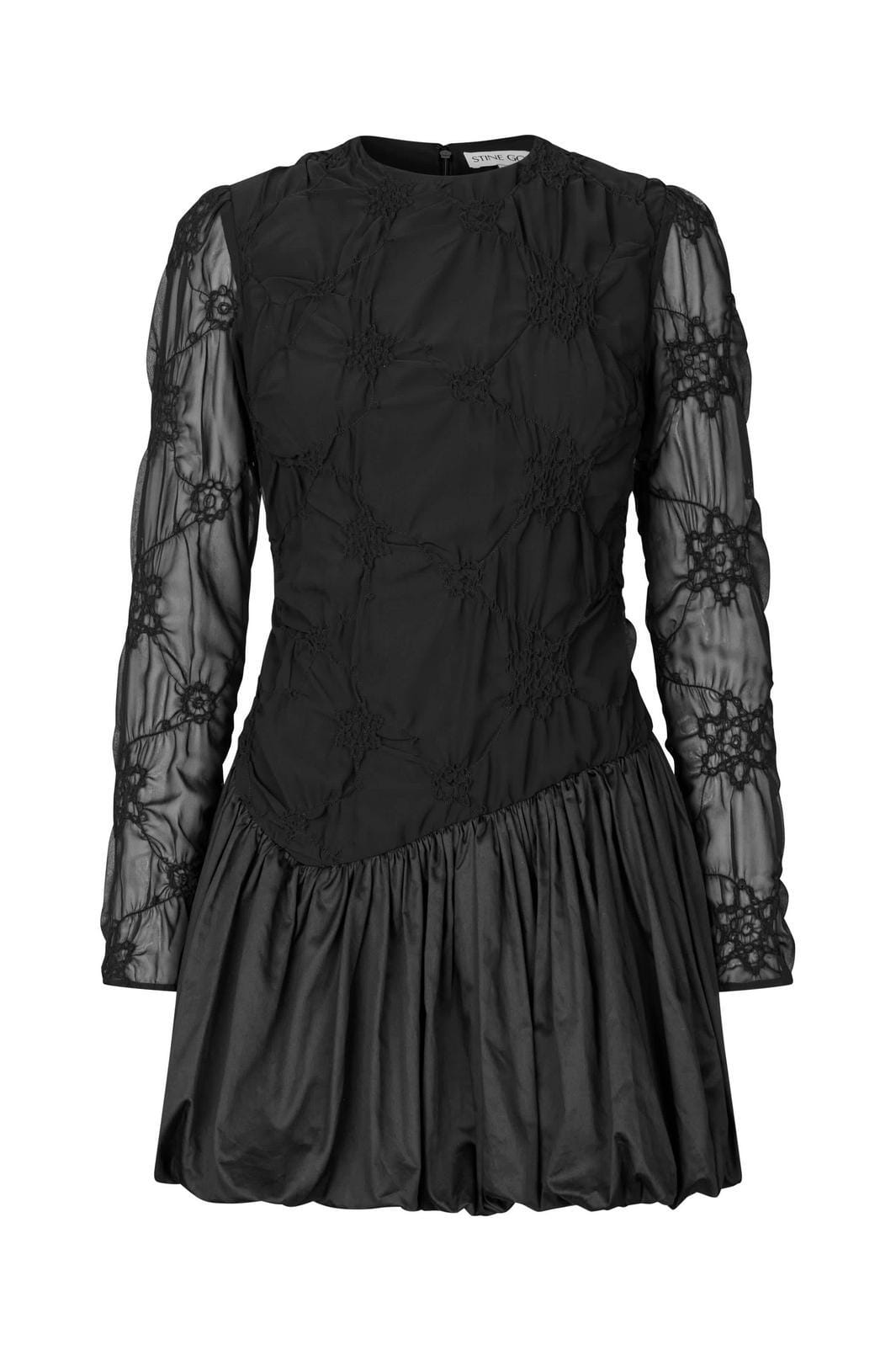 Sort kjole fra Stine Goya med smockdesign og blomsterbroderi. Kjolen har gjennomsiktige ballongermer med blomsterdetaljer og et kort, ballongformet skjørt.