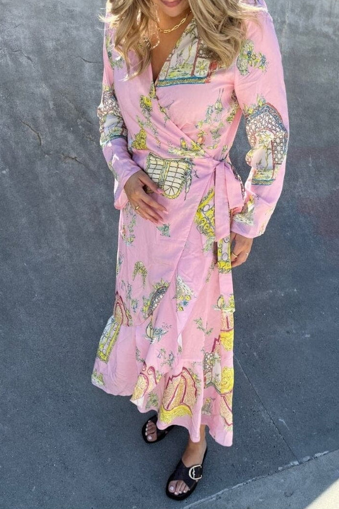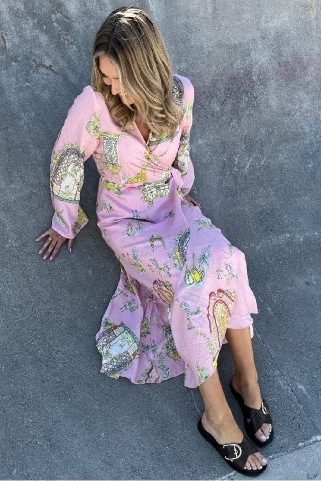 Rosa kjole fra Stories From The Atelier by Copenhagen Shoes, laget av viskose med et pastellmønster i flere farger. Kjolen har lange ermer og V-hals.