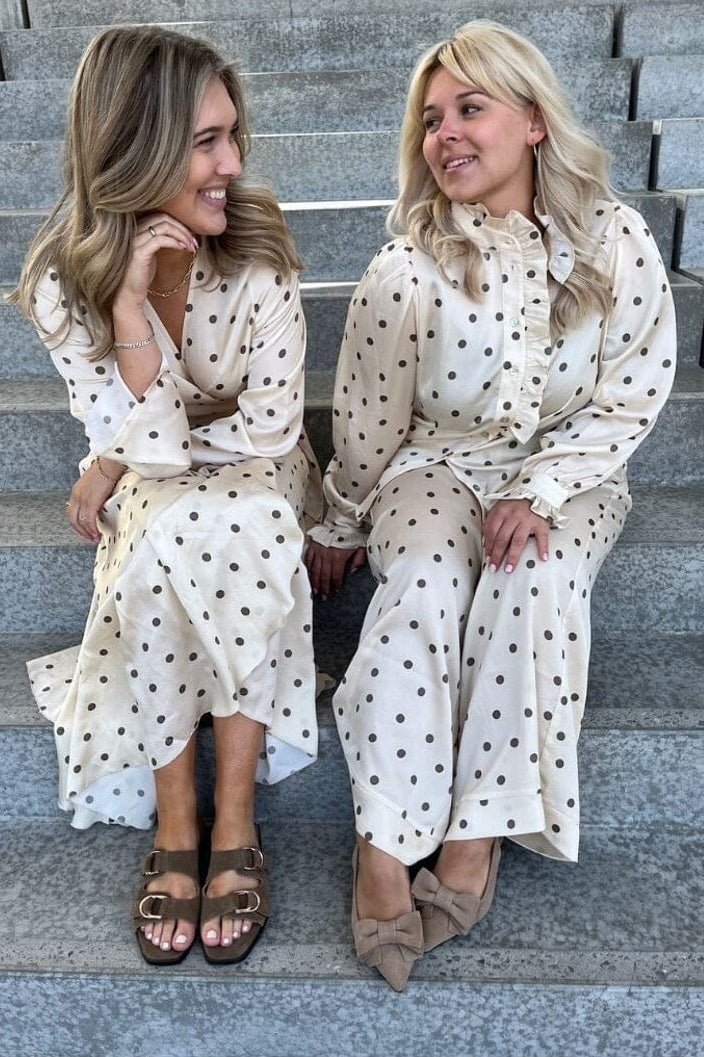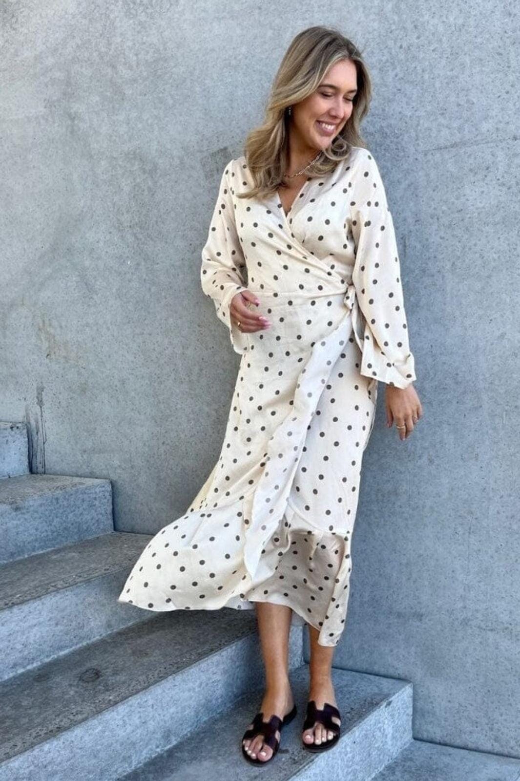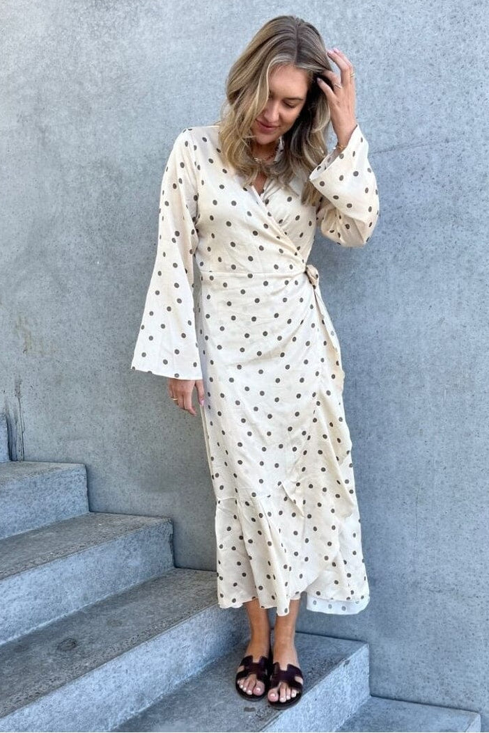 Kjole fra Stories From The Atelier By Copenhagen Shoes i offwhite med brune prikker. Kjolen har lange ermer og en V-hals med omslagseffekt.