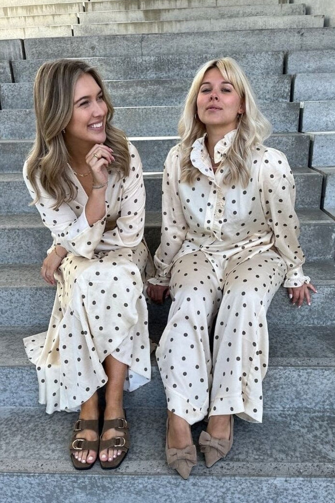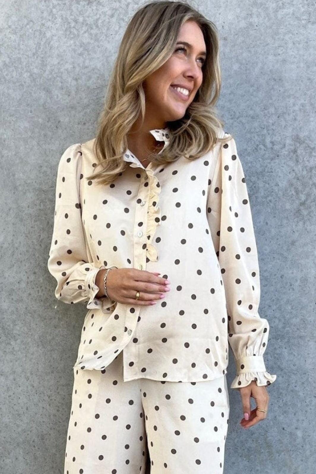 En offwhite skjorte med brune prikker fra Stories From The Atelier by Copenhagen Shoes. Skjorten har volangdetaljer ved kragen og knappelukking foran.