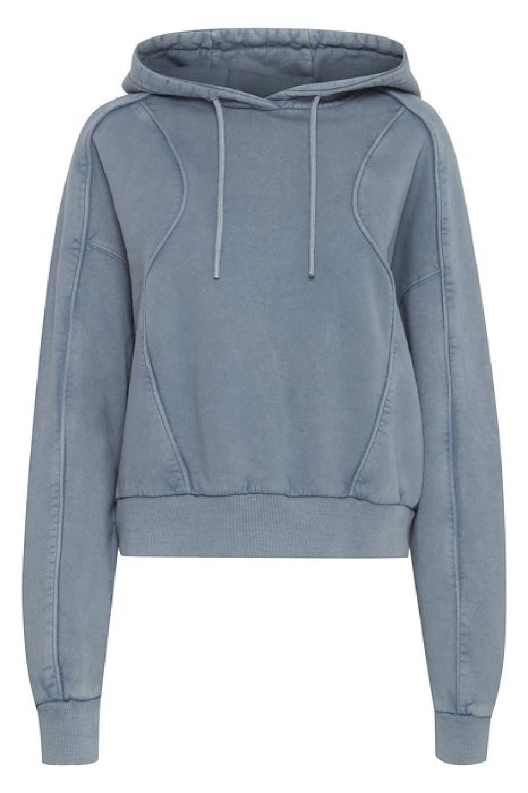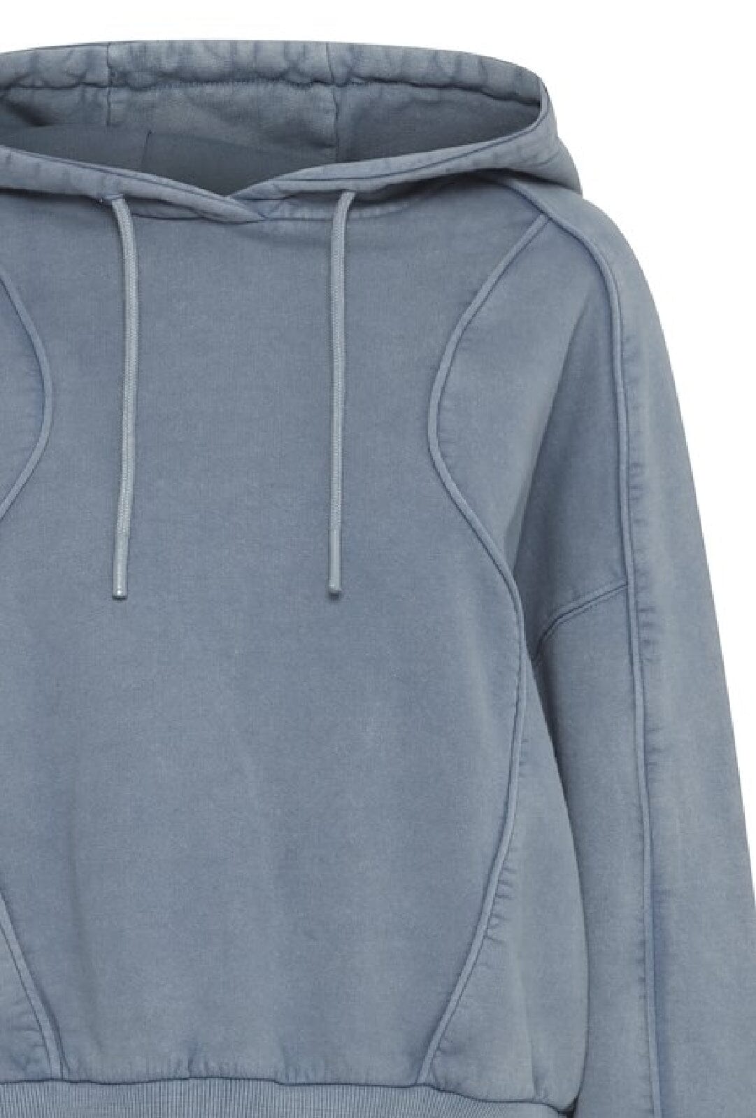 Cropped hoodie fra The Jogg Concept i en mørkeblå Bering Sea-farge. Den løse passformen gir god bevegelsesfrihet, mens de dekorative sømmene skaper interessante linjer.