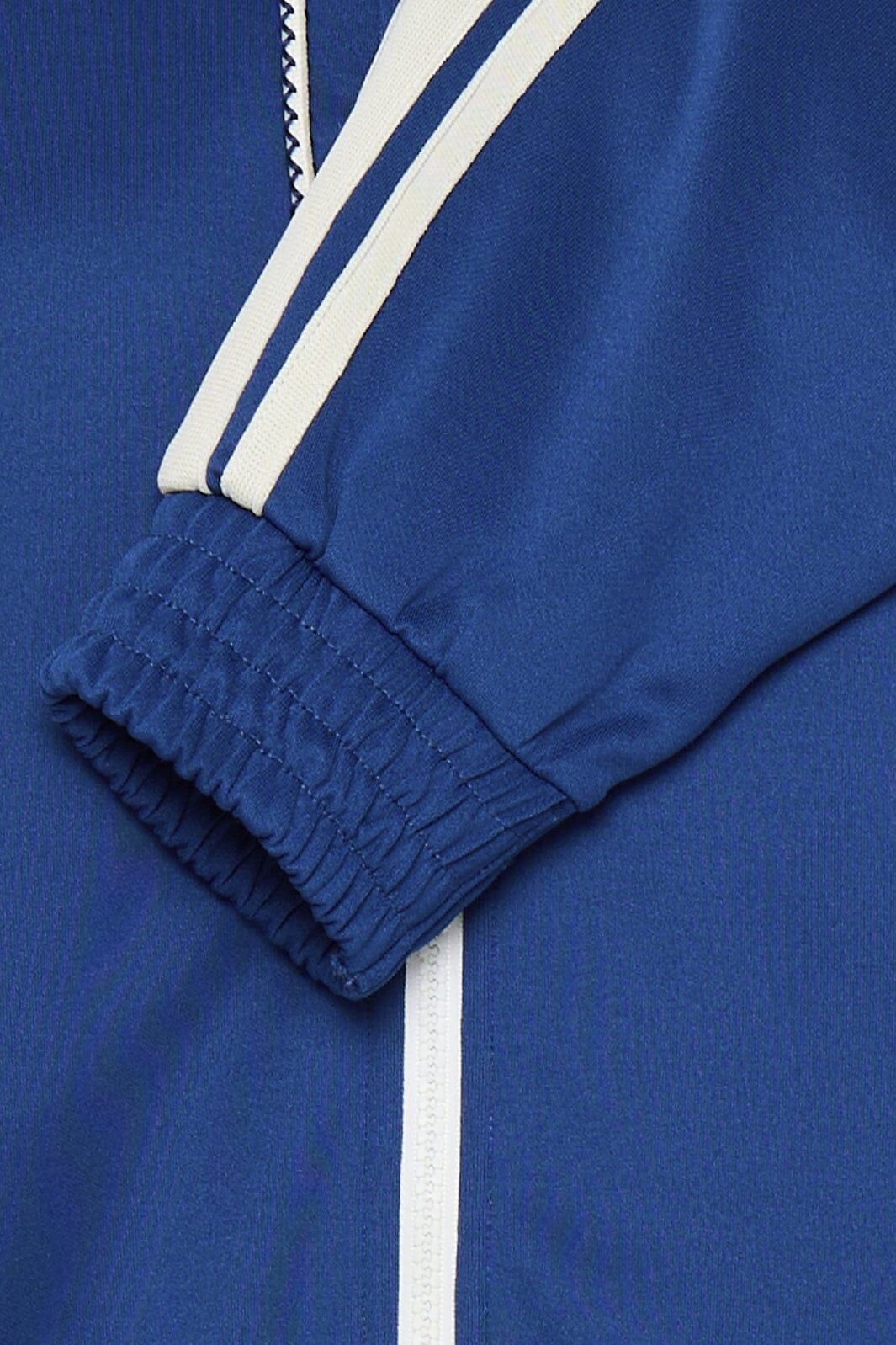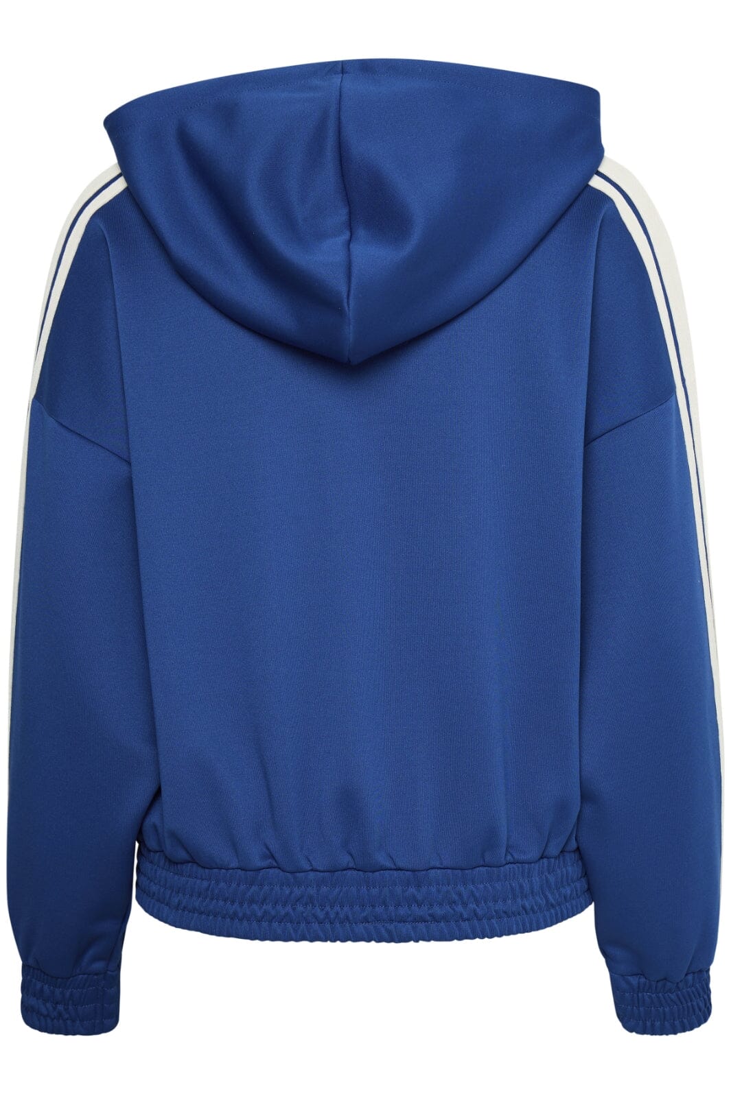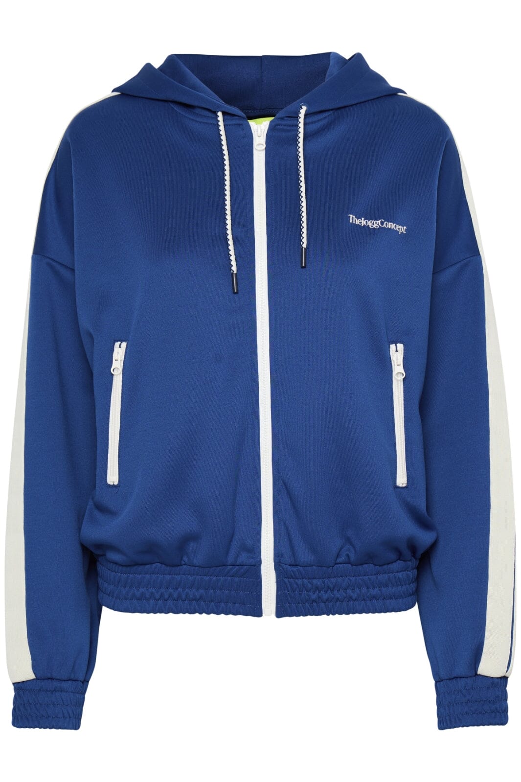 Hoodie fra The Jogg Concept i mørkeblå med hvite striper langs ermene. Den høye halsen med hette og glidelås gir god beskyttelse mot vind og vær.