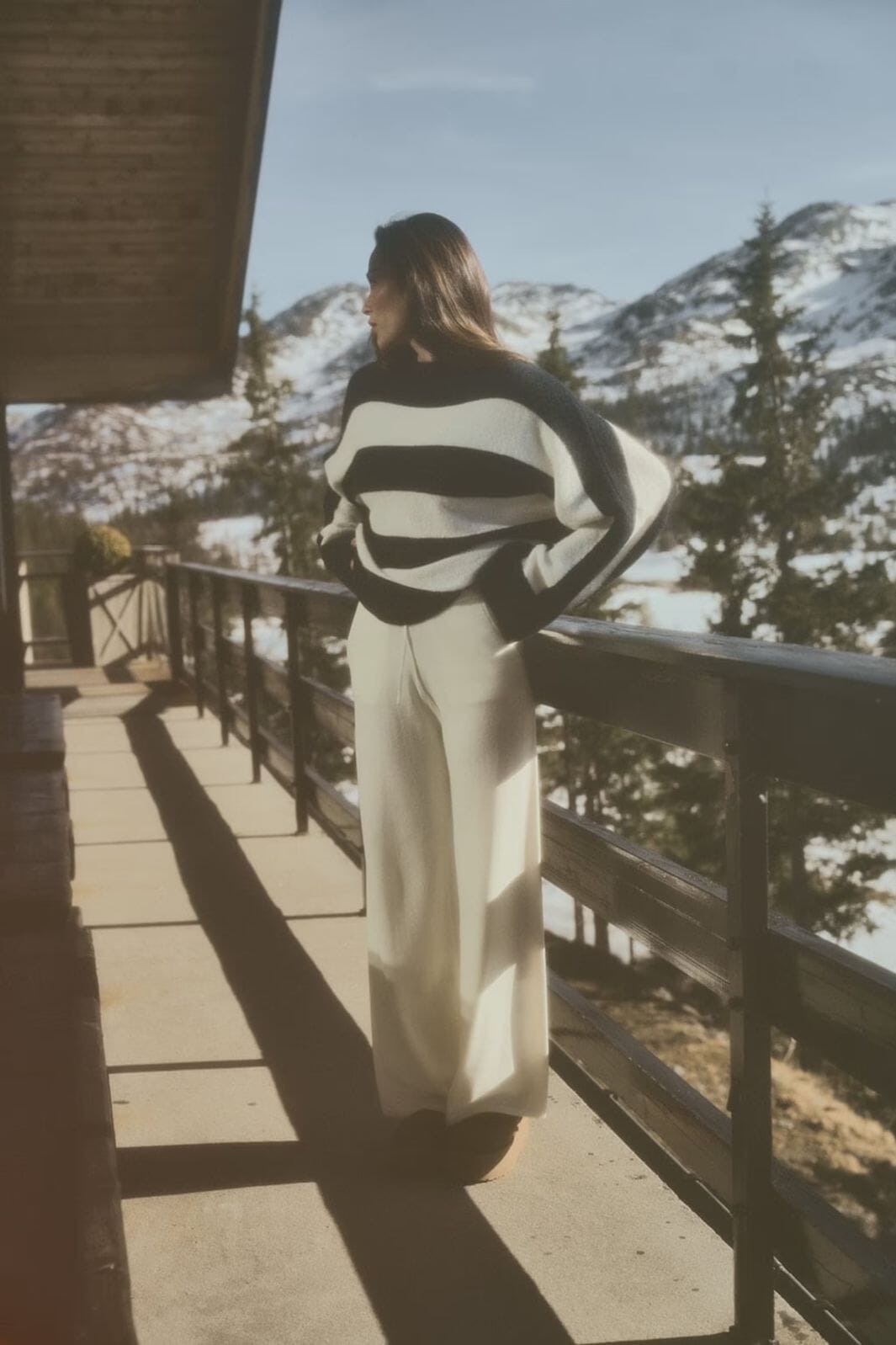 Strikkegenser fra Twist & Tango med brede horisontale striper i mørkeblått og hvitt. Genseren har en oversized passform og lange ermer.