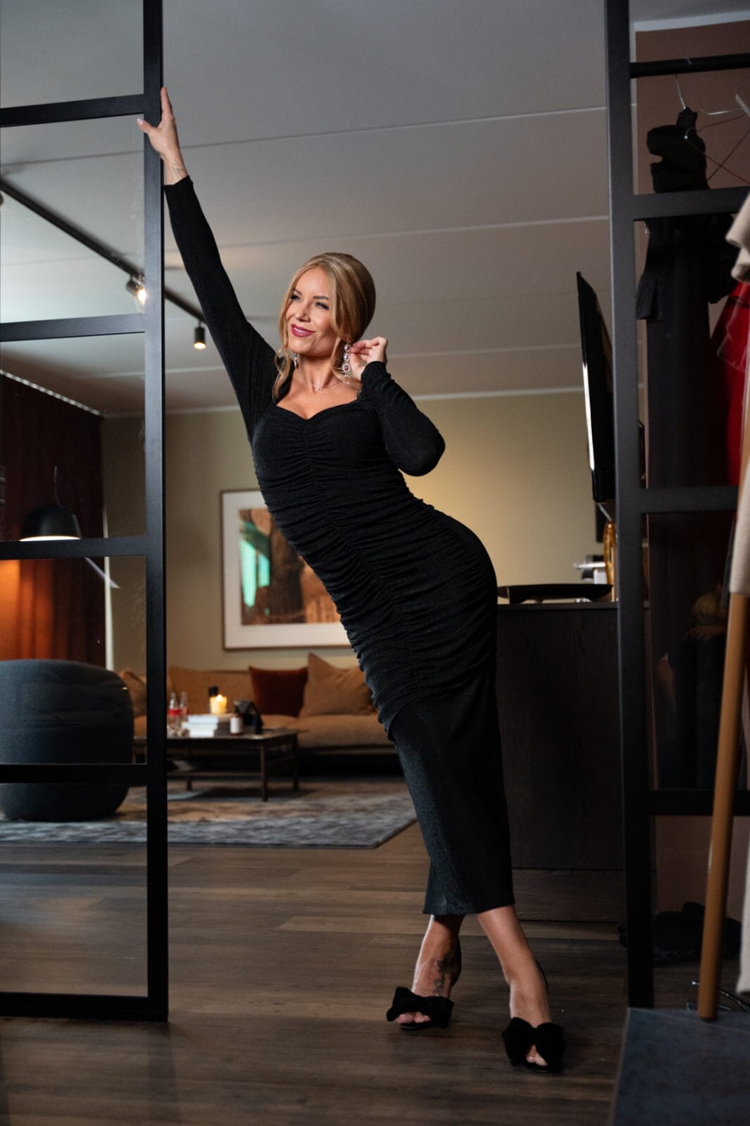 Svart festkjole fra Valentin Studio med rynkedetaljer gjennom hele kjolen. Den har lange ermer og en sweetheart-halsutskjæring som fremhever kroppens naturlige linjer.