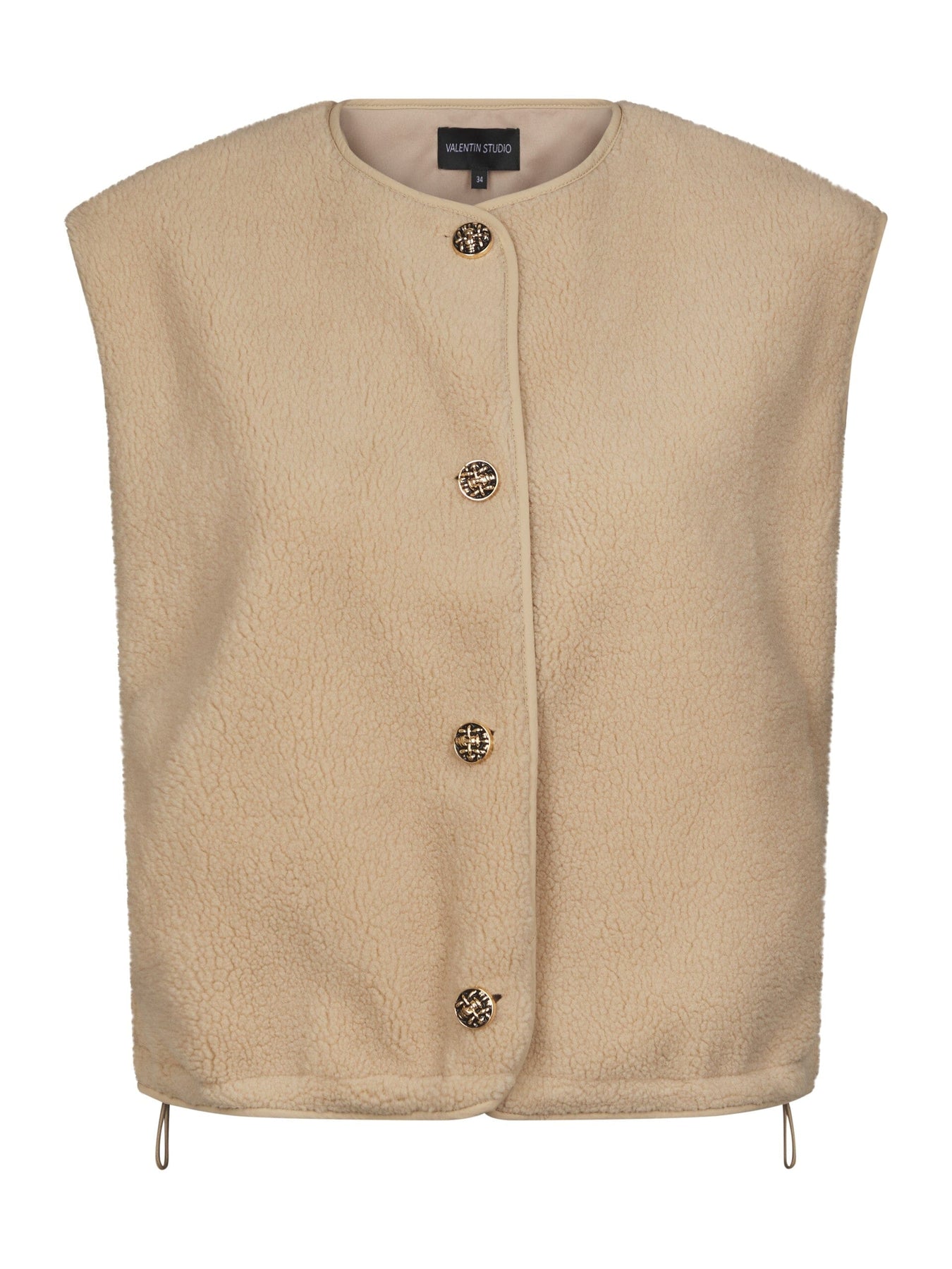 Sandfarget fluffy vest fra Valentin Studio. Den har knappelukking foran og et ermeløst design med rund halsutringning.