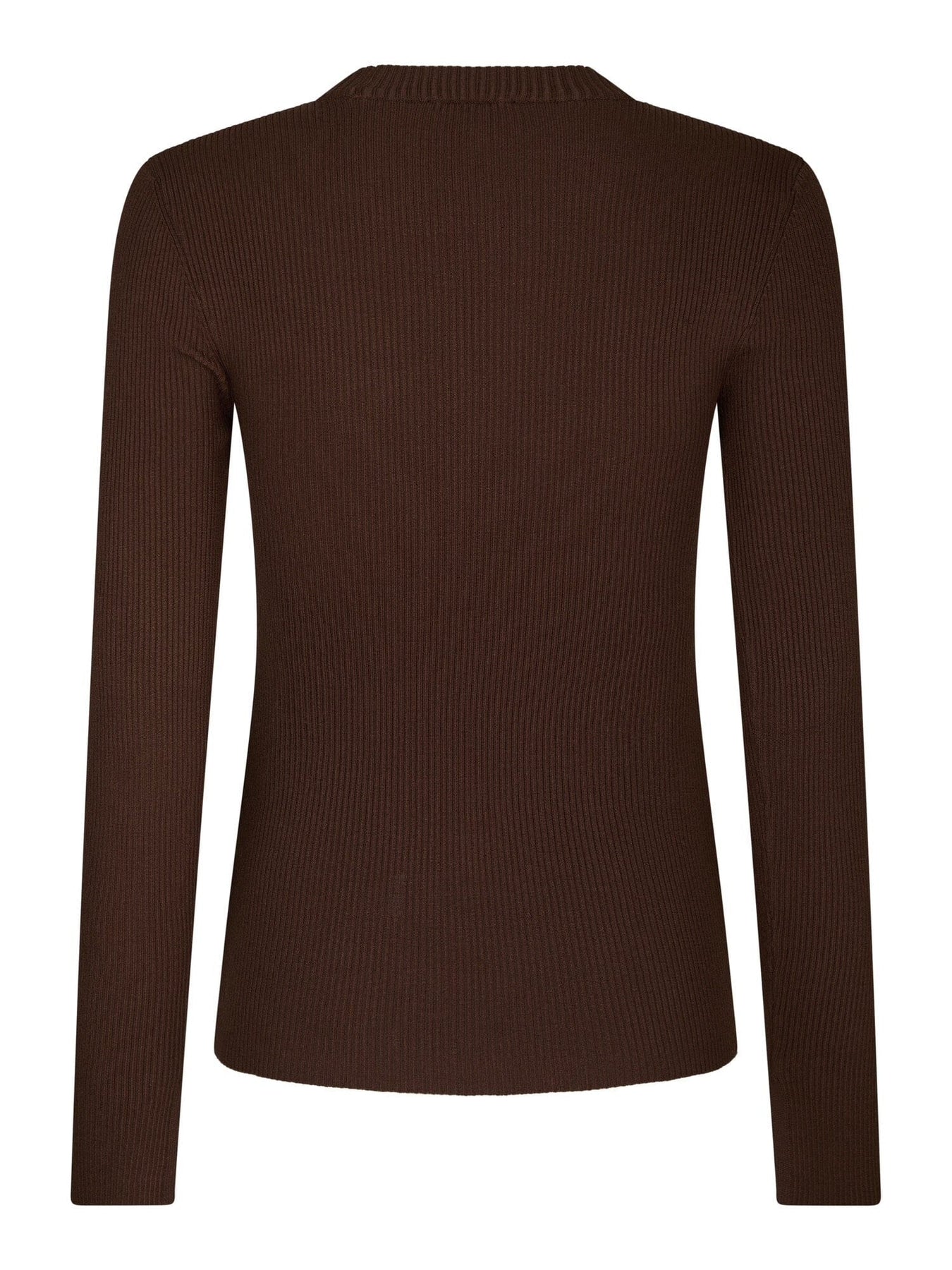 Mørkebrun strikkegenser fra Valentin Studio med tynnstrikket tekstur. Genseren har en tettsittende passform og dekorative gullknapper på skuldrene, som gir et fint løft.