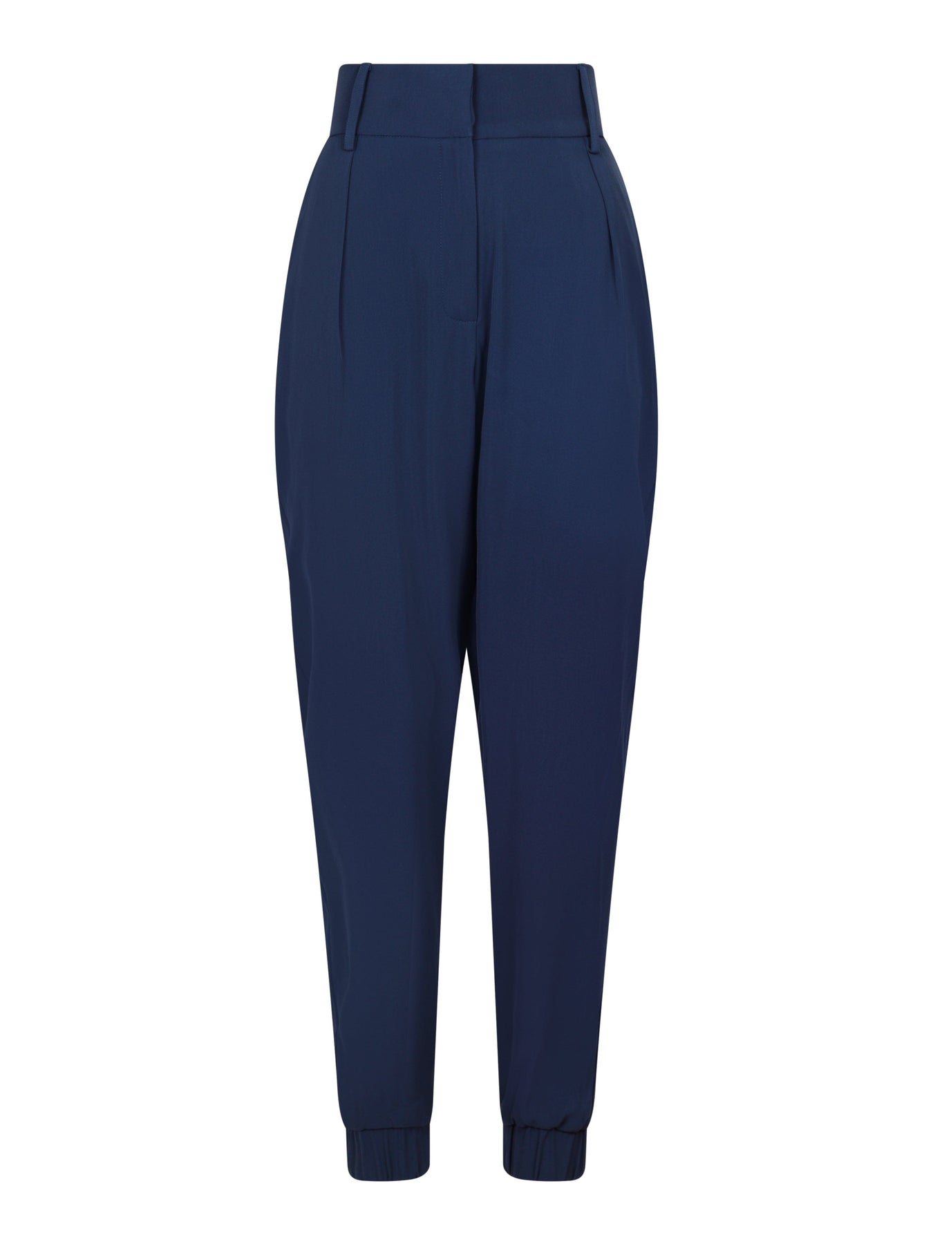 Mørkeblå bukser fra Valentin Studio med draperinger foran og elastikk i livet. Buksene har praktiske forlommer og dekorative baklommer som gir dem et avslappet uttrykk.