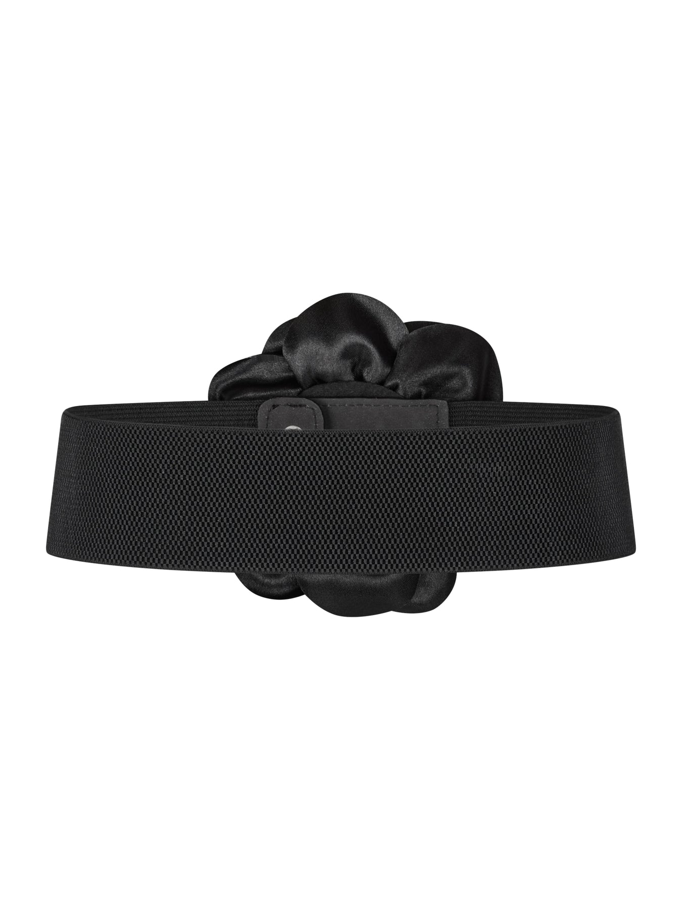 Svart belte fra Valentin Studio med en stor rose-lignende pynt foran. Beltet har et bredt design og en svart farge som gjør det enkelt å style til forskjellige antrekk.