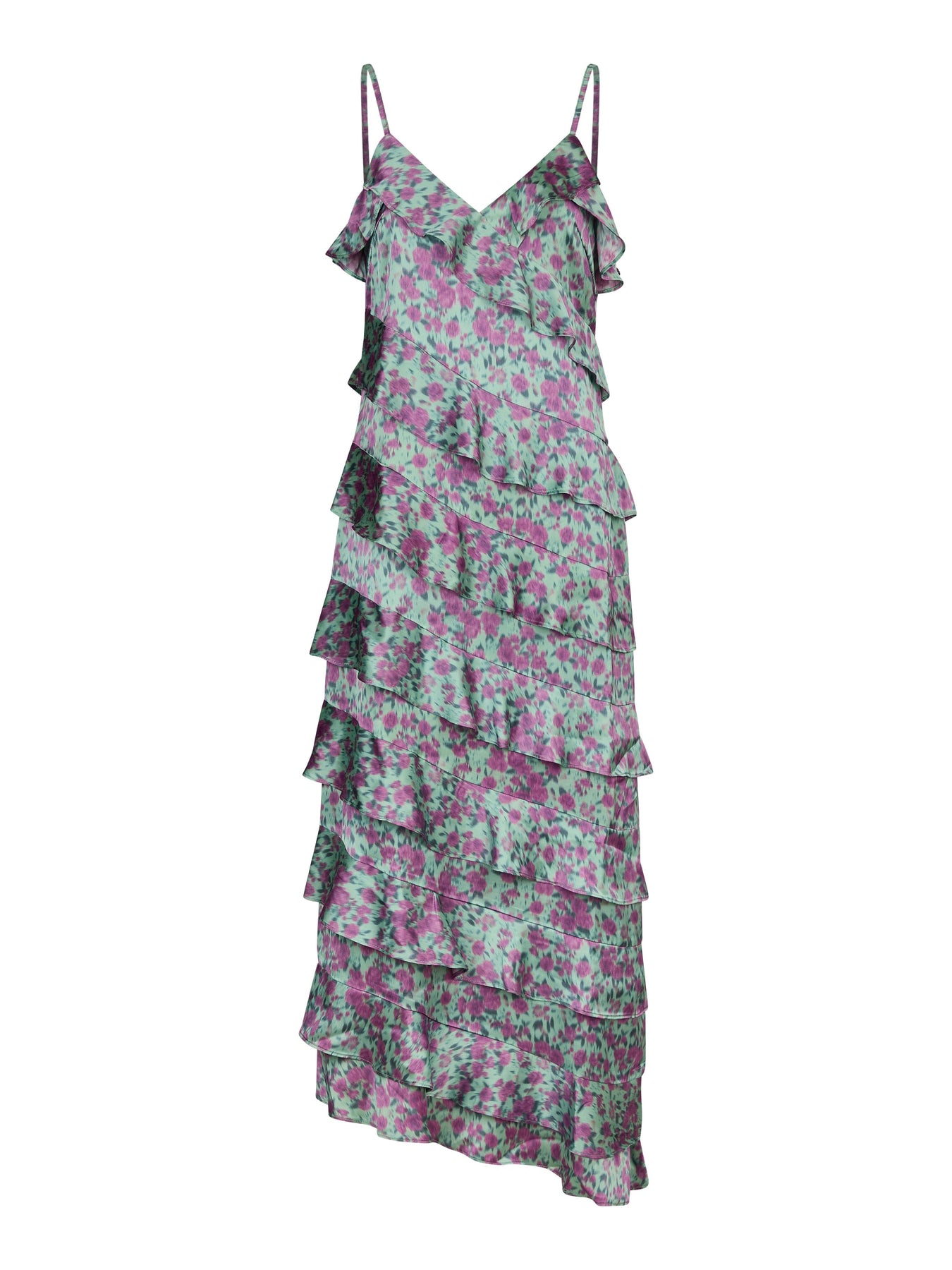 Kjole fra Valentin Studio med turkis blomstermønster og lilla samt grønne detaljer. Kjolen har flæselag fra topp til bunn og en V-halsutskjæring med spaghetti-stropper.